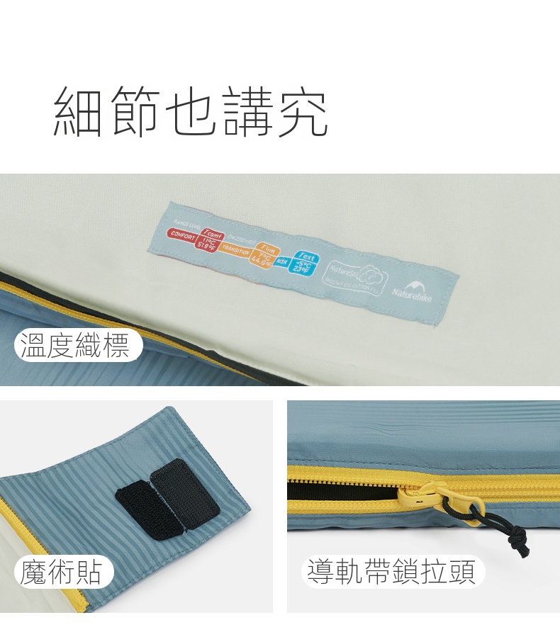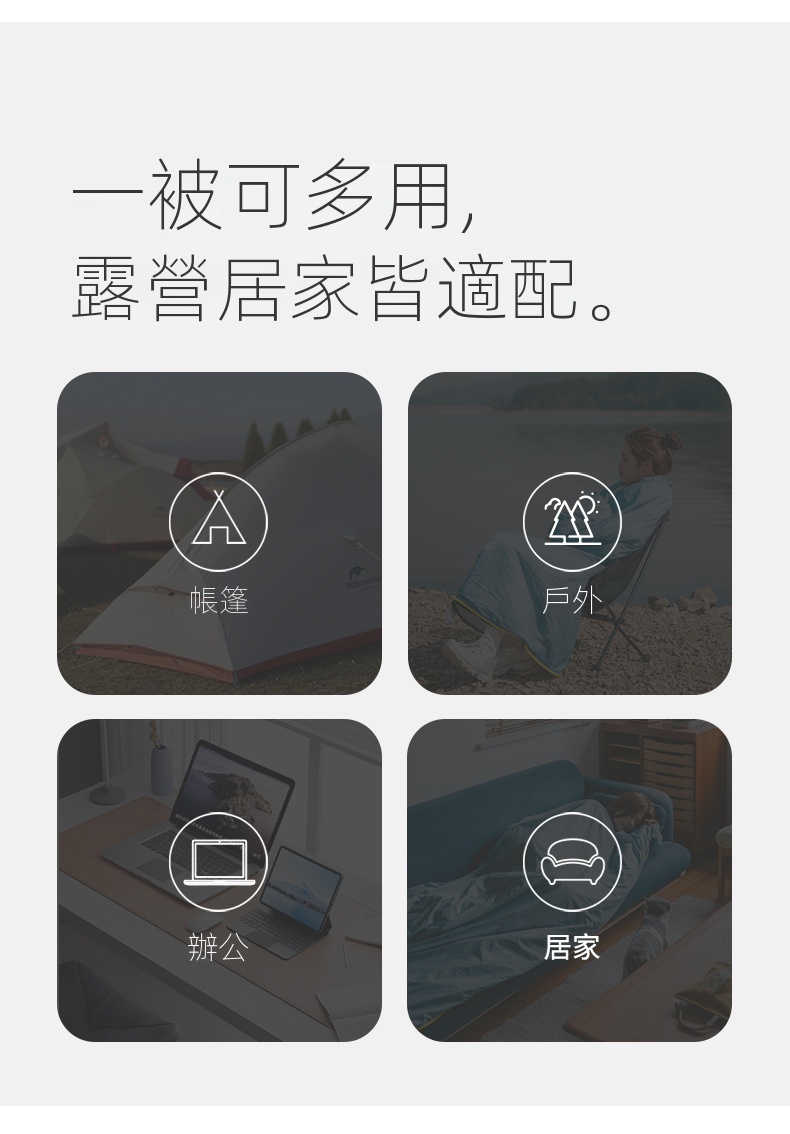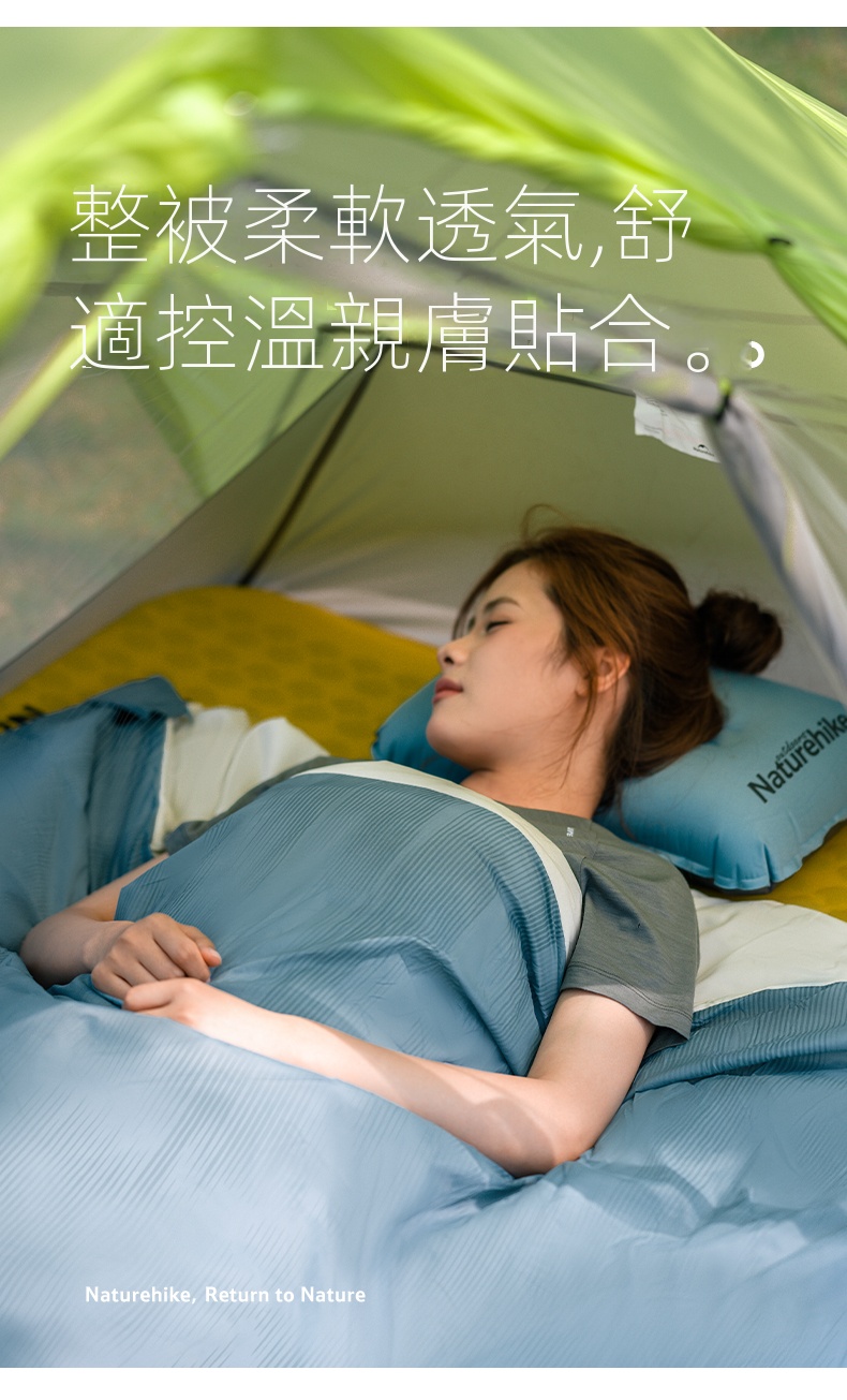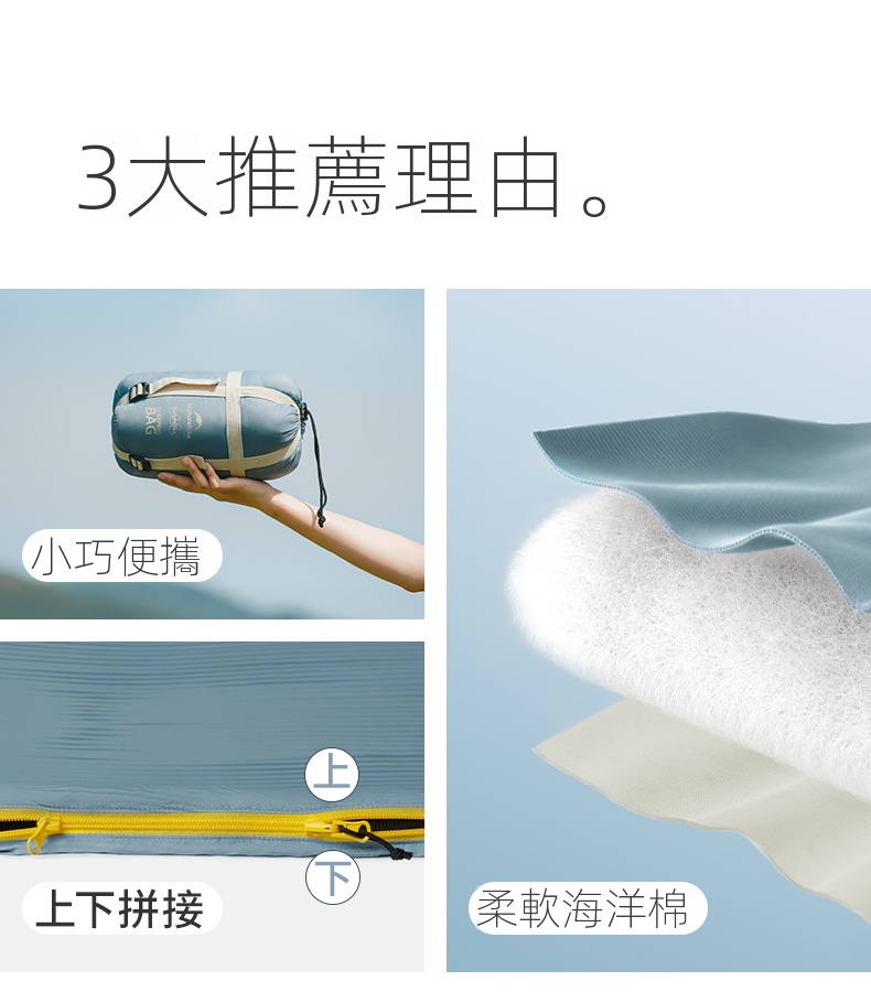 Naturehike NatureSea 瀾影成人戶外露營輕量化睡袋,採用柔軟海洋棉填充,搭配20D環保尼龍面料與春亞紡里料,親膚透氣,整夜舒適好眠。上下拼接設計可靈活組合,展開即為軟被蓋毯,適合露營、戶外、居家多種場景使用。具備腳部拉鏈設計,提升散熱透氣性,並通過甲醛安全檢測,環保安心。