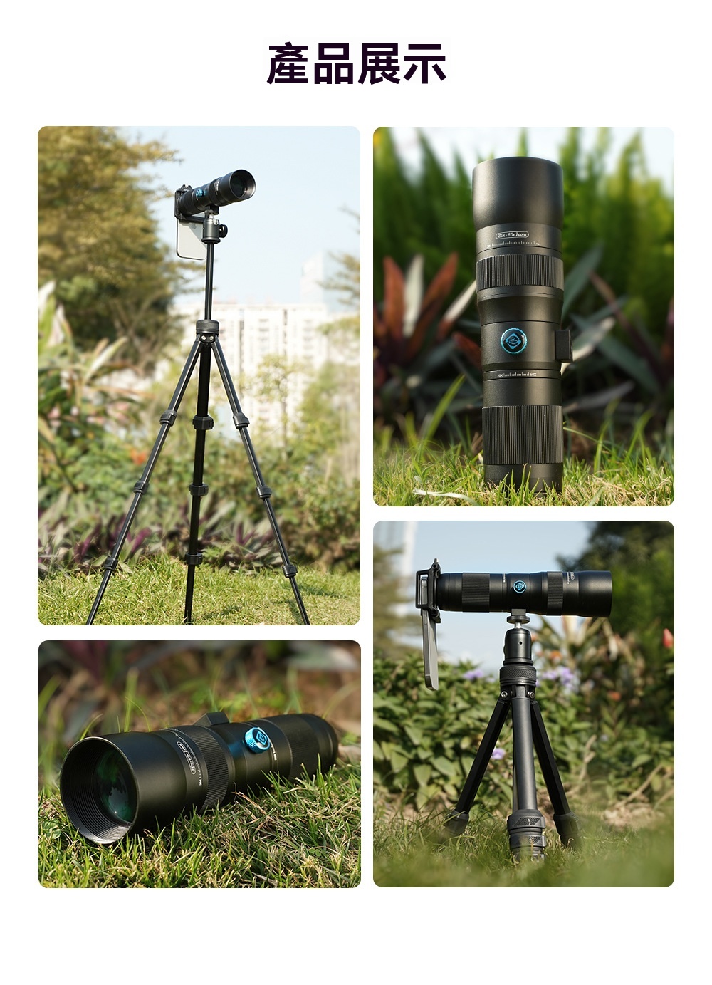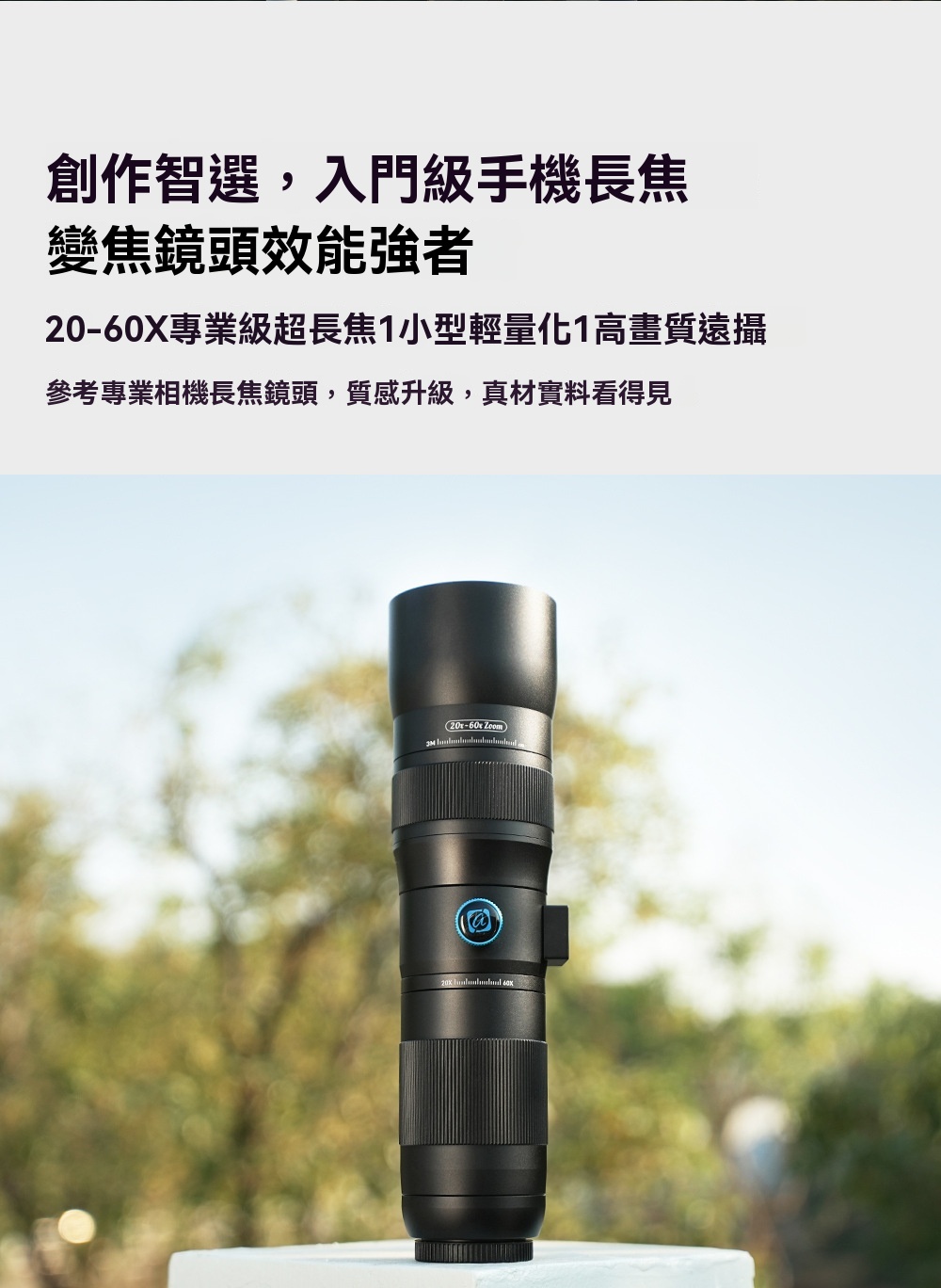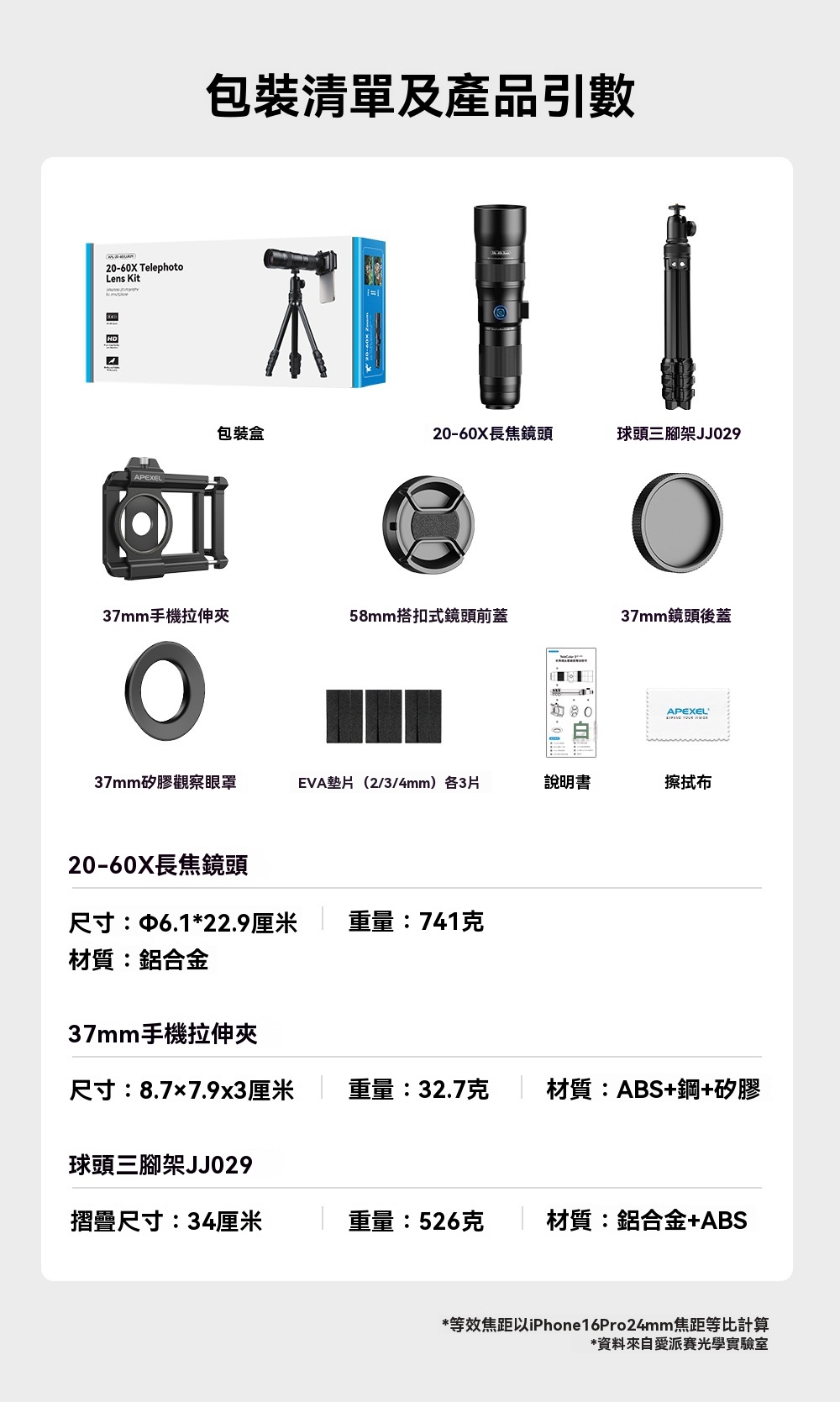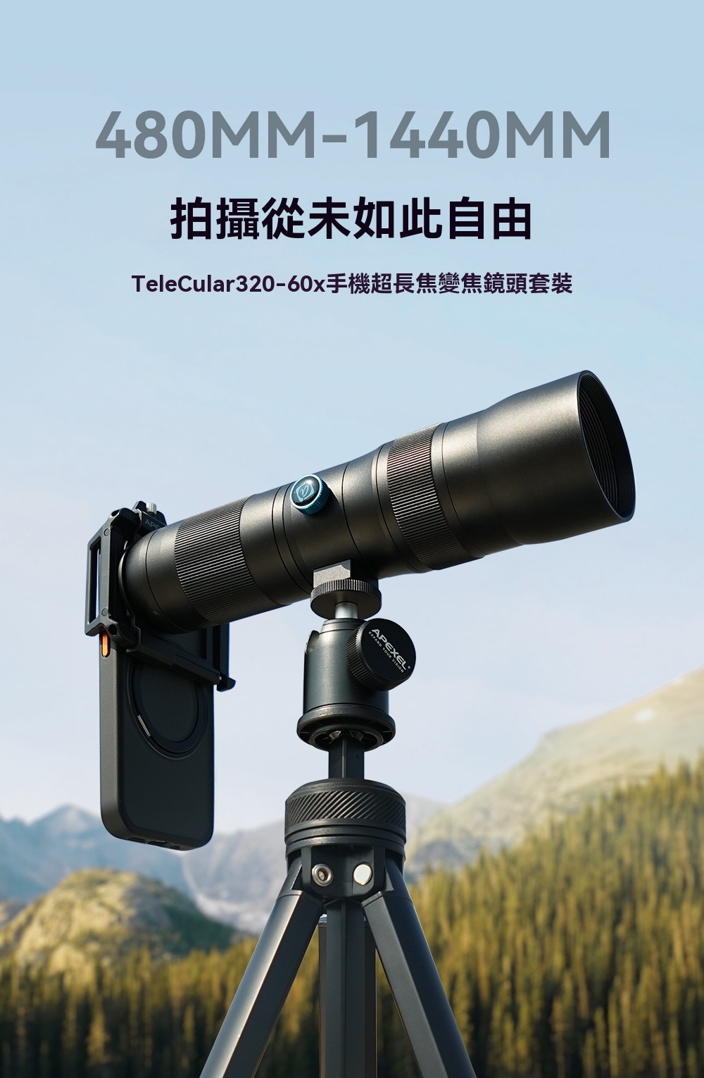 APEXEL 手機 20-60X 超長焦變焦鏡頭套裝,適配 98% 智慧型手機,含三腳架與通用夾子。採用 ABS、鋁與光學玻璃材質,10 組 13 片鏡片結構,透光率≥99.5%,畸變率≤4%,具備防水、防塵、防霧功能,等效焦距 480mm-1440mm,對焦距離超 3 公尺。支援 20-60X 無極變焦,可清晰捕捉遠距細節,適用於觀鳥、星象觀測、野生動物攝影、演唱會拍攝等場景。升級款三腳架為鋁合金材質,重 600g 卻能承重 3kg,高度可調 47-137cm,還可搭配多種設備。鏡頭僅重 741g,搭配 φ58mm 螺紋接口,可接 UV、CPL 等濾鏡,為手機攝影拓展更多可能。