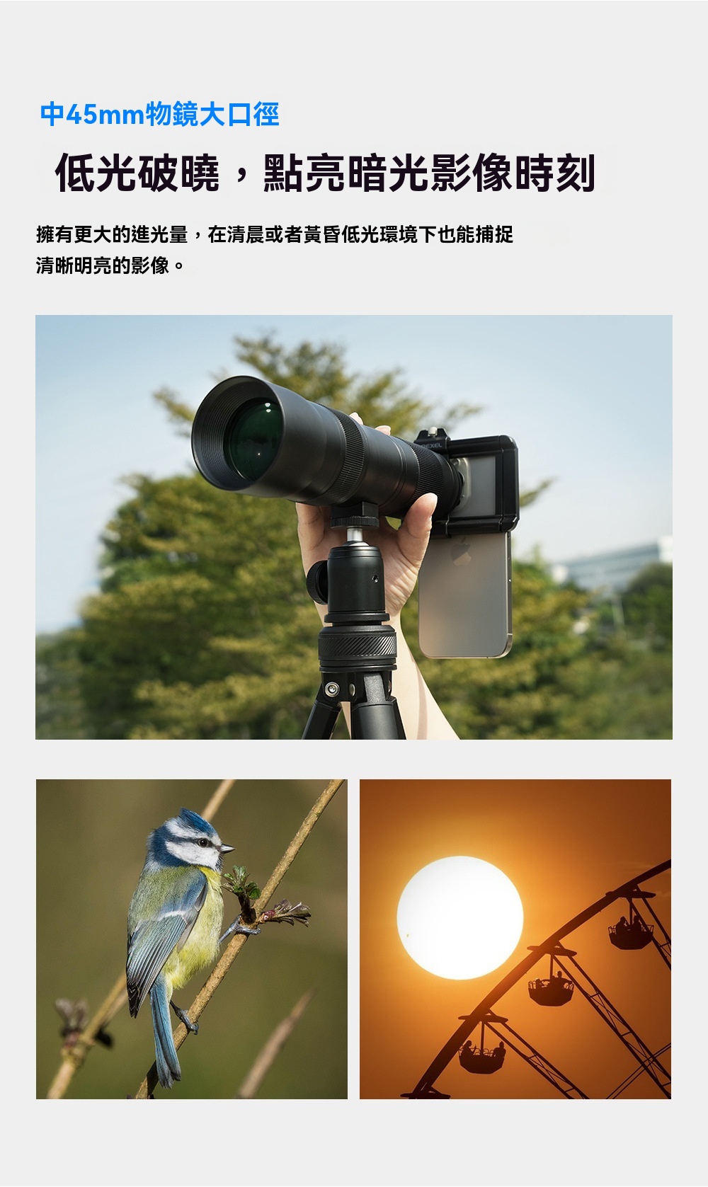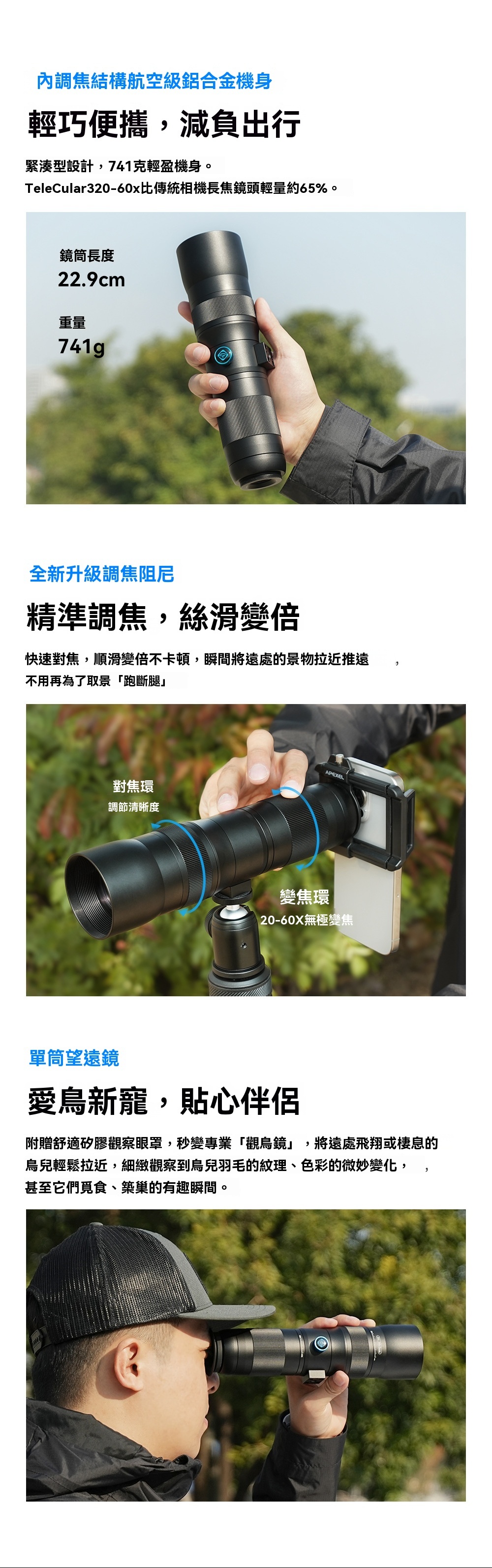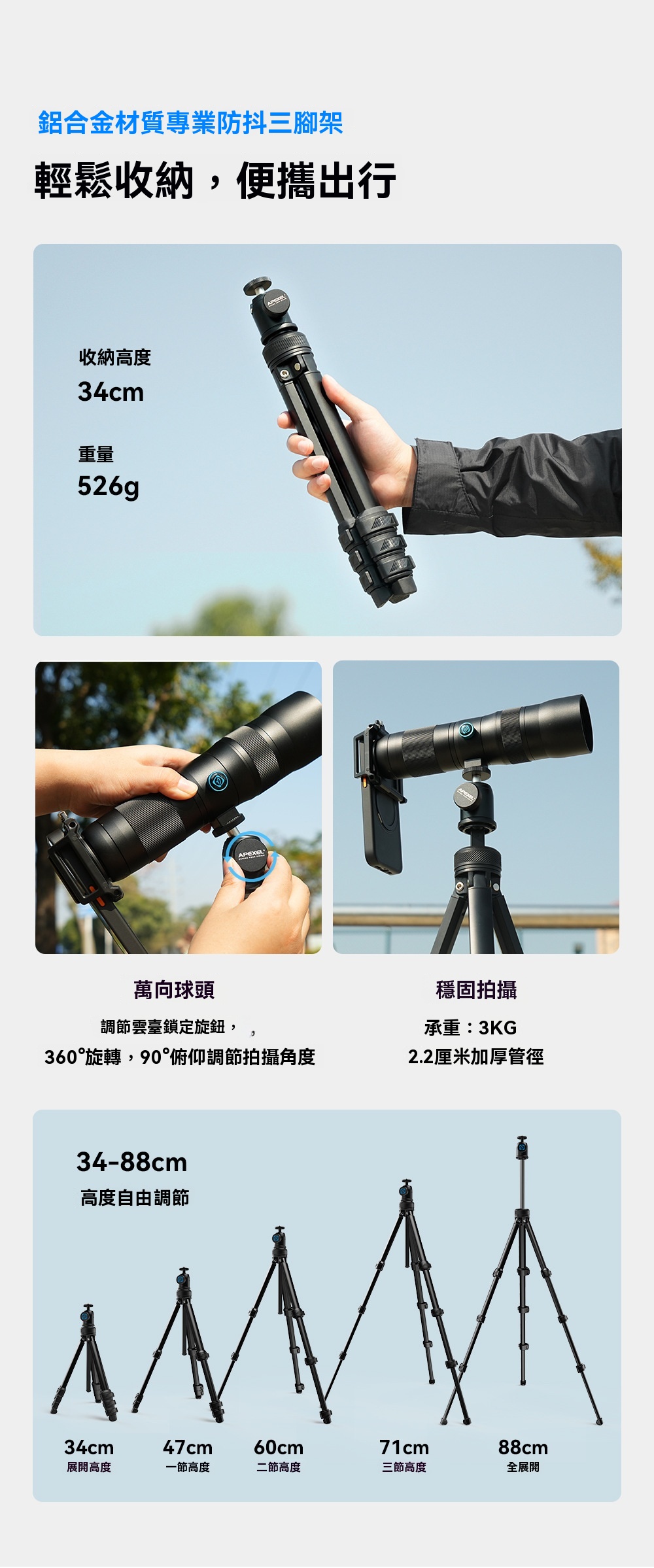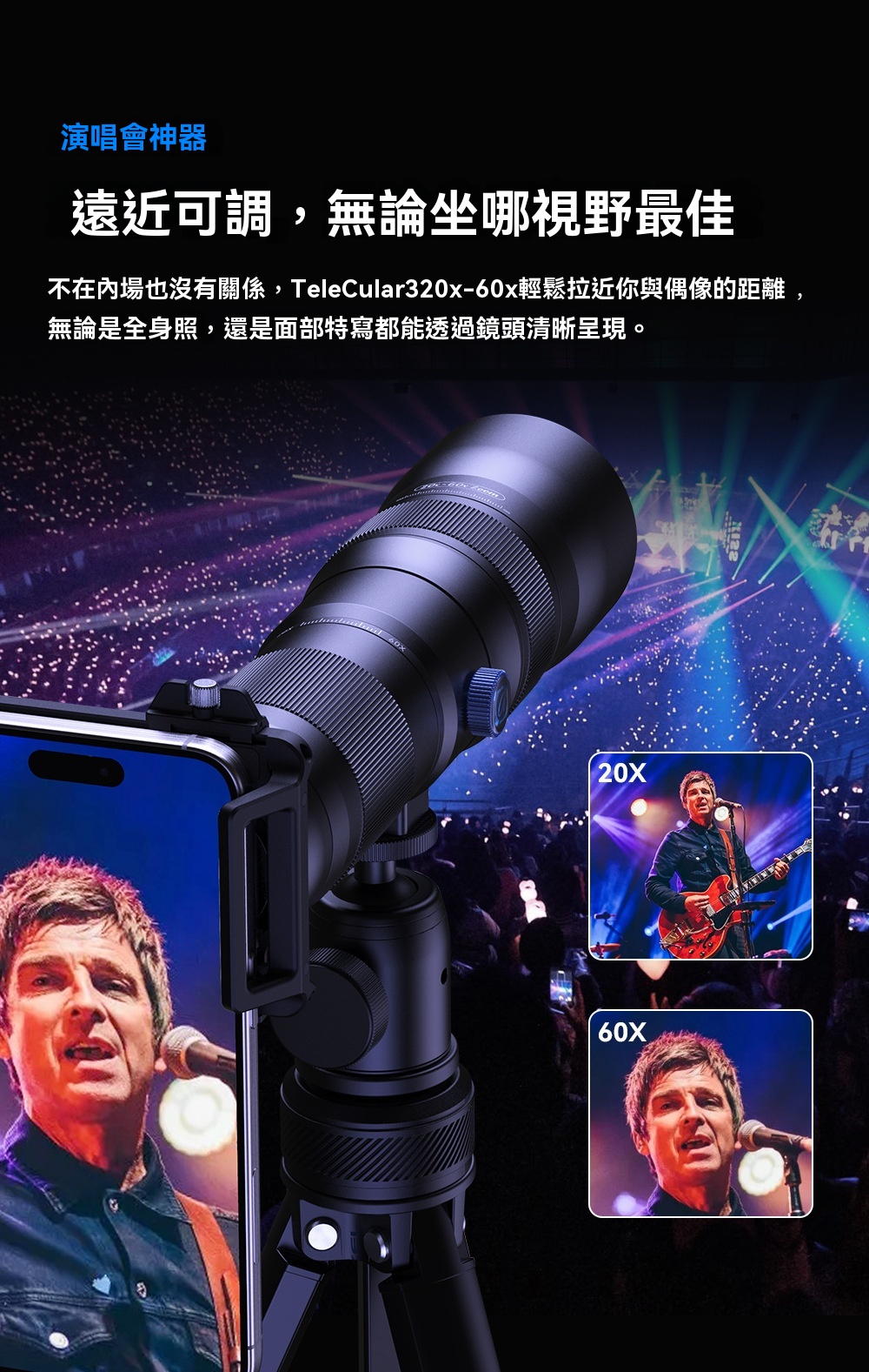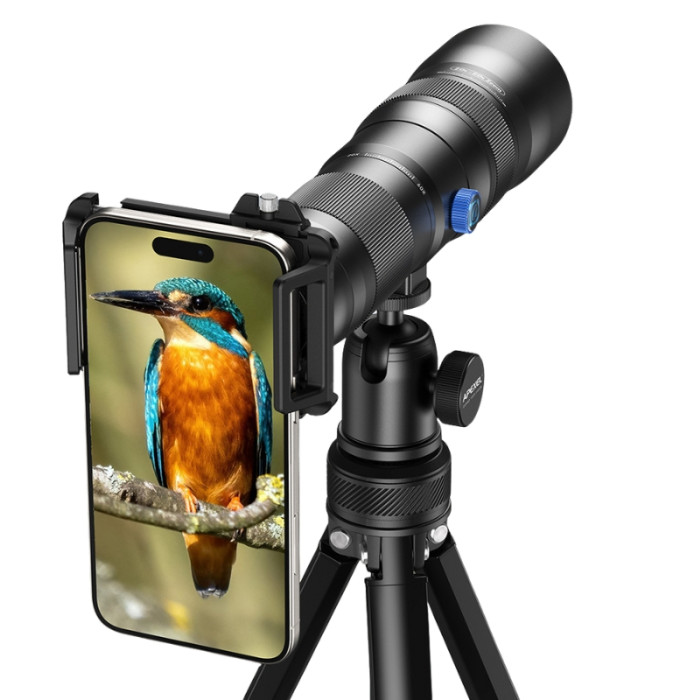 APEXEL 手機 20-60X 超長焦變焦鏡頭套裝,適配 98% 智慧型手機,含三腳架與通用夾子。採用 ABS、鋁與光學玻璃材質,10 組 13 片鏡片結構,透光率≥99.5%,畸變率≤4%,具備防水、防塵、防霧功能,等效焦距 480mm-1440mm,對焦距離超 3 公尺。支援 20-60X 無極變焦,可清晰捕捉遠距細節,適用於觀鳥、星象觀測、野生動物攝影、演唱會拍攝等場景。升級款三腳架為鋁合金材質,重 600g 卻能承重 3kg,高度可調 47-137cm,還可搭配多種設備。鏡頭僅重 741g,搭配 φ58mm 螺紋接口,可接 UV、CPL 等濾鏡,為手機攝影拓展更多可能。