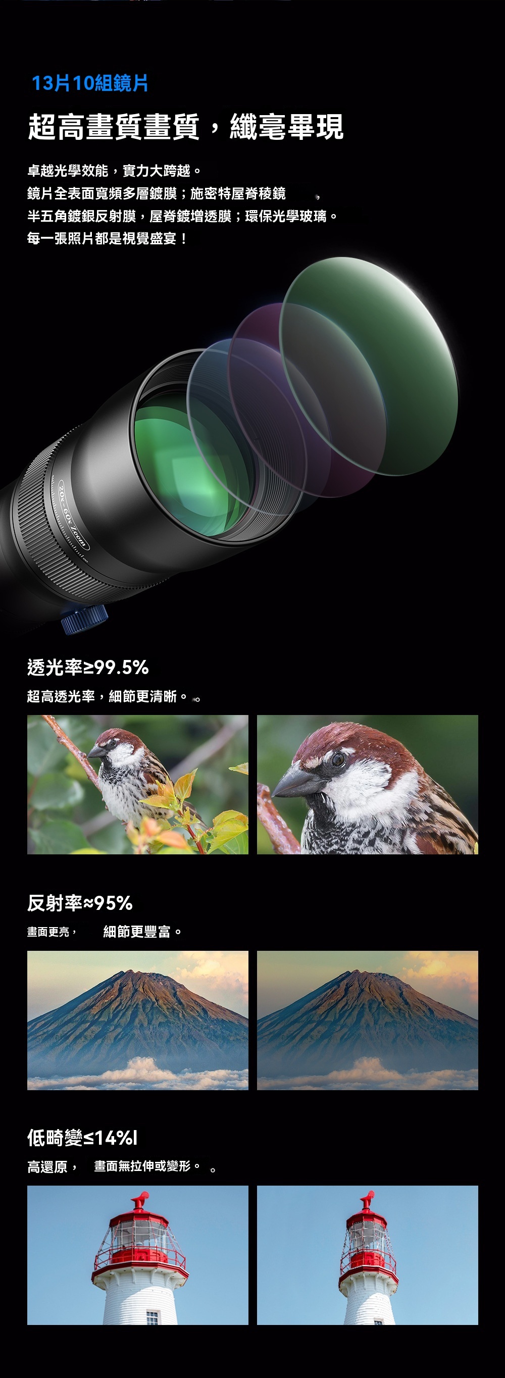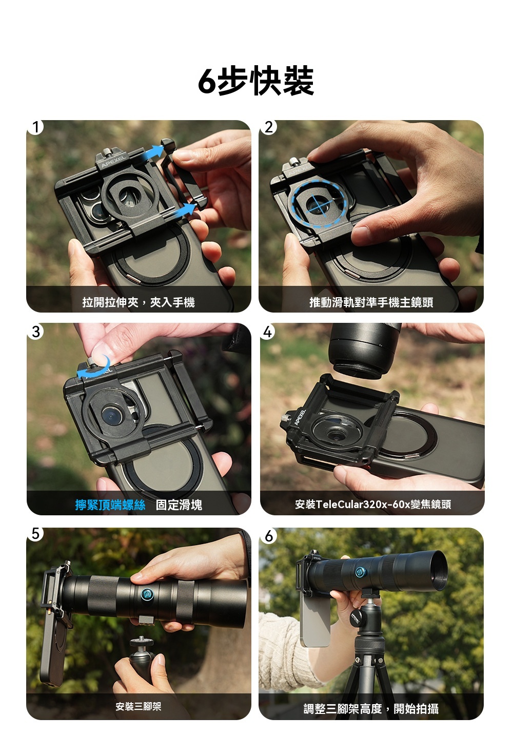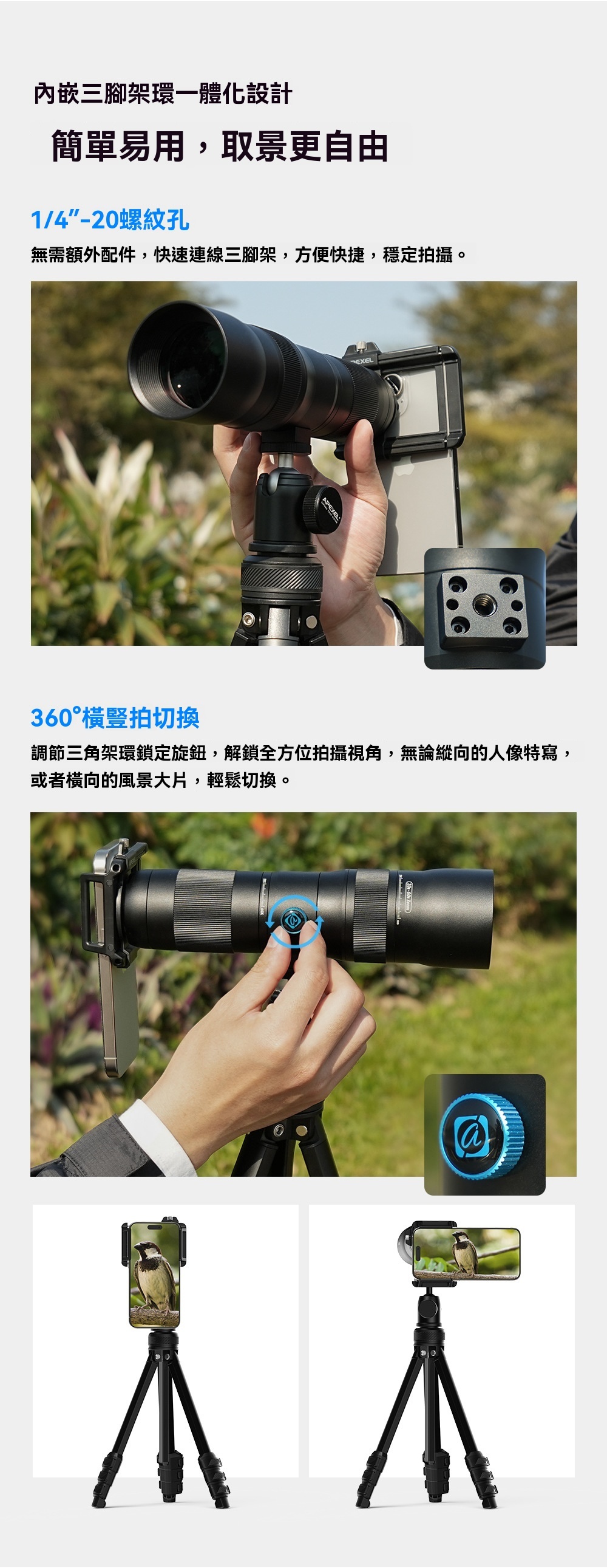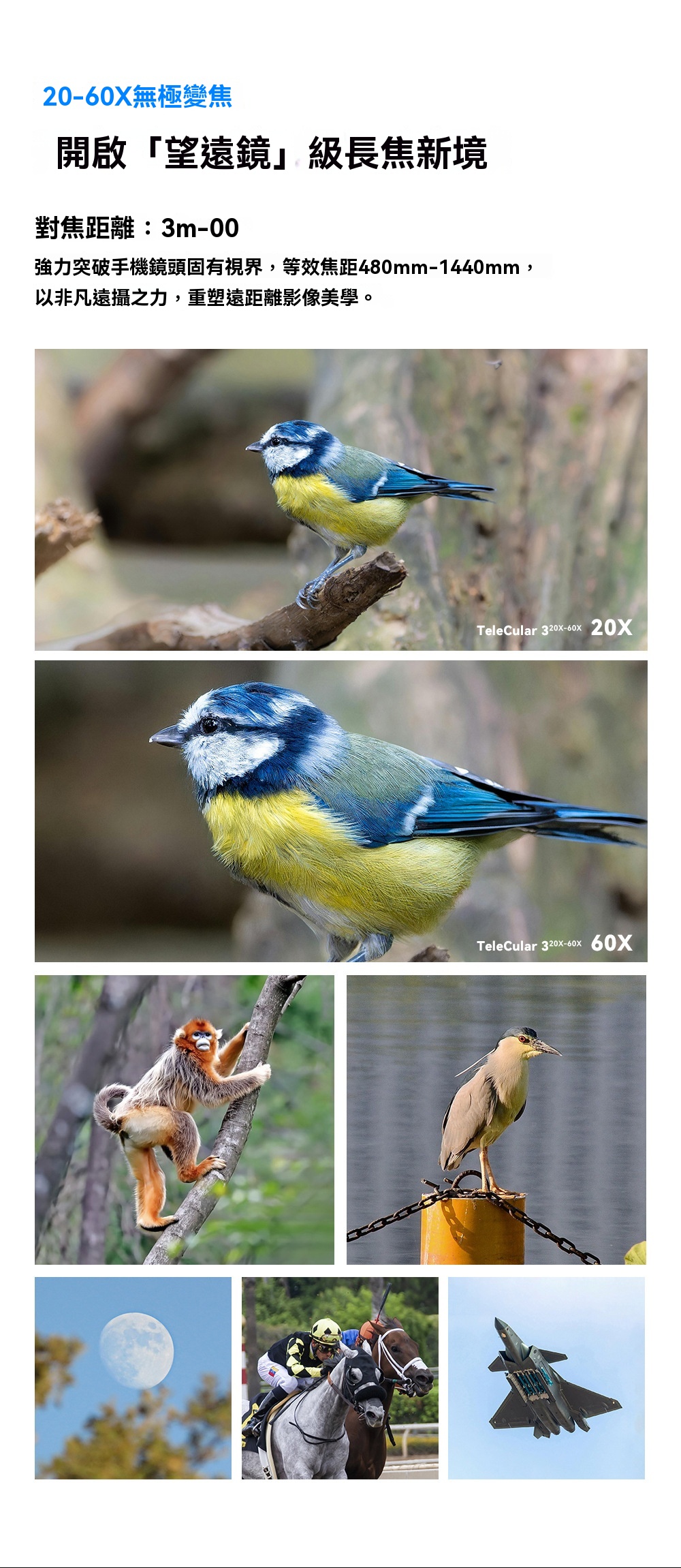 APEXEL 手機 20-60X 超長焦變焦鏡頭套裝,適配 98% 智慧型手機,含三腳架與通用夾子。採用 ABS、鋁與光學玻璃材質,10 組 13 片鏡片結構,透光率≥99.5%,畸變率≤4%,具備防水、防塵、防霧功能,等效焦距 480mm-1440mm,對焦距離超 3 公尺。支援 20-60X 無極變焦,可清晰捕捉遠距細節,適用於觀鳥、星象觀測、野生動物攝影、演唱會拍攝等場景。升級款三腳架為鋁合金材質,重 600g 卻能承重 3kg,高度可調 47-137cm,還可搭配多種設備。鏡頭僅重 741g,搭配 φ58mm 螺紋接口,可接 UV、CPL 等濾鏡,為手機攝影拓展更多可能。
