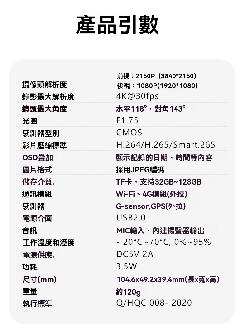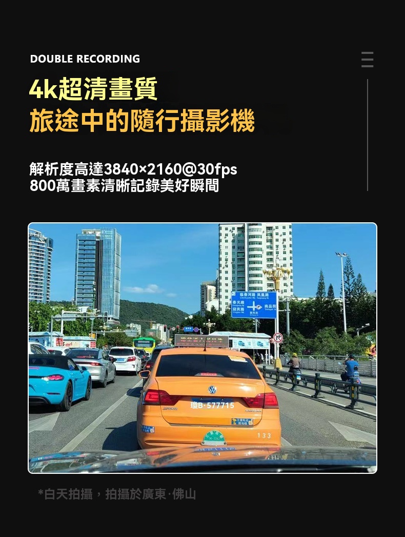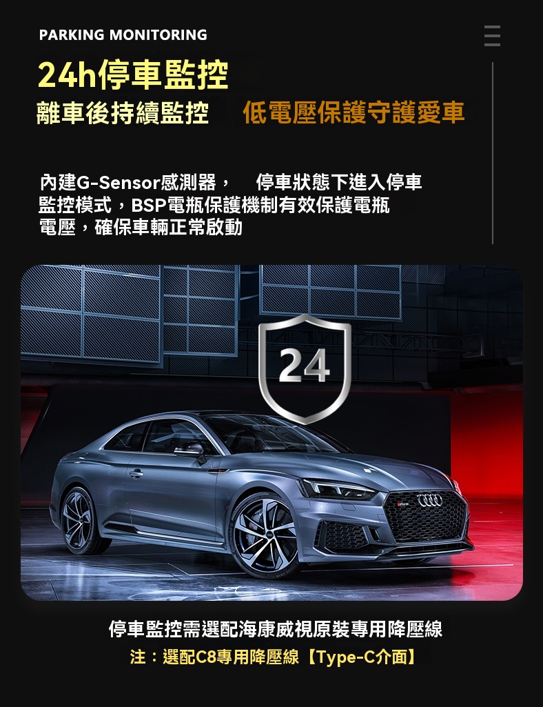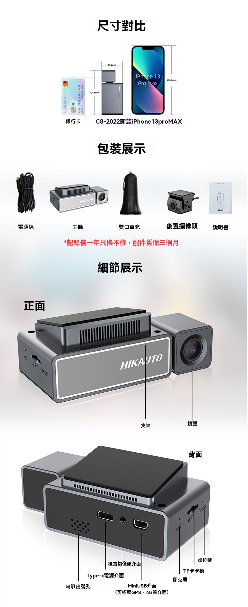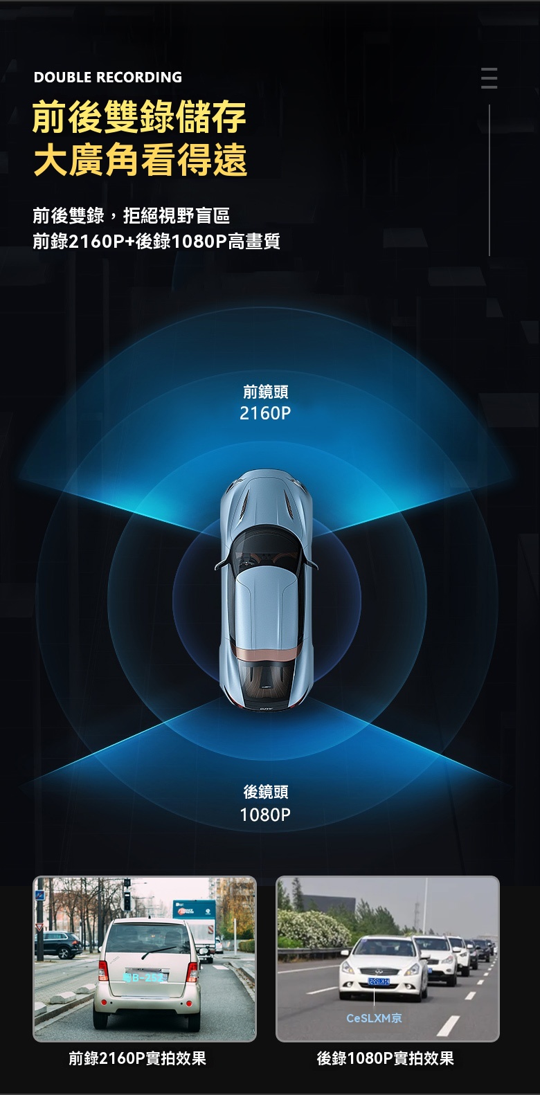 HIKVISION C8PRO 4K前後雙鏡頭行車記錄儀擁有4K超清畫質,分辨率達3840*2160(2160P),配備7組高清高透鏡片(首枚耐劃傷)、BLUEGLASS消光鏡與圖像傳感器,搭配F1.75超大光圈和自研IP4.0圖像算法,極端環境下也能清晰拍攝車牌,136°廣角可覆蓋更廣視野。產品內置G-Sensor模組,碰撞或強烈碰撞時會聯動錄像且可設為不覆蓋;支持ADAS功能,包含「交通燈變綠」、「限速」「前啟動車提醒」。可連接海康慧眼App,通過WIFI高速查看、下載拍攝內容,搭配可選4G BOX,能實現遠程監控、視頻下載及行車軌跡查看,最大支持256GB MicroSD卡擴展存儲,滿足多樣使用需求。