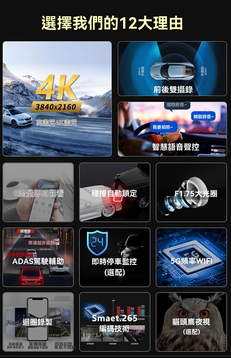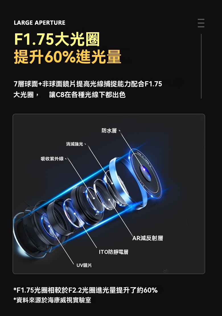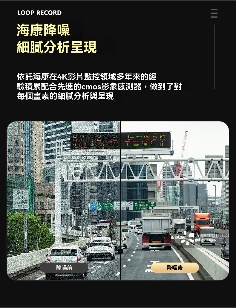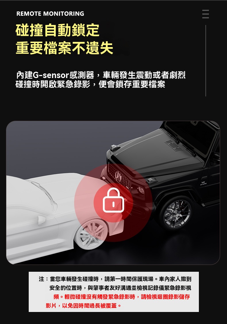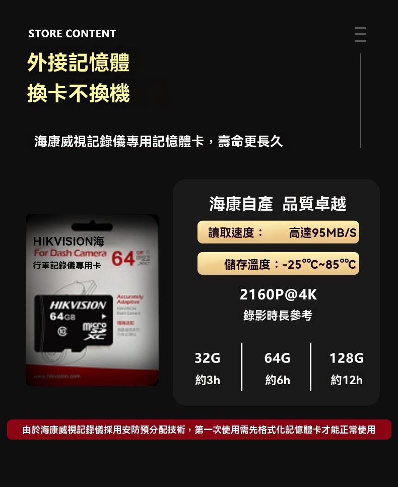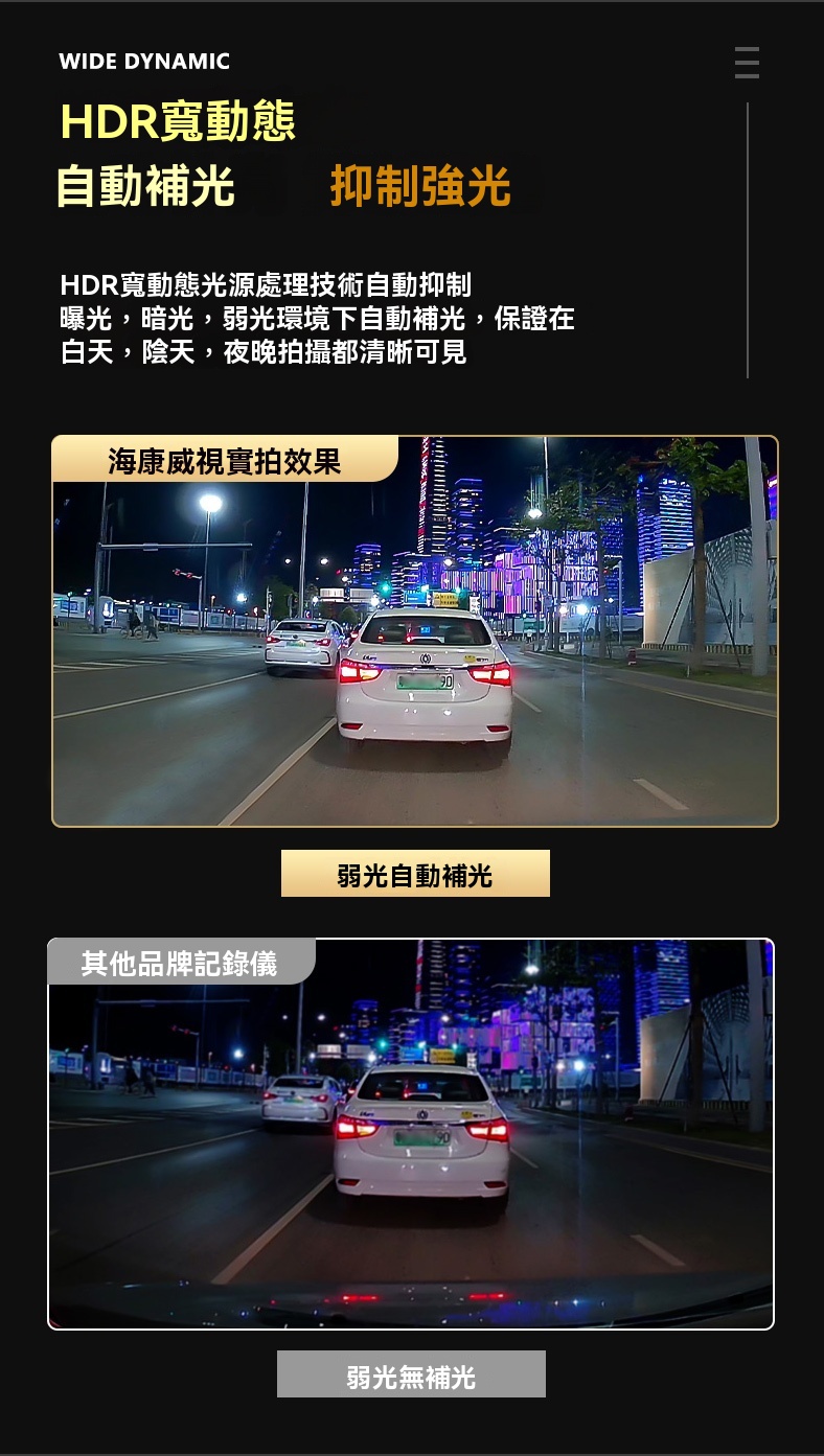 HIKVISION C8PRO 4K前後雙鏡頭行車記錄儀擁有4K超清畫質,分辨率達3840*2160(2160P),配備7組高清高透鏡片(首枚耐劃傷)、BLUEGLASS消光鏡與圖像傳感器,搭配F1.75超大光圈和自研IP4.0圖像算法,極端環境下也能清晰拍攝車牌,136°廣角可覆蓋更廣視野。產品內置G-Sensor模組,碰撞或強烈碰撞時會聯動錄像且可設為不覆蓋;支持ADAS功能,包含「交通燈變綠」、「限速」「前啟動車提醒」。可連接海康慧眼App,通過WIFI高速查看、下載拍攝內容,搭配可選4G BOX,能實現遠程監控、視頻下載及行車軌跡查看,最大支持256GB MicroSD卡擴展存儲,滿足多樣使用需求。