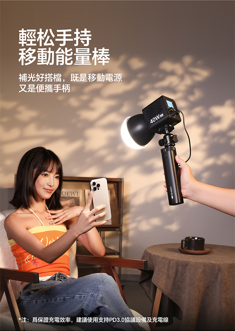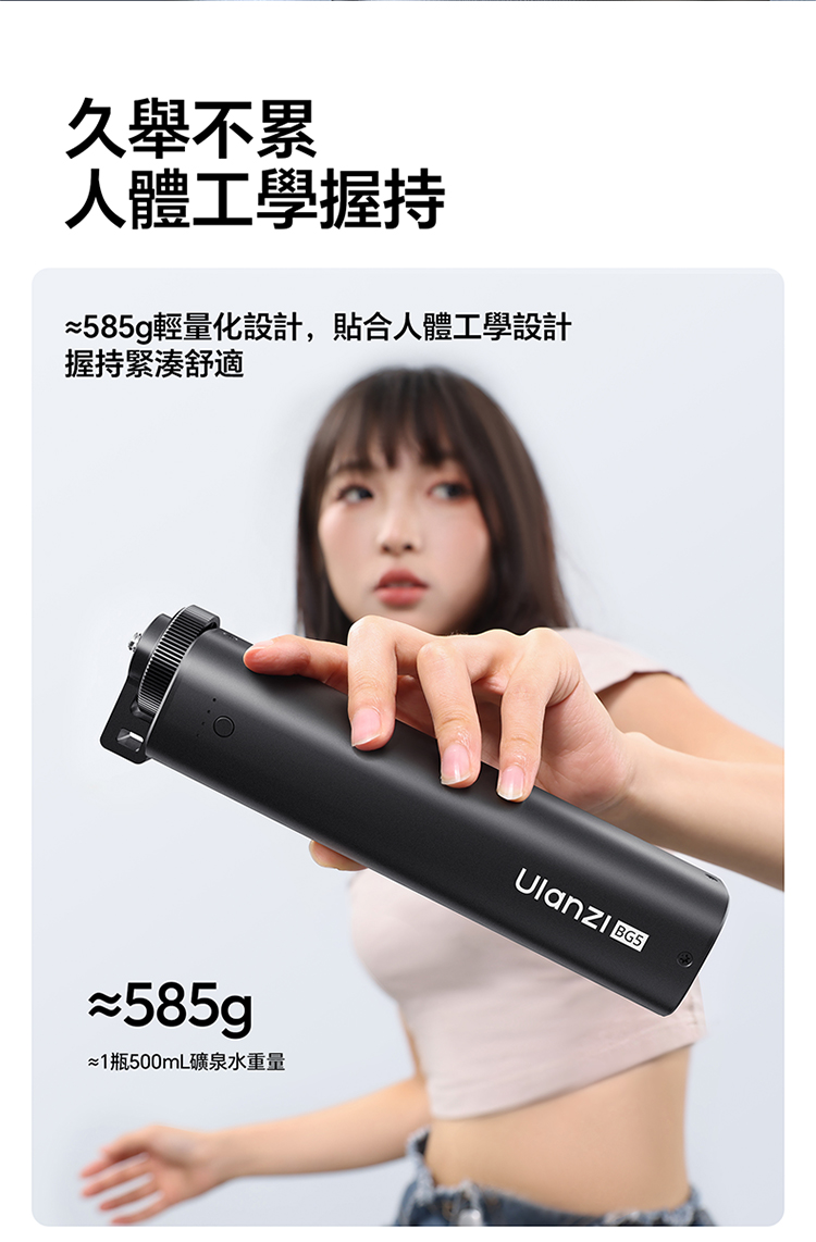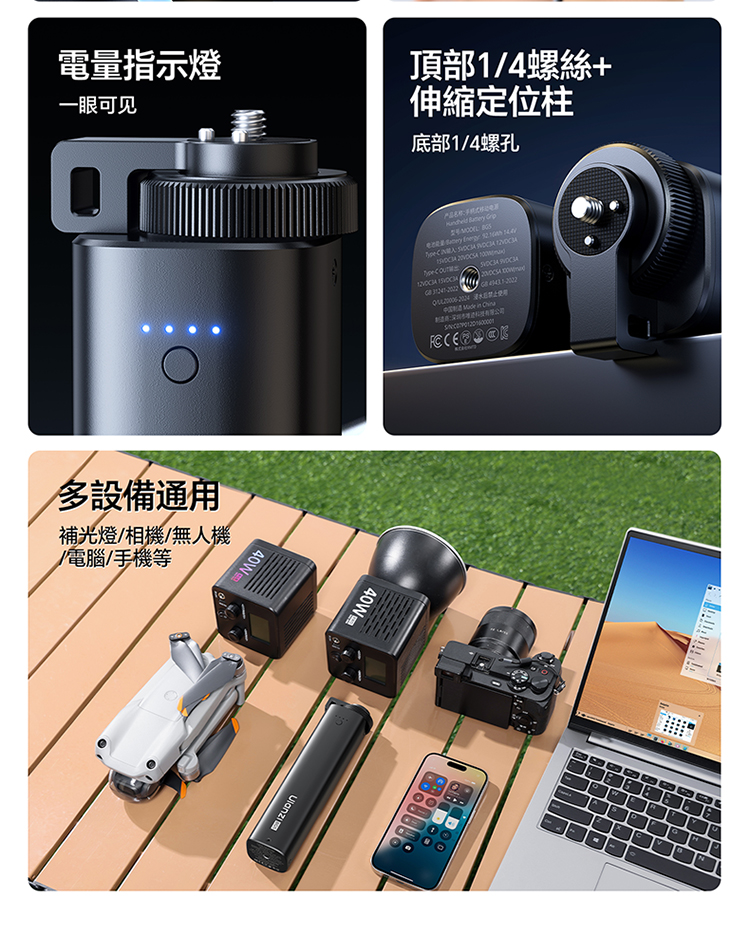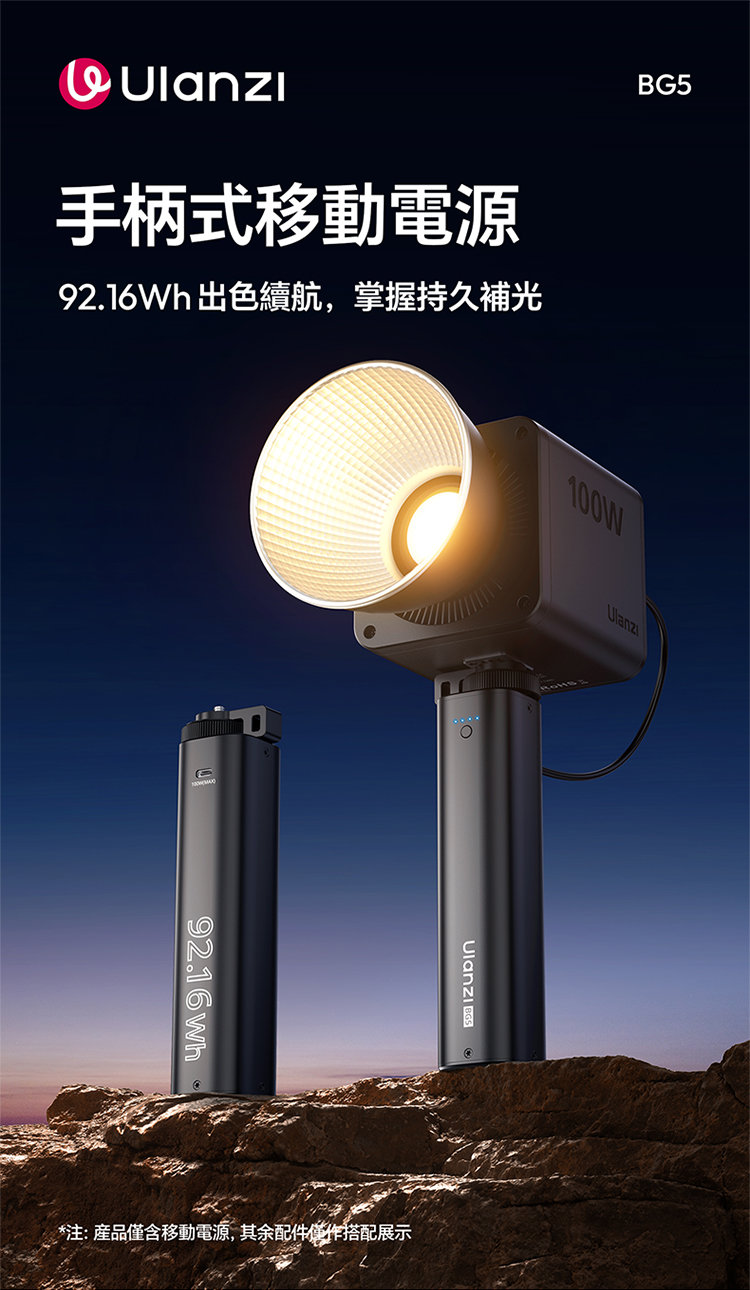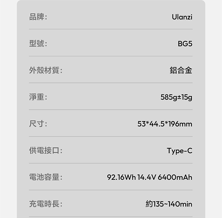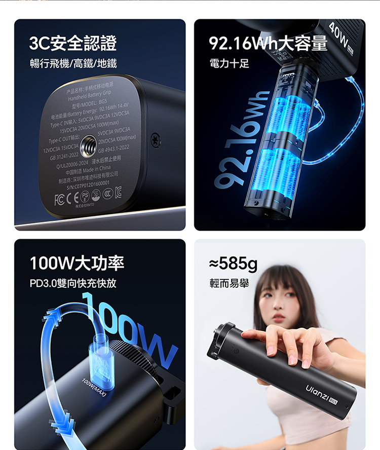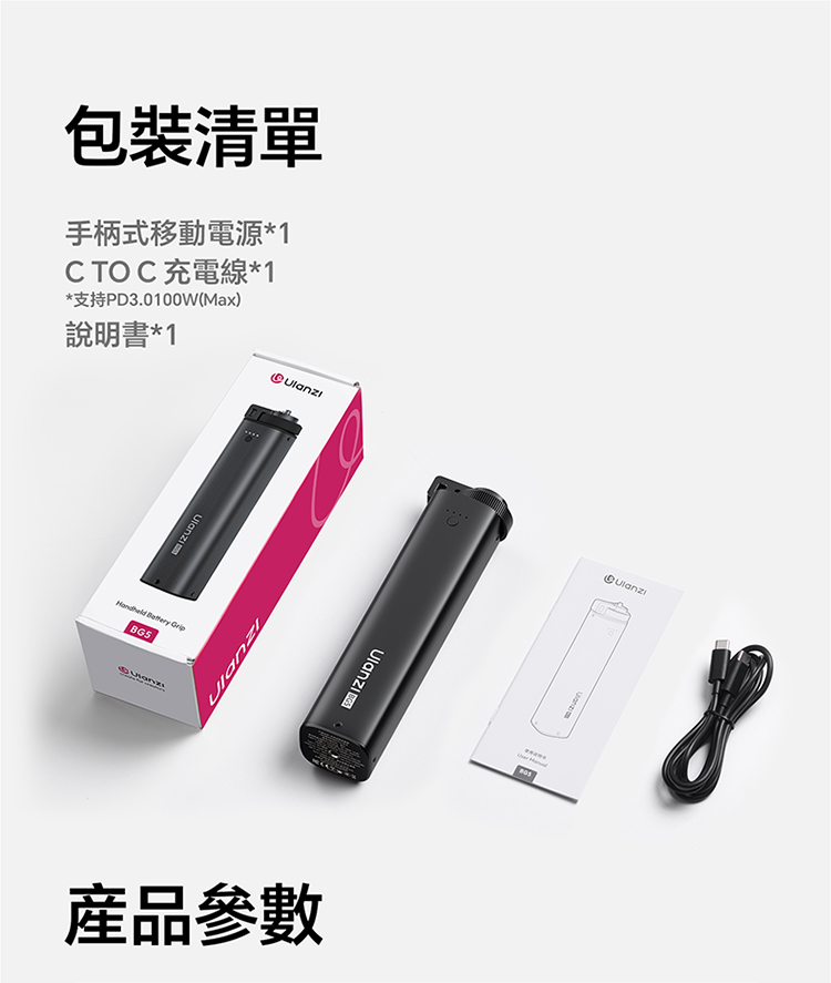 戶外拍攝怕斷電? ULANZI BG5 手把式行動電源,集人體工學把手與高容量充電寶於一體,是攝影愛好者、Vlogger 的必備續航力!它搭載 92.16Wh(14.4V 6400mAh)大容量電池,Type-C 介面支援 PD 3.0 協定 100W 雙向快充,約 135-140 分鐘即可滿電,可為 Ulanzi C01、EC65 等補光燈供電,100% 供電,可為 Ulanzi C01、EC65 等補光燈供電,100% 供電需求時間。機身僅約 585g,握感舒適不疲勞,便攜易收納,符合航空攜帶標準,出差旅行無壓力。頂部 1/4 英吋螺絲與底部 1/4 英吋螺紋孔,可靈活連接相機、三腳架等配件,適配戶外攝影、影片製作、無人機拍攝等多場景。 LED 電量指示燈一鍵查看剩餘電量,3C、FCC 安全認證加持,使用更安心。套裝包含行動電源主體、USB-C 充電線及說明書,輕鬆解決續航焦慮,讓你專注創作不中斷!