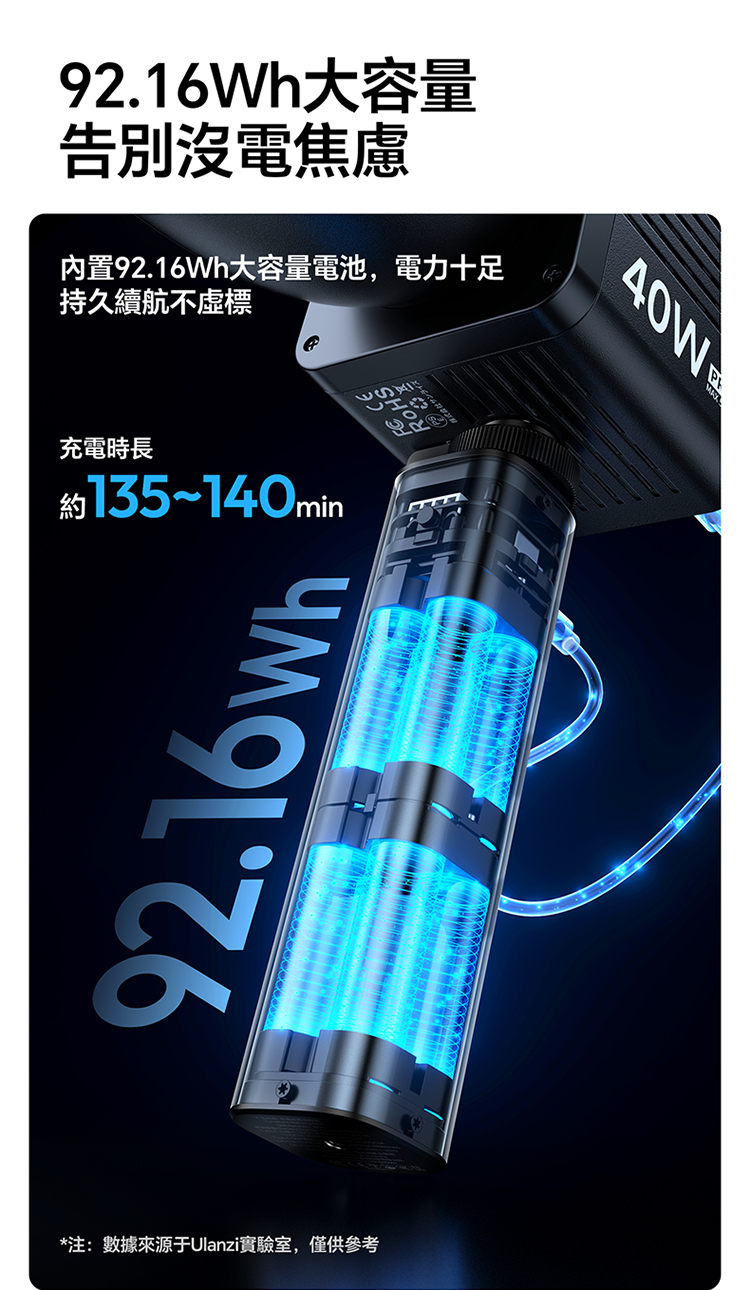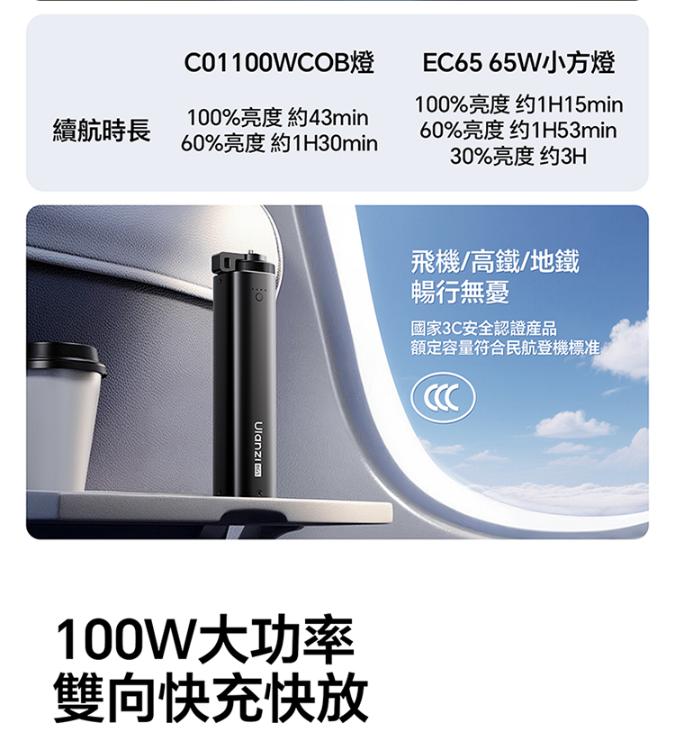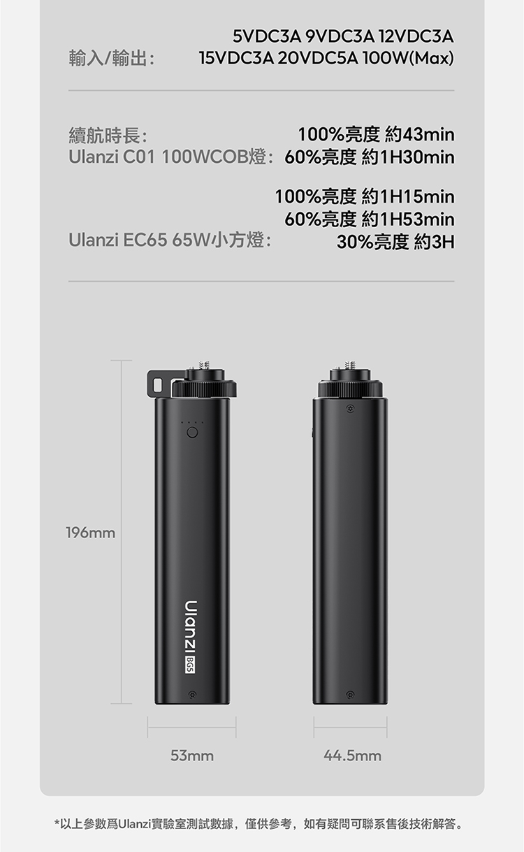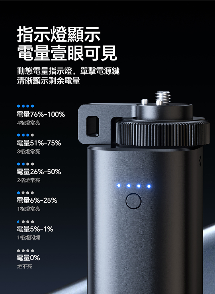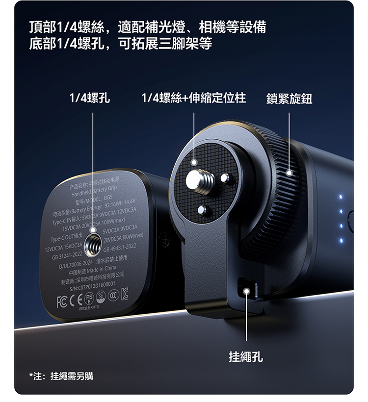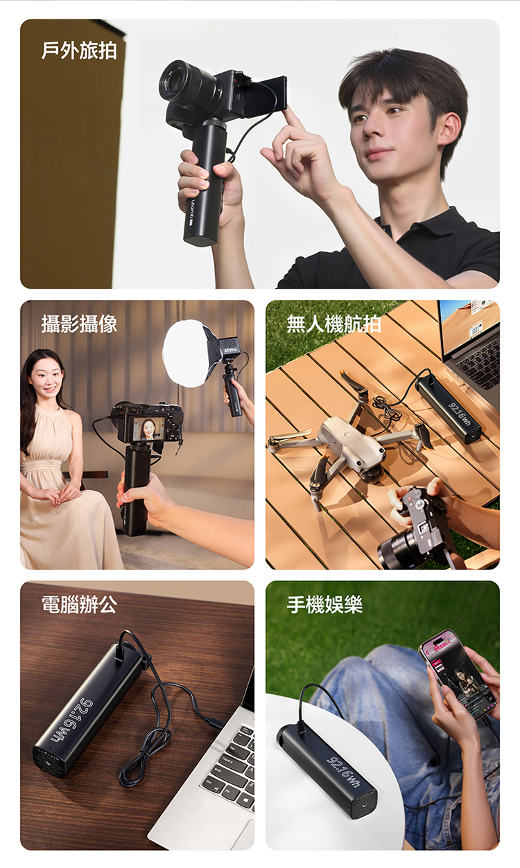 戶外拍攝怕斷電? ULANZI BG5 手把式行動電源,集人體工學把手與高容量充電寶於一體,是攝影愛好者、Vlogger 的必備續航力!它搭載 92.16Wh(14.4V 6400mAh)大容量電池,Type-C 介面支援 PD 3.0 協定 100W 雙向快充,約 135-140 分鐘即可滿電,可為 Ulanzi C01、EC65 等補光燈供電,100% 供電,可為 Ulanzi C01、EC65 等補光燈供電,100% 供電需求時間。機身僅約 585g,握感舒適不疲勞,便攜易收納,符合航空攜帶標準,出差旅行無壓力。頂部 1/4 英吋螺絲與底部 1/4 英吋螺紋孔,可靈活連接相機、三腳架等配件,適配戶外攝影、影片製作、無人機拍攝等多場景。 LED 電量指示燈一鍵查看剩餘電量,3C、FCC 安全認證加持,使用更安心。套裝包含行動電源主體、USB-C 充電線及說明書,輕鬆解決續航焦慮,讓你專注創作不中斷!