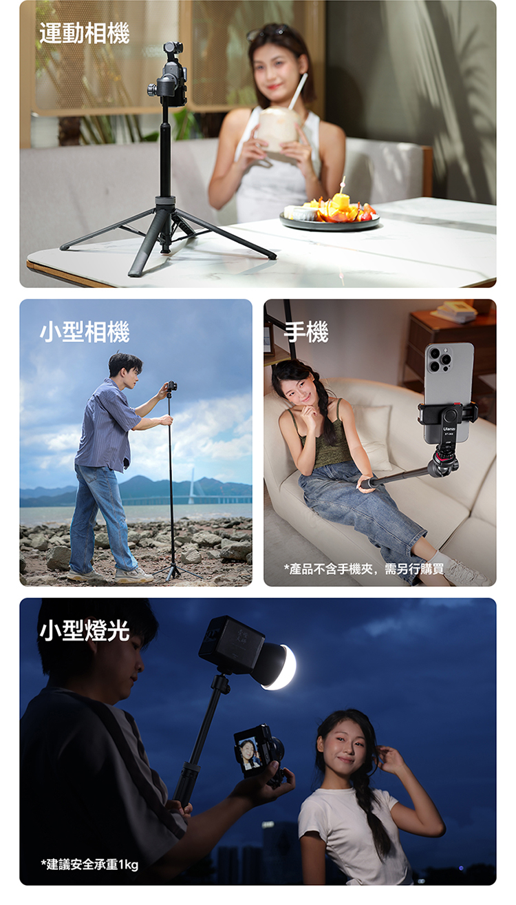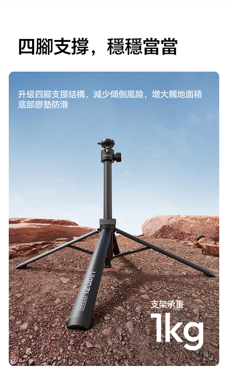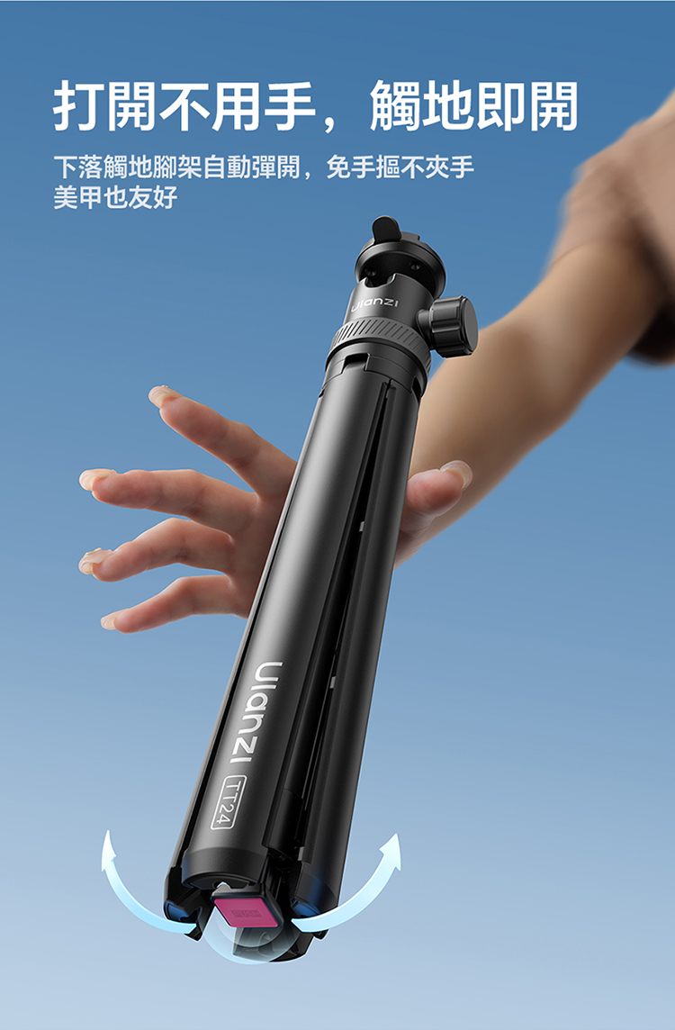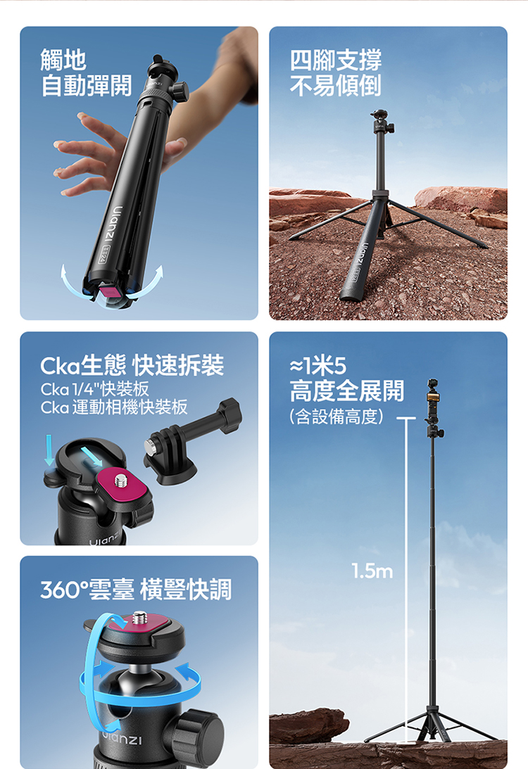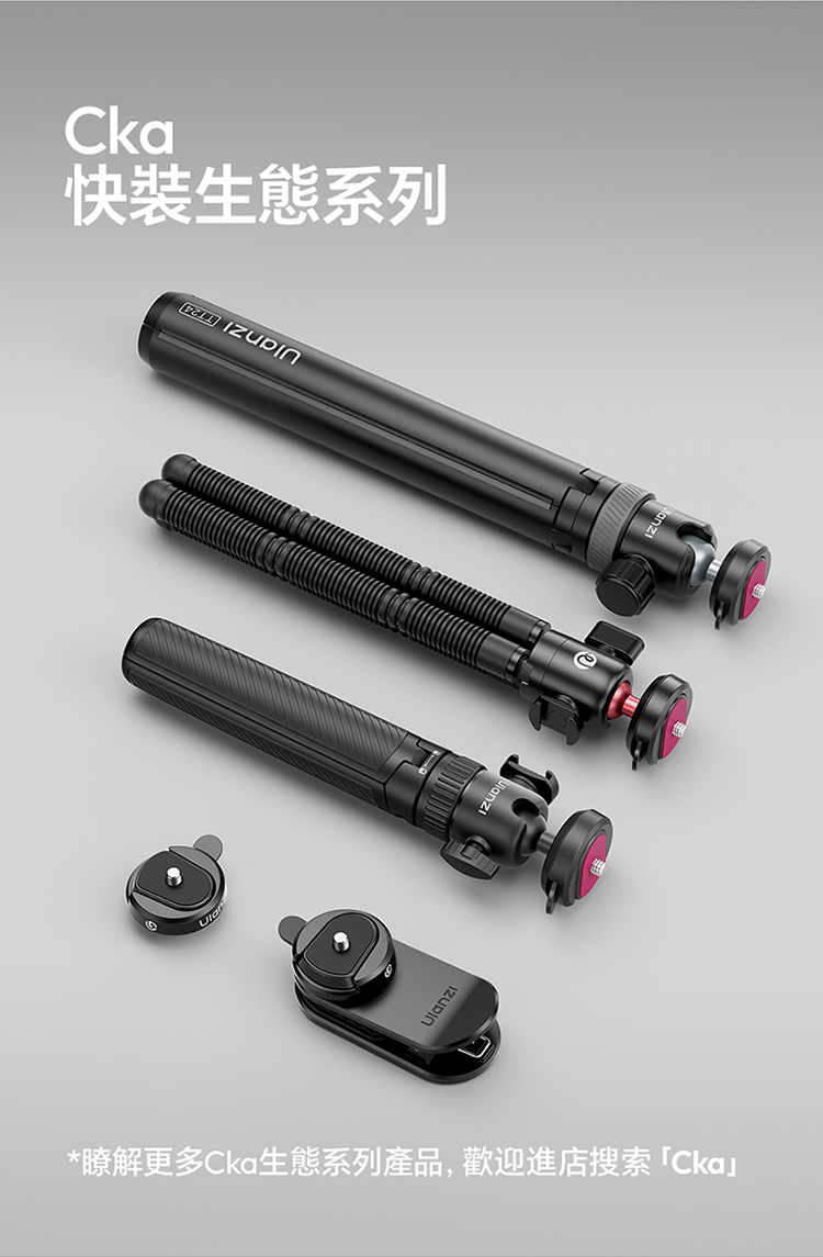 Ulanzi TT24 小火炬快開三腳架自拍棒(Cka 款)- 黑色,具備便利實用的核心特色。支援一鍵開啟設計,操作簡單,可快速切換至落地三腳架模式,滿足多種使用場景需求。其可延伸至 1.5M 長度,搭配手機夾,適配手機使用,同時也相容於大疆 pocket3 運動攝影機、action4、5pro 等設備,適用範圍廣。產品兼顧手持與落地支撐功能,無論是日常自拍、vlog 拍攝,或是戶外記錄,都能提供穩定支撐,為拍攝帶來便利,是兼顧實用性與相容性的拍攝輔助工具。