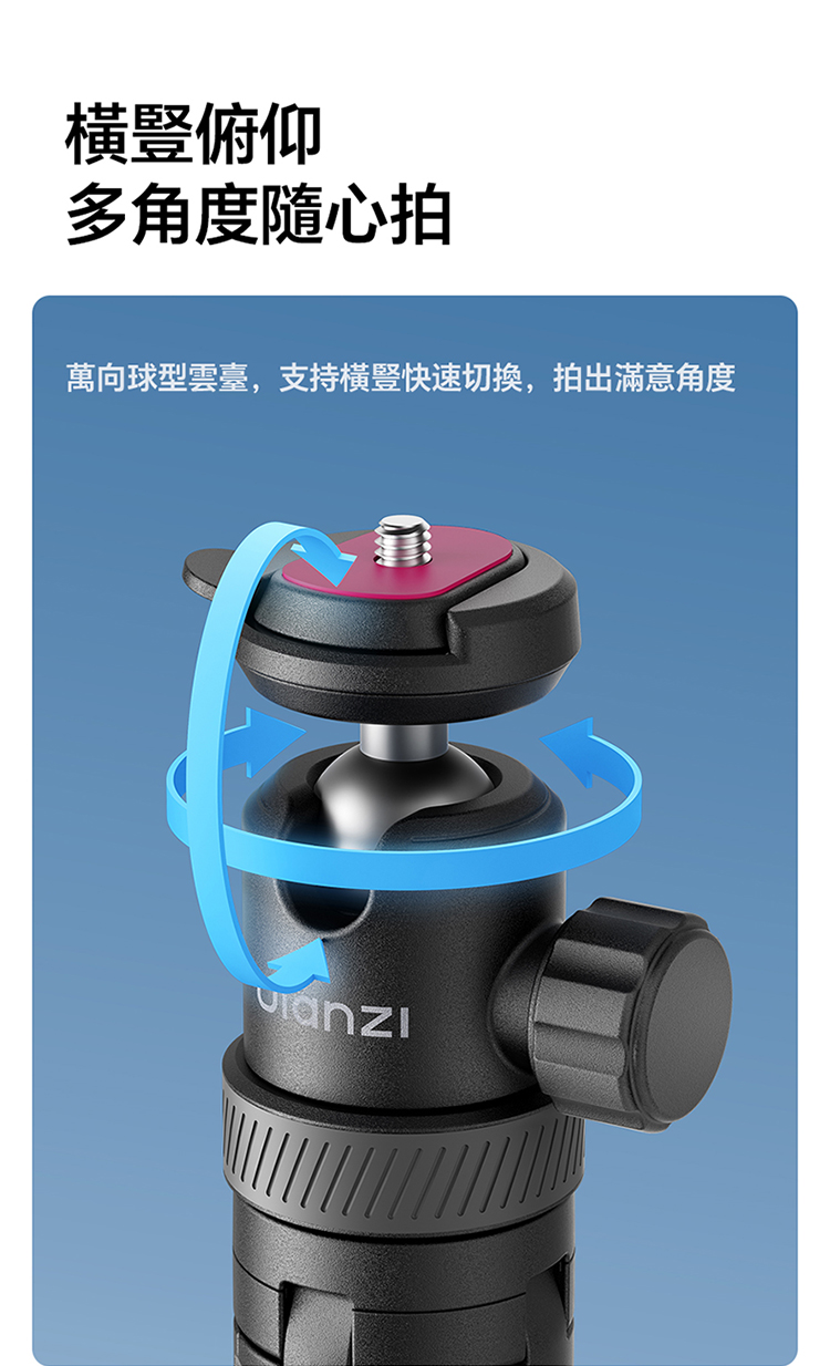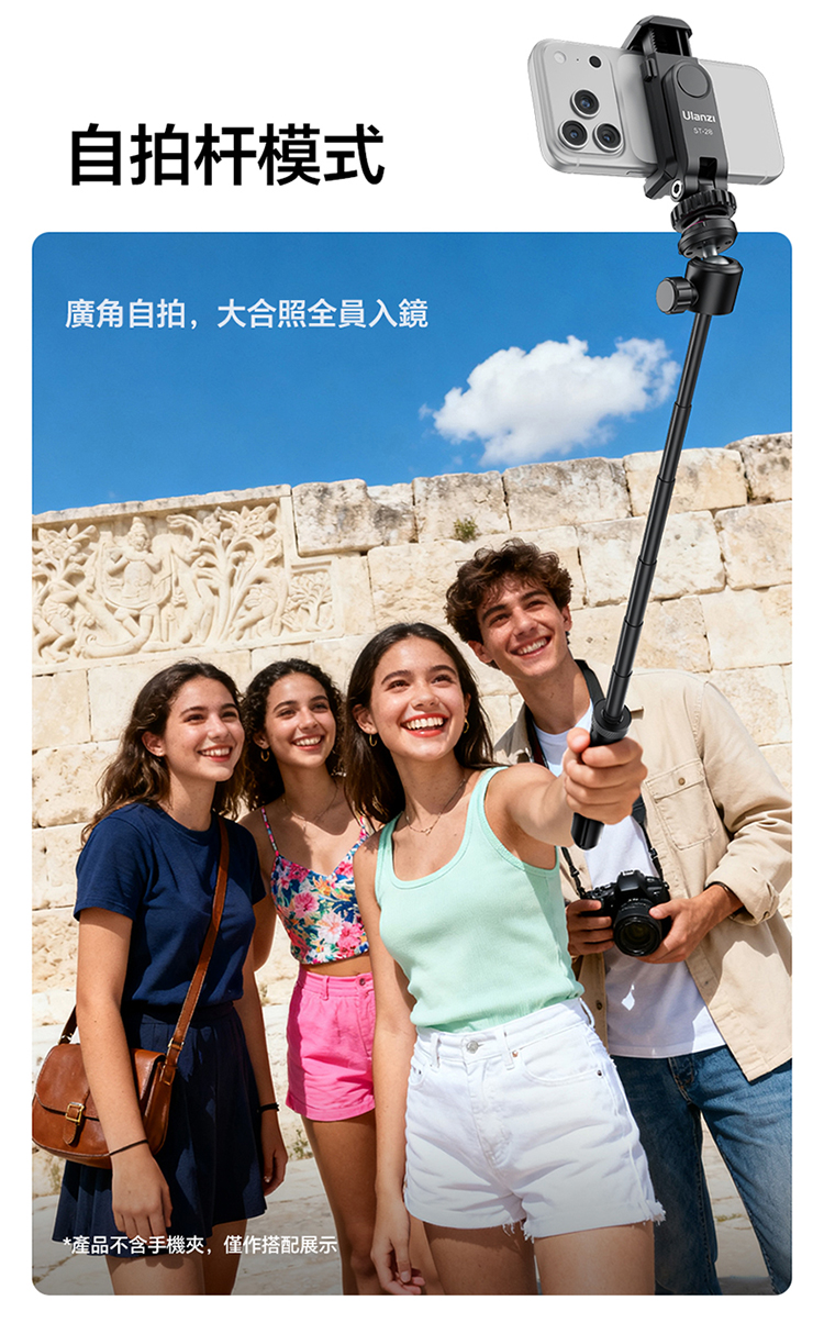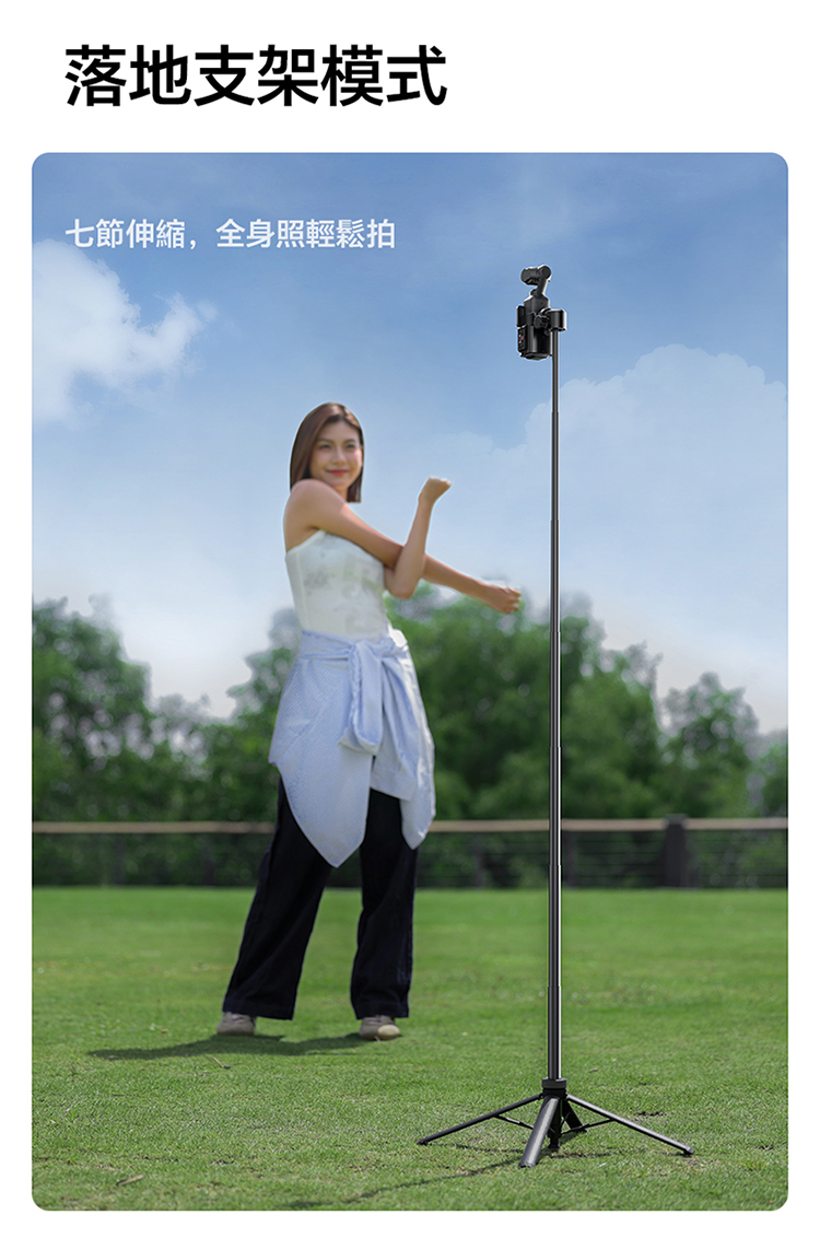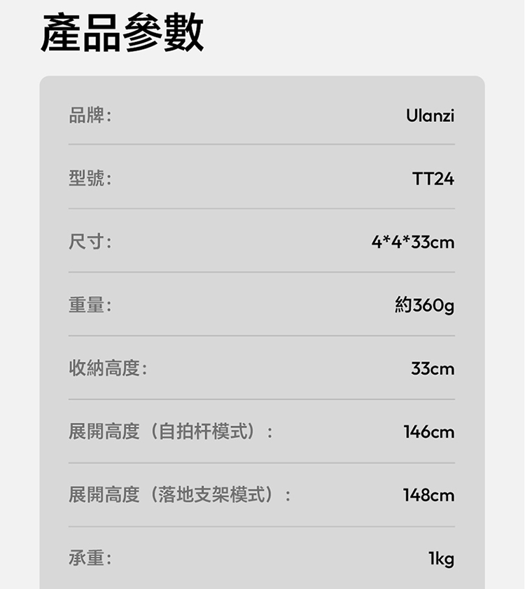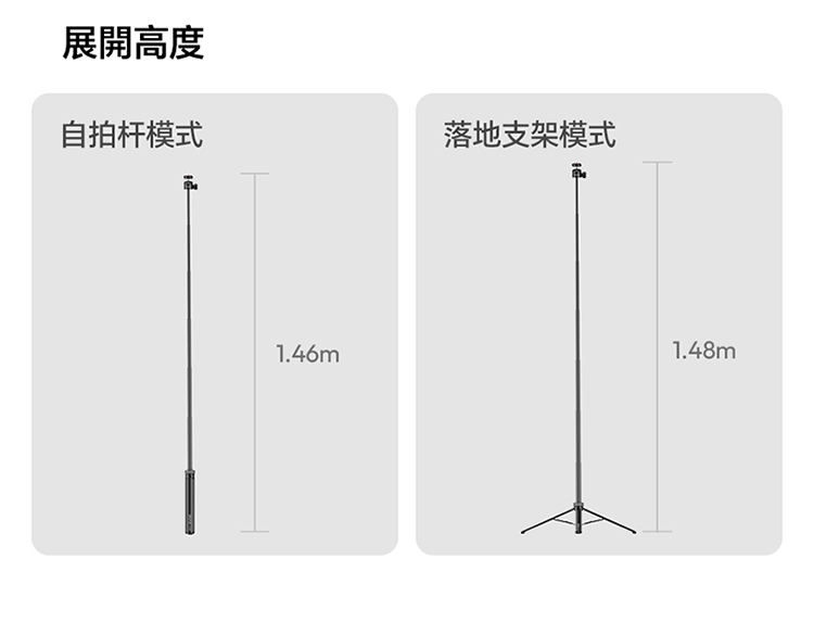 Ulanzi TT24 小火炬快開三腳架自拍棒(Cka 款)- 黑色,具備便利實用的核心特色。支援一鍵開啟設計,操作簡單,可快速切換至落地三腳架模式,滿足多種使用場景需求。其可延伸至 1.5M 長度,搭配手機夾,適配手機使用,同時也相容於大疆 pocket3 運動攝影機、action4、5pro 等設備,適用範圍廣。產品兼顧手持與落地支撐功能,無論是日常自拍、vlog 拍攝,或是戶外記錄,都能提供穩定支撐,為拍攝帶來便利,是兼顧實用性與相容性的拍攝輔助工具。