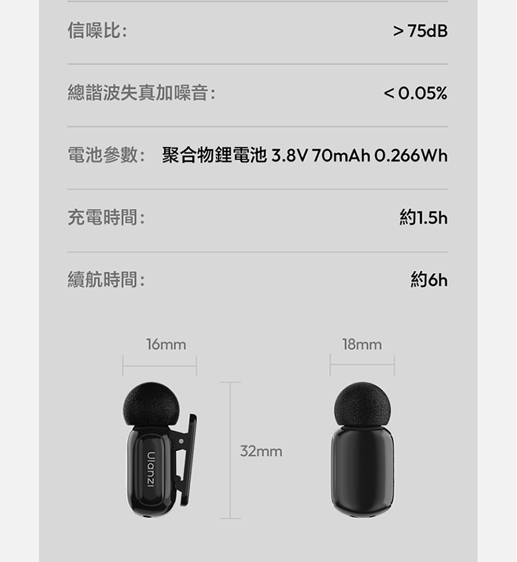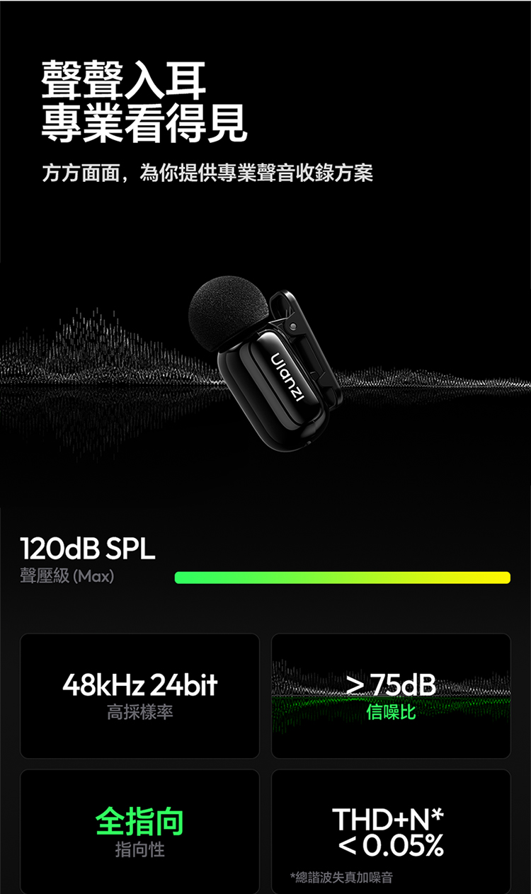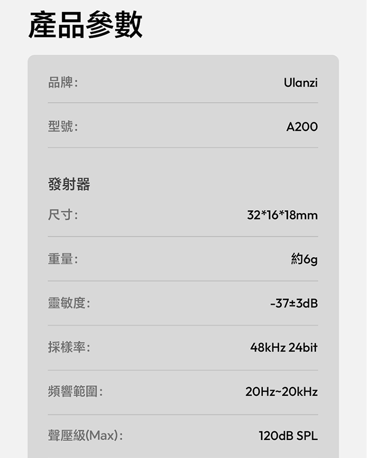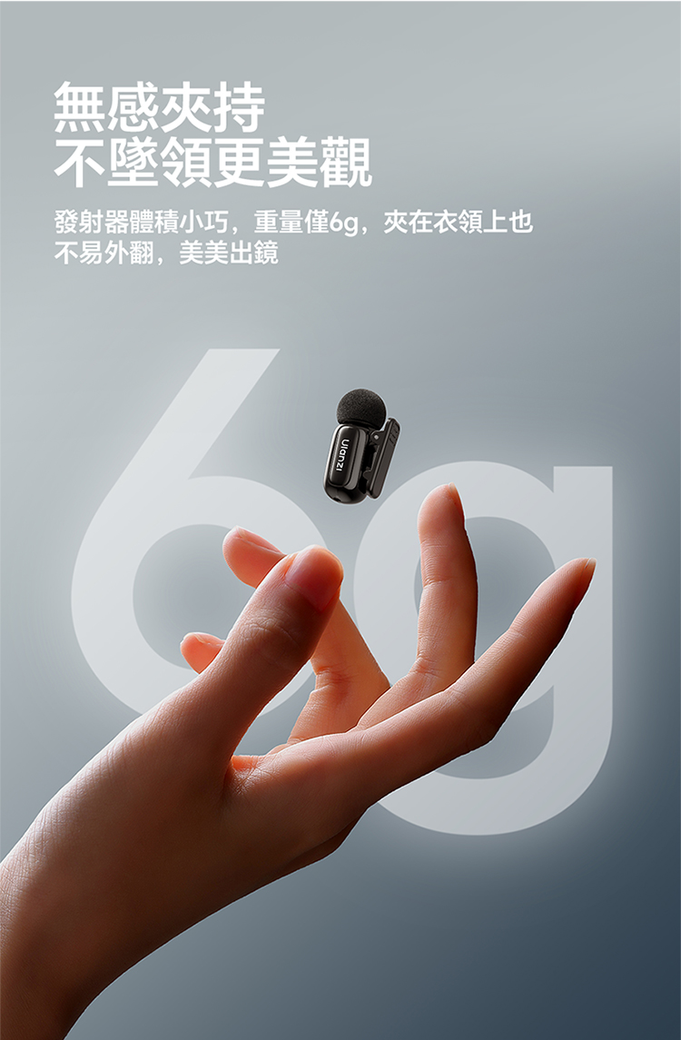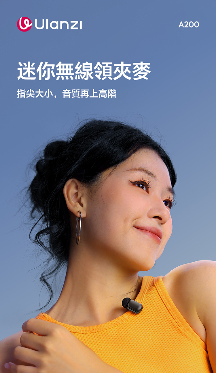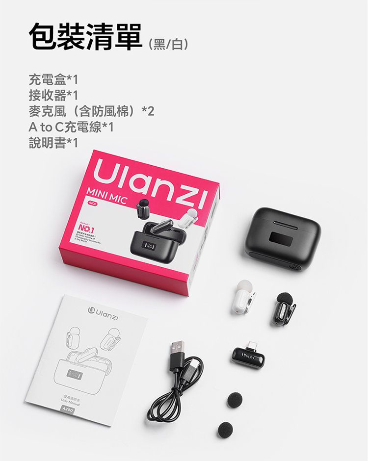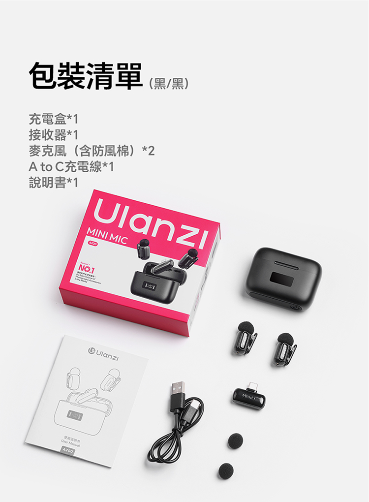 ULANZI A200 無線領夾式迷你麥克風僅重 6g,小巧輕便可輕鬆夾在衣領上,它採用免按鍵設計,即插即用無需複雜設置,搭配專業 DSP 芯片與三線架構,抗干擾能力出眾,智能降噪讓音質更純淨。音訊表現專業,具備 120dB 最大 SPL、48kHz/24bit 高取樣率、75dB 信噪比,20Hz-20kHz 頻率響應搭配全向拾音,錄音清晰細膩。無線傳輸穩定,直線距離可達 100 米,障礙物後仍能保持 50 米穩定連接。充電 1.5 小時即可滿電,搭配充電盒總續航力超 30 小時,支援即時顯示剩餘電量。相容於手機、電腦等裝置及多系統,適用於直播、訪談、vlog 等場景,包裝含充電盒、接收器等完整配件。