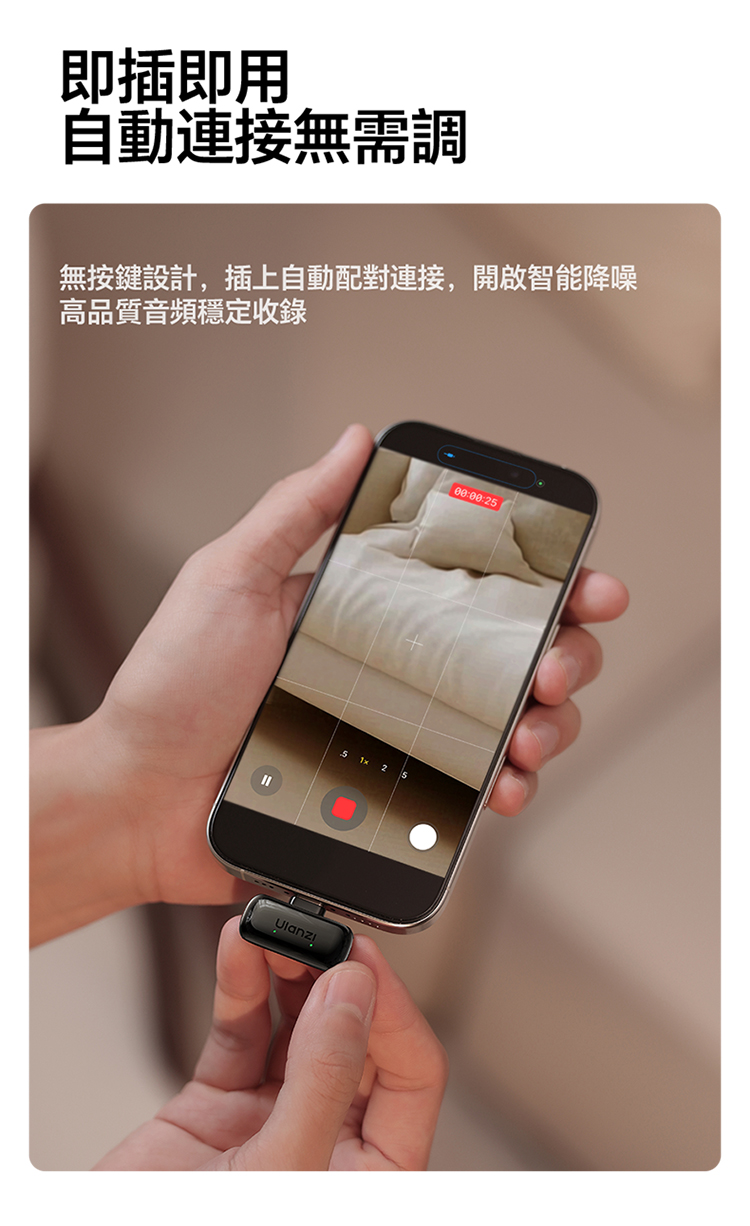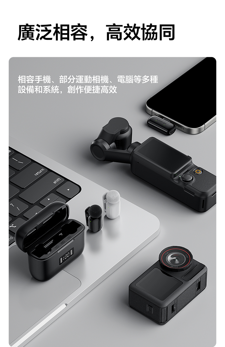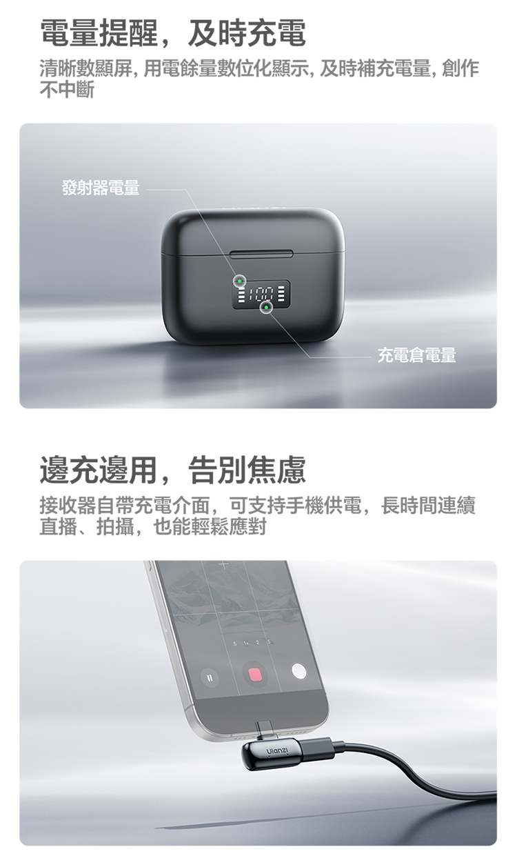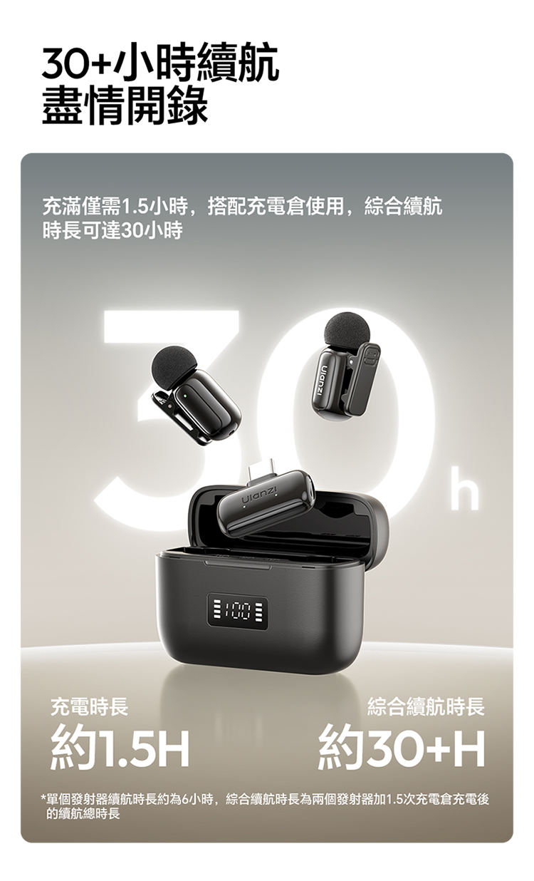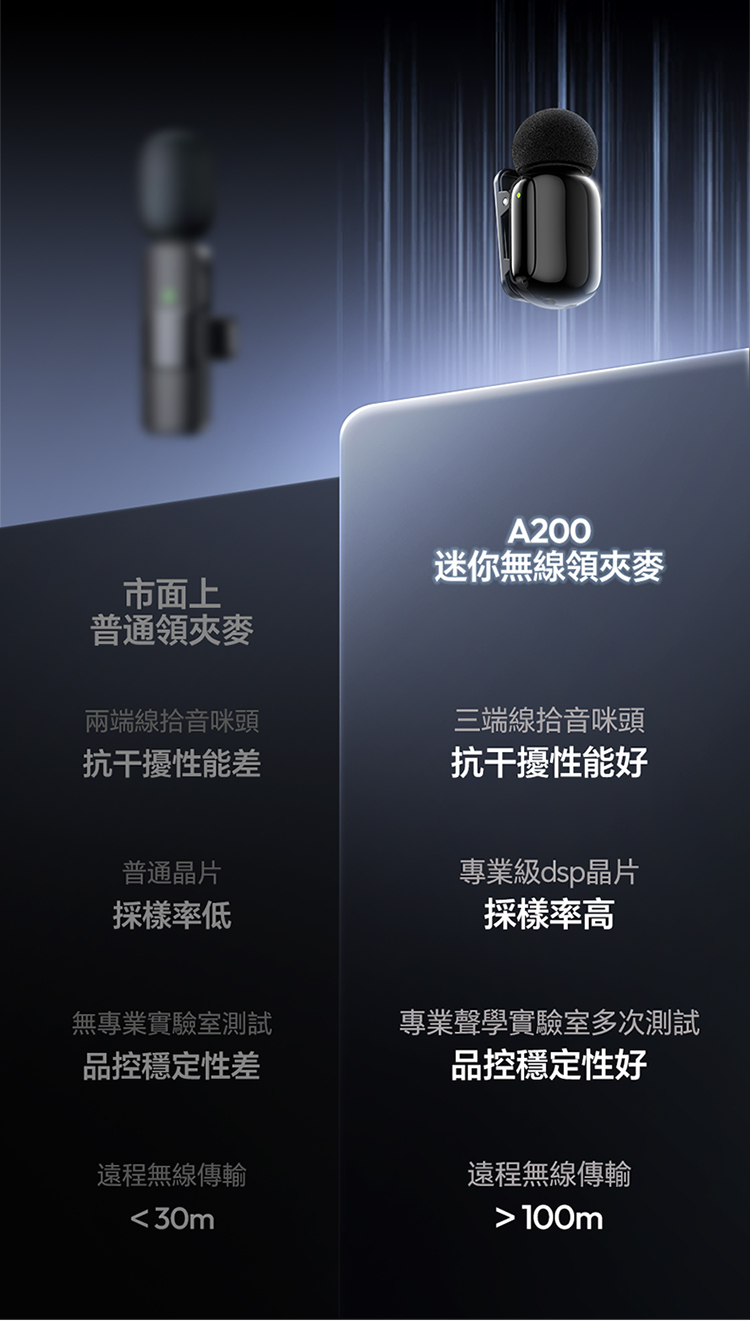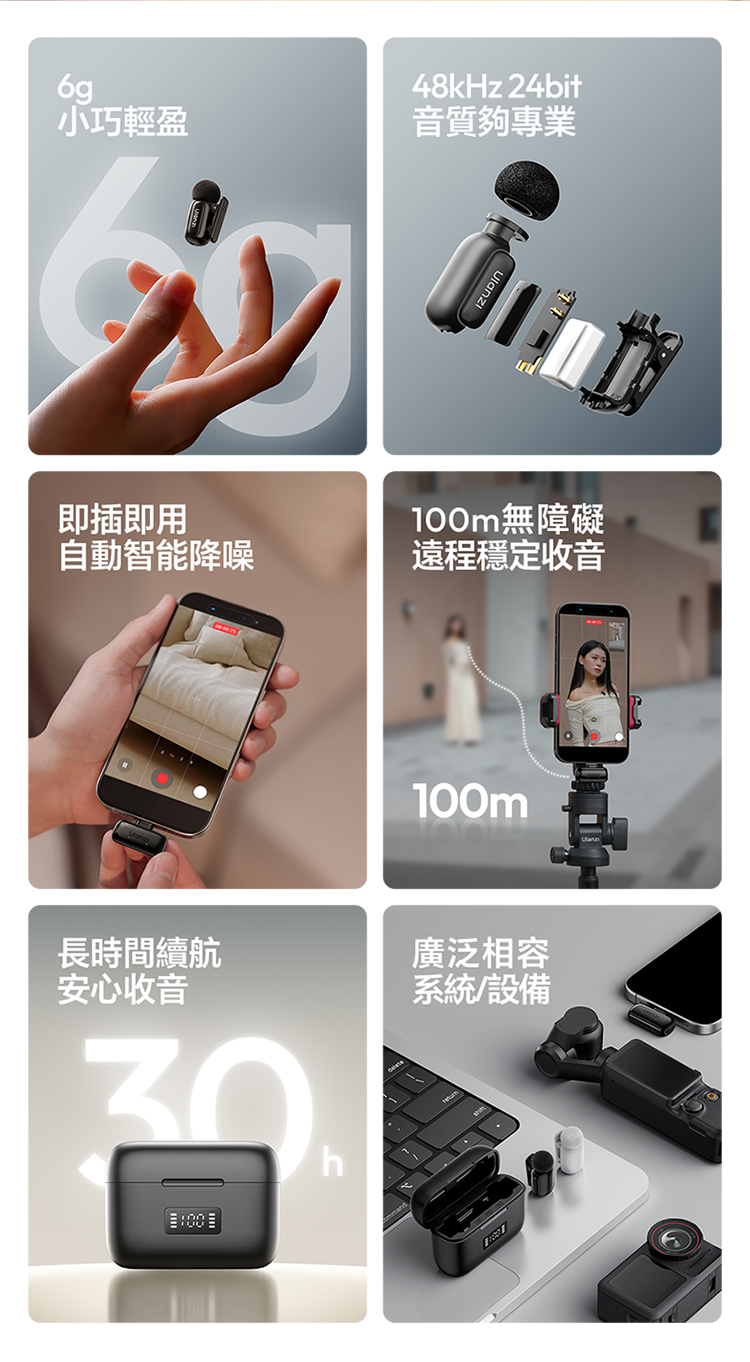 ULANZI A200 無線領夾式迷你麥克風僅重 6g,小巧輕便可輕鬆夾在衣領上,它採用免按鍵設計,即插即用無需複雜設置,搭配專業 DSP 芯片與三線架構,抗干擾能力出眾,智能降噪讓音質更純淨。音訊表現專業,具備 120dB 最大 SPL、48kHz/24bit 高取樣率、75dB 信噪比,20Hz-20kHz 頻率響應搭配全向拾音,錄音清晰細膩。無線傳輸穩定,直線距離可達 100 米,障礙物後仍能保持 50 米穩定連接。充電 1.5 小時即可滿電,搭配充電盒總續航力超 30 小時,支援即時顯示剩餘電量。相容於手機、電腦等裝置及多系統,適用於直播、訪談、vlog 等場景,包裝含充電盒、接收器等完整配件。