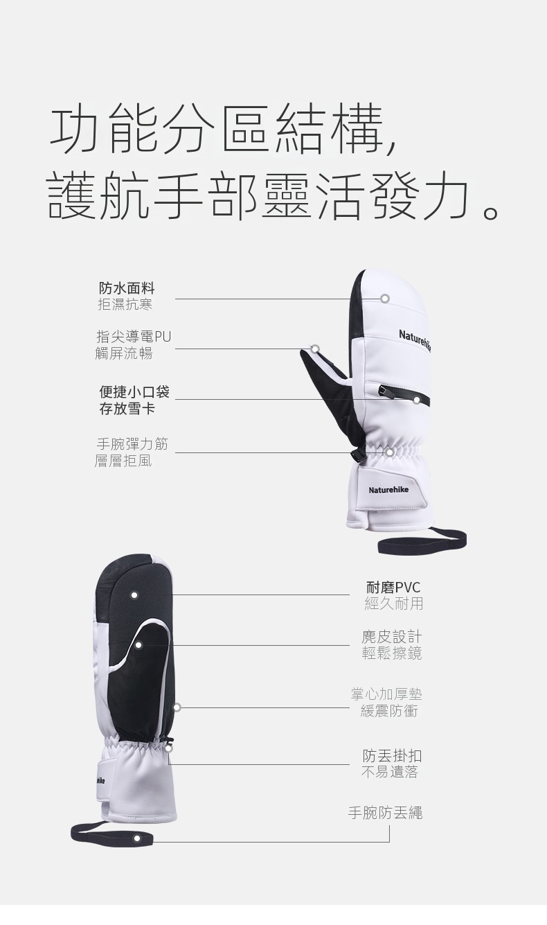Naturehike並指滑雪保暖手套採用杜邦棉保暖層,鎖溫蓄熱,持久抗寒。內裡五指分指設計,提升手指活動靈活性與包覆感。外層防水面料搭配耐磨PVC,防風拒水,耐久耐用。功能分區結構包含指尖導電PU、便捷小口袋及手掌加厚墊,兼具實用與保護性。腕口彈力筋與防丟繩設計,有效防風防脫落,適合滑雪等戶外運動使用。