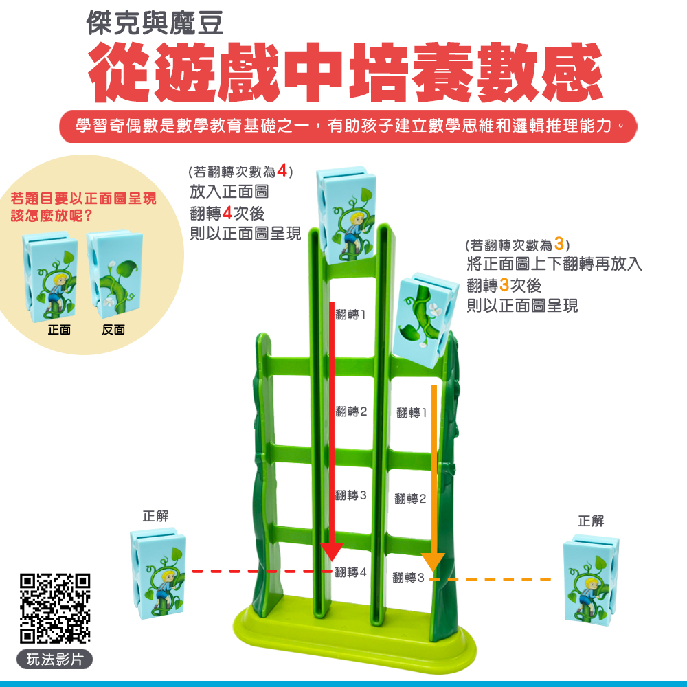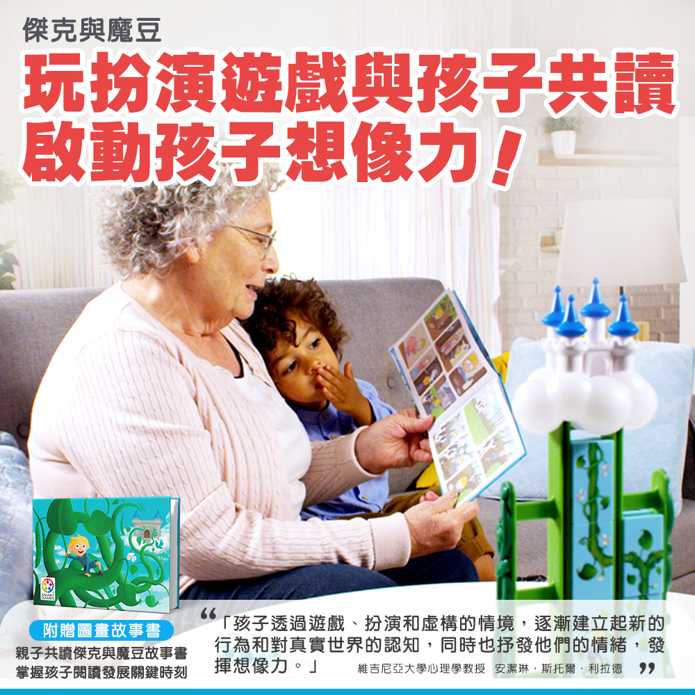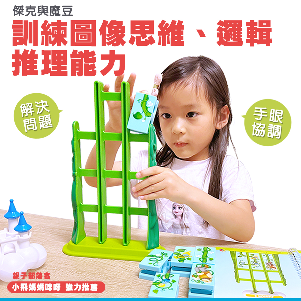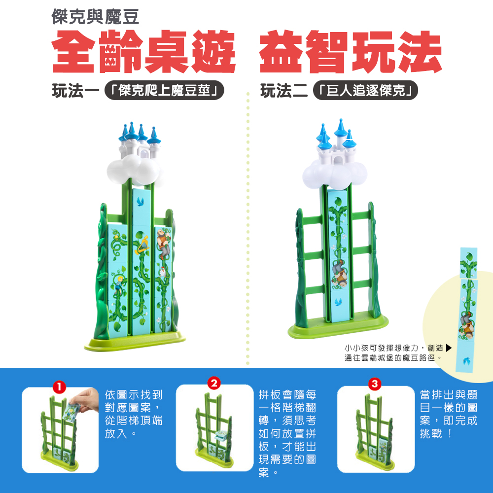 這款桌遊專為 4-7 歲兒童設計,支援 1 人遊玩,包含 60 個挑戰關卡,能助力孩子提升多種認知能力,其中規劃能力、空間感獲五星好評,視覺感知、解難能力、手眼協調能力獲四星認可。遊戲目標是幫助傑克從魔豆梯爬到雲塊中的堡壘。玩法為將拼圖從魔豆梯頂部逐格掉下,拼圖掉落時會翻倒,需事先規劃好初始放置方向,待拼圖在正確位置拼出與挑戰卡一致的圖案即通關,通關後可將城堡及雲塊置於魔豆梯組成完整畫面。此外,產品還附贈一本精美繪本,方便家長與孩子共度親子閱讀時光。
