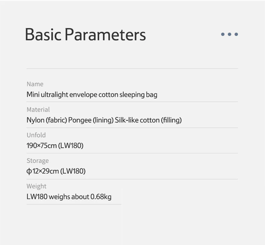 Naturehike LW180 迷你睡袋主打輕便與實用,適用於春、夏、秋三季,舒適溫度 15°C(59°F)、極限溫度 - 3°C(26.6°F)。標準版重約 480g,收納尺寸ф12×29cm,展開尺寸 190×75cm;大號版重約 560g,收納尺寸ф13×31cm,展開尺寸 205×85cm。布料採用 20D 380T 滌綸塔夫綢(外殼與內膽),填充 80g/m² 蠶絲般合成棉,柔軟透氣且親膚,外層帶防潑水塗層,兼具實用性與舒適度。配備雙向 YKK 拉鏈、防夾條與魔術貼設計,可防拉鏈突開、順滑開合,腳部可敞開透氣。支援完全展開當毯子,或與另一睡袋無縫拼接成雙人睡袋,搭配高密溫度標籤與收納袋,方便攜帶收納,是露營、健行、旅行等戶外活動的理想選擇。