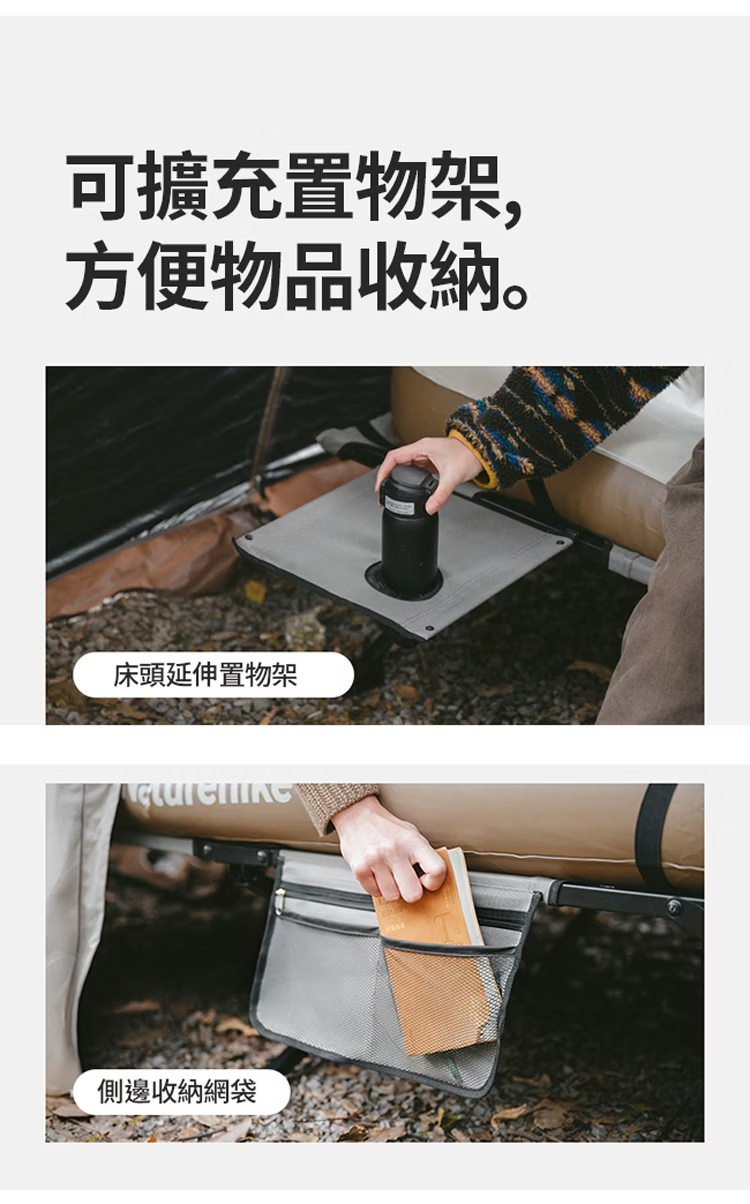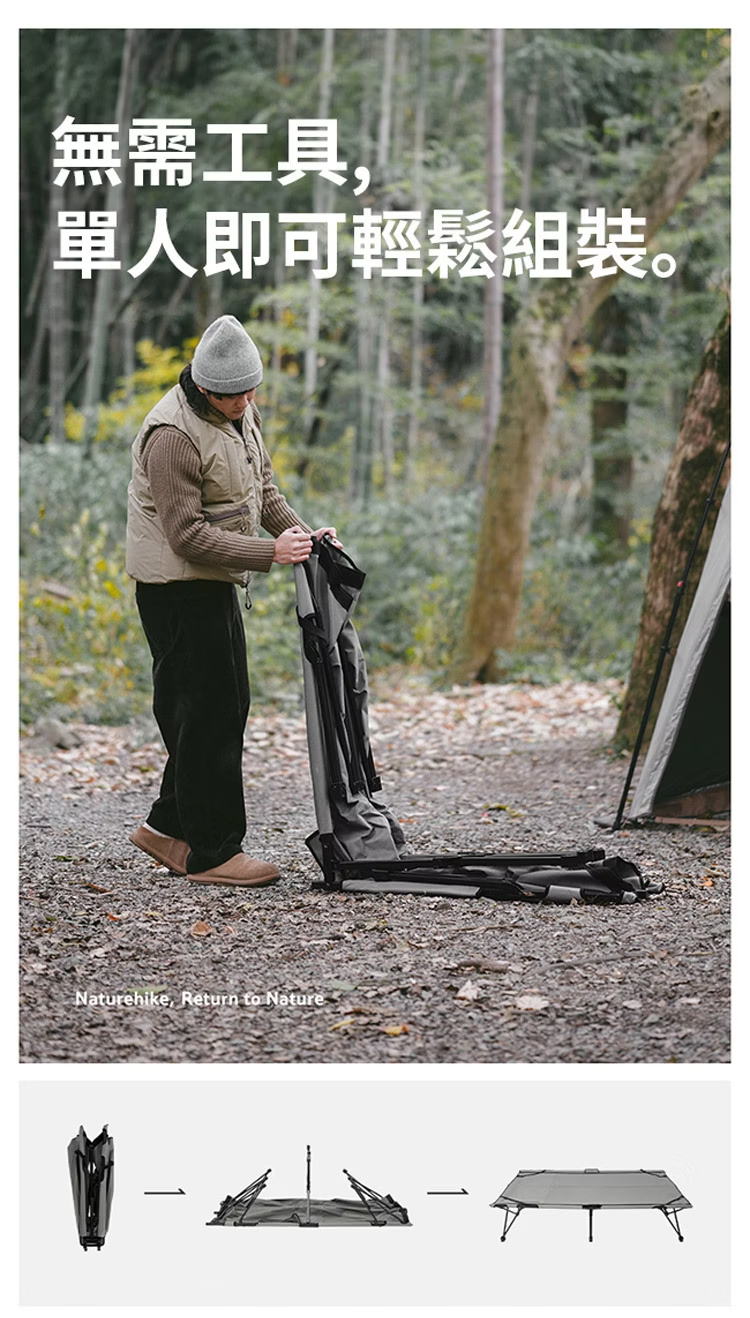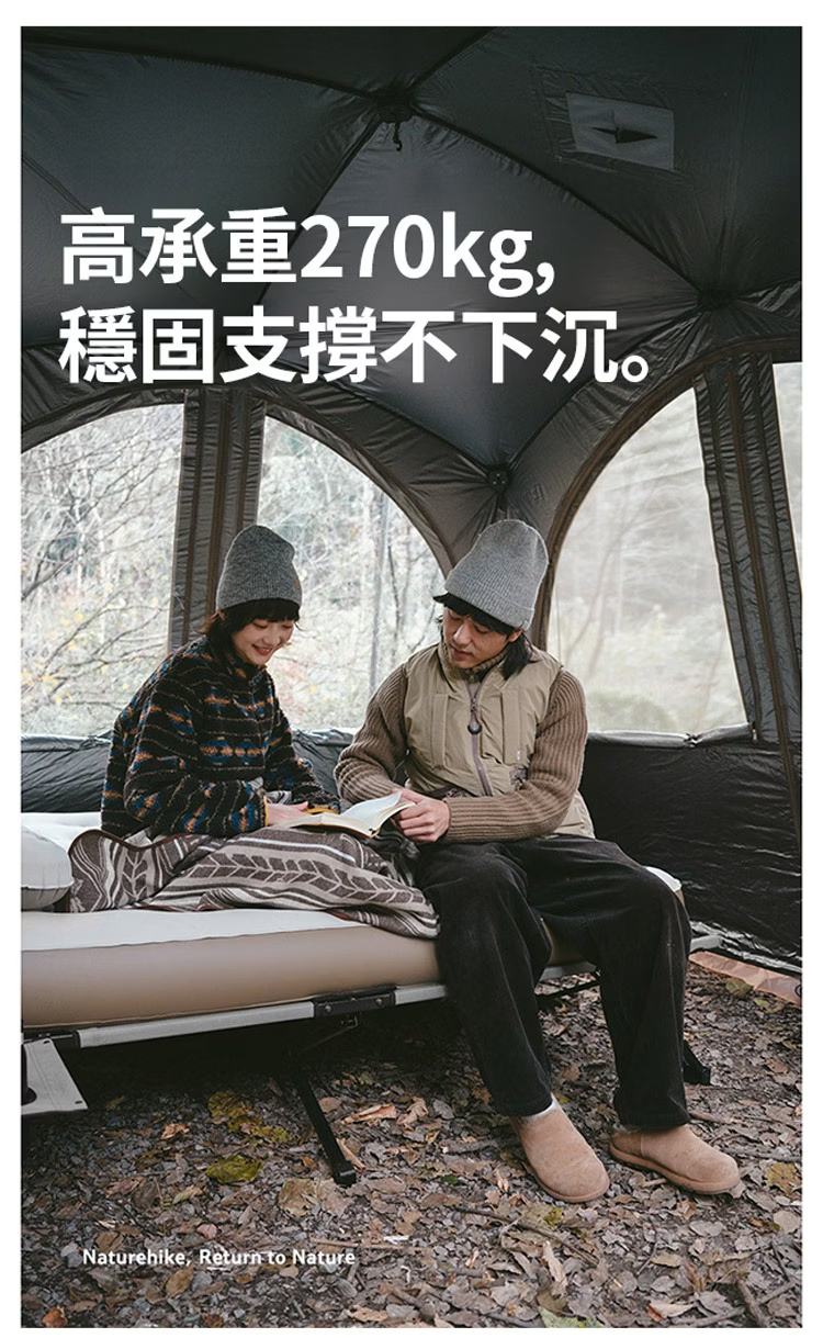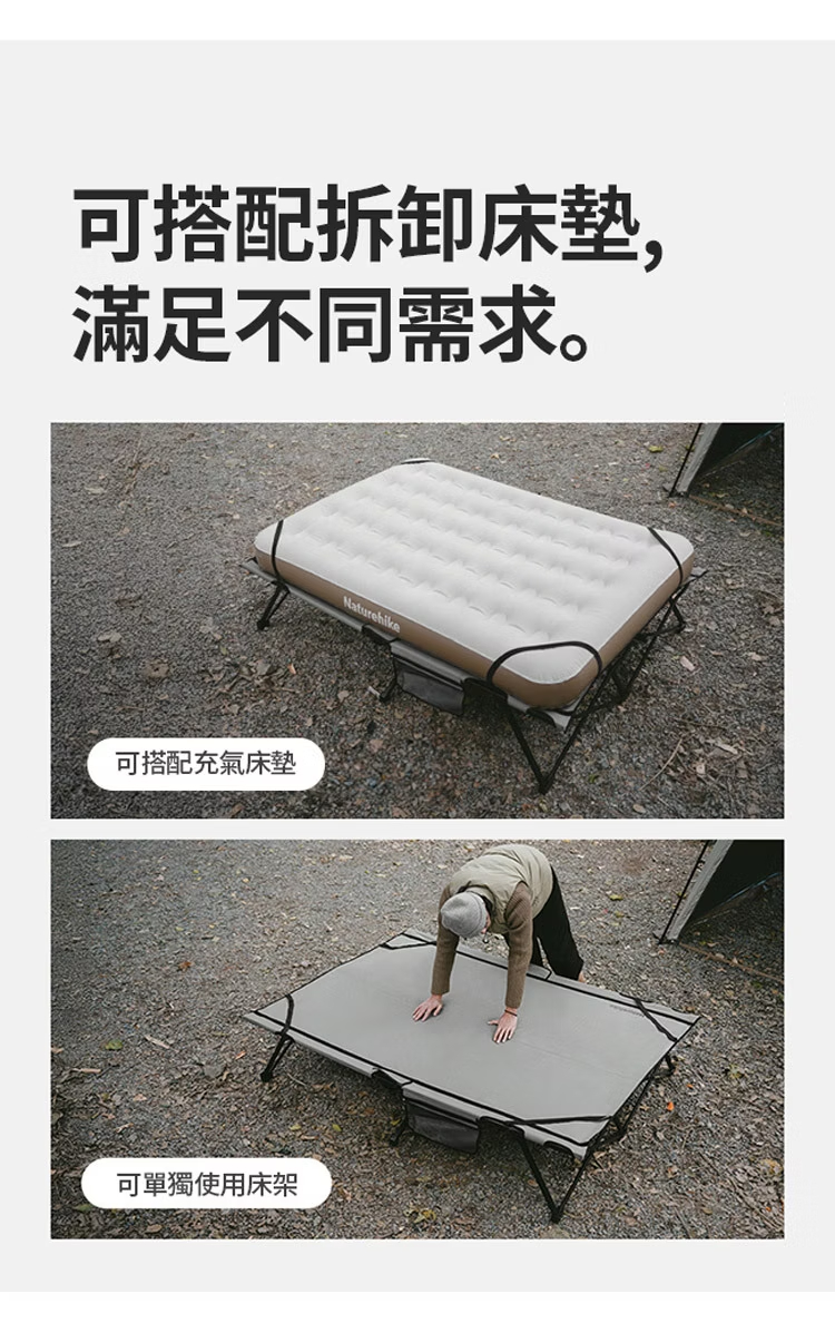這款戶外裝備來自全球化露營品牌 Naturehike,岩灰色設計簡約又實用。產品包含行軍床架、充氣床墊、延伸置物架及附輪收納袋,充氣床墊不含打氣幫浦。床架採用碳鋼與聚酯纖維材質,3 排雙 X 型結構搭配 9 點均勻支撐,承重達 270kg,噴塑製程防污防刮易清潔。無需工具,單人即可快速展開組裝,床架可單獨使用或搭配親膚植絨布料的增厚床墊,滿足多樣需求。側邊置物設計方便收納小物件,附輪收納袋讓搬運更便捷,展開與收納尺寸規則,適配戶外露營等場景,為戶外愛好者帶來穩固舒適的休憩體驗。