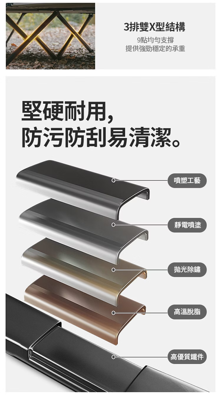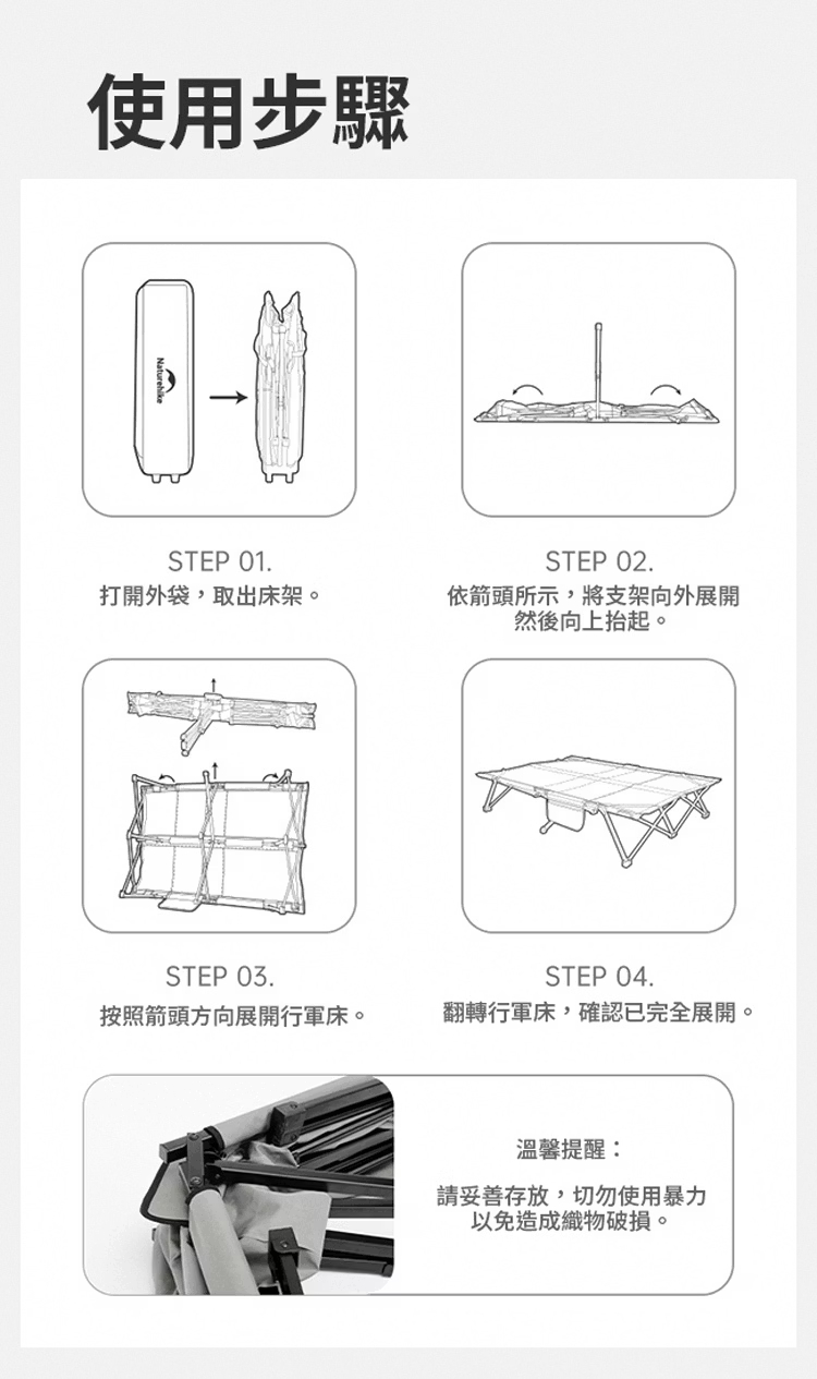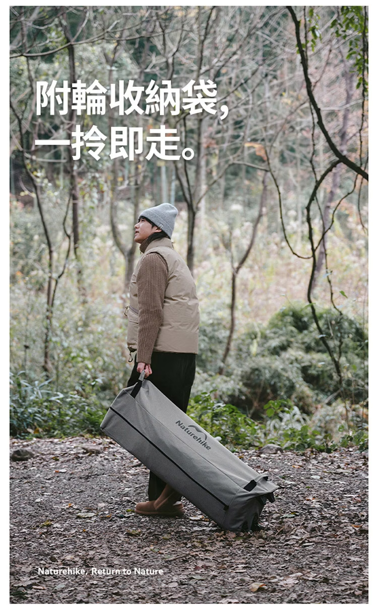 這款戶外裝備來自全球化露營品牌 Naturehike,岩灰色設計簡約又實用。產品包含行軍床架、充氣床墊、延伸置物架及附輪收納袋,充氣床墊不含打氣幫浦。床架採用碳鋼與聚酯纖維材質,3 排雙 X 型結構搭配 9 點均勻支撐,承重達 270kg,噴塑製程防污防刮易清潔。無需工具,單人即可快速展開組裝,床架可單獨使用或搭配親膚植絨布料的增厚床墊,滿足多樣需求。側邊置物設計方便收納小物件,附輪收納袋讓搬運更便捷,展開與收納尺寸規則,適配戶外露營等場景,為戶外愛好者帶來穩固舒適的休憩體驗。
