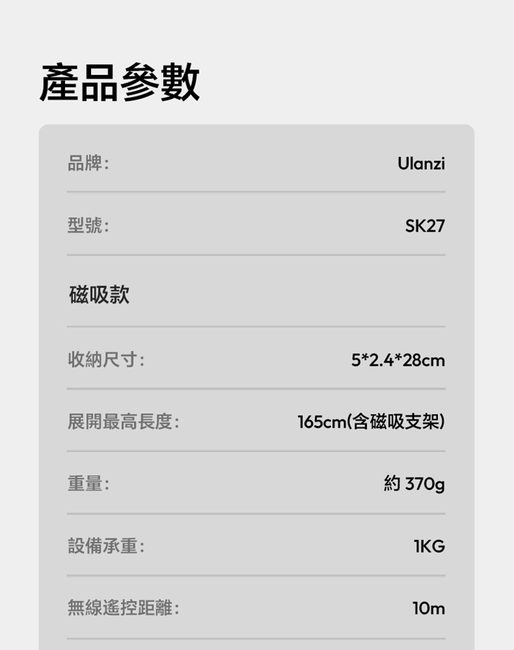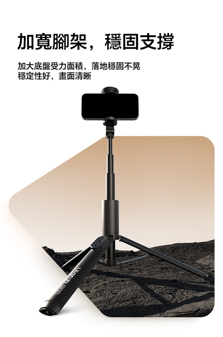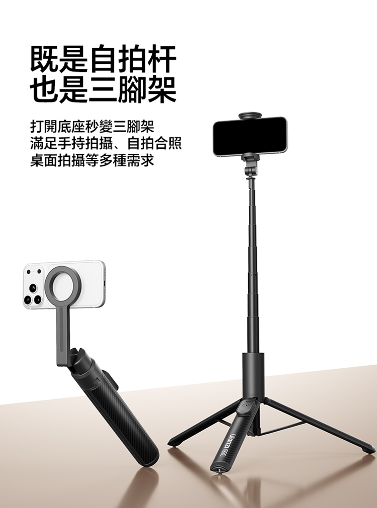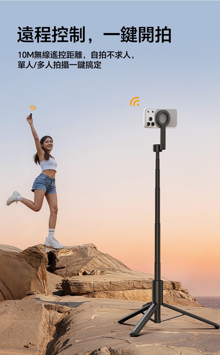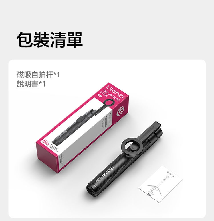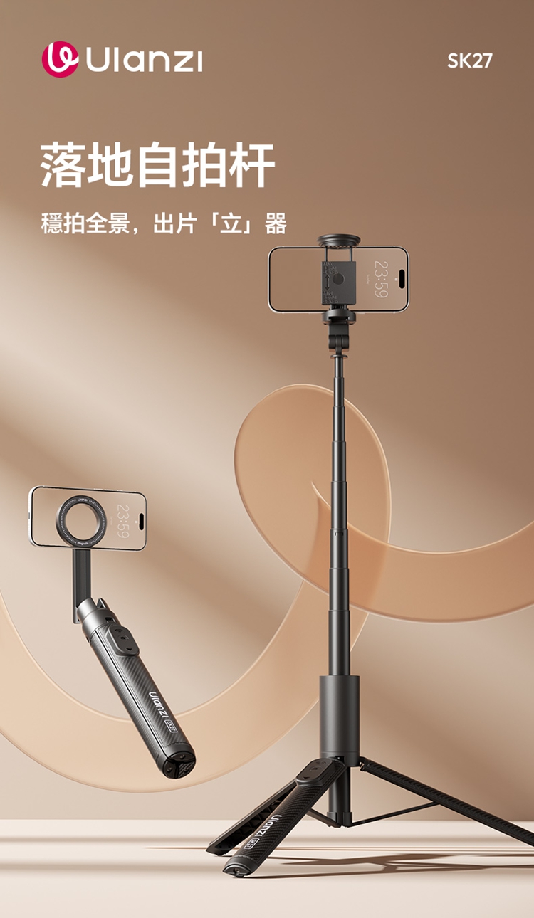 ULANZI SK27 手提自拍棒支架 Plus(磁吸款)- 黑色,是專為手機設計的新拍攝輔助工具。產品兼具便攜性與實用性,適配日常出遊、旅行等多種場景,方便隨時取用。核心亮點為磁吸設計,可快速吸附固定手機,無需複雜操作,輕鬆實現自拍自由。同時具備三腳架功能,能穩定支撐設備,避免拍攝時晃動,提升畫面清晰度。無論是日常自拍、風景記錄,還是直播、Vlog 創作等需求,它都能高效滿足,為手機用戶提供靈活、便捷的拍攝解決方案,是日常記錄與創作的優質搭檔。