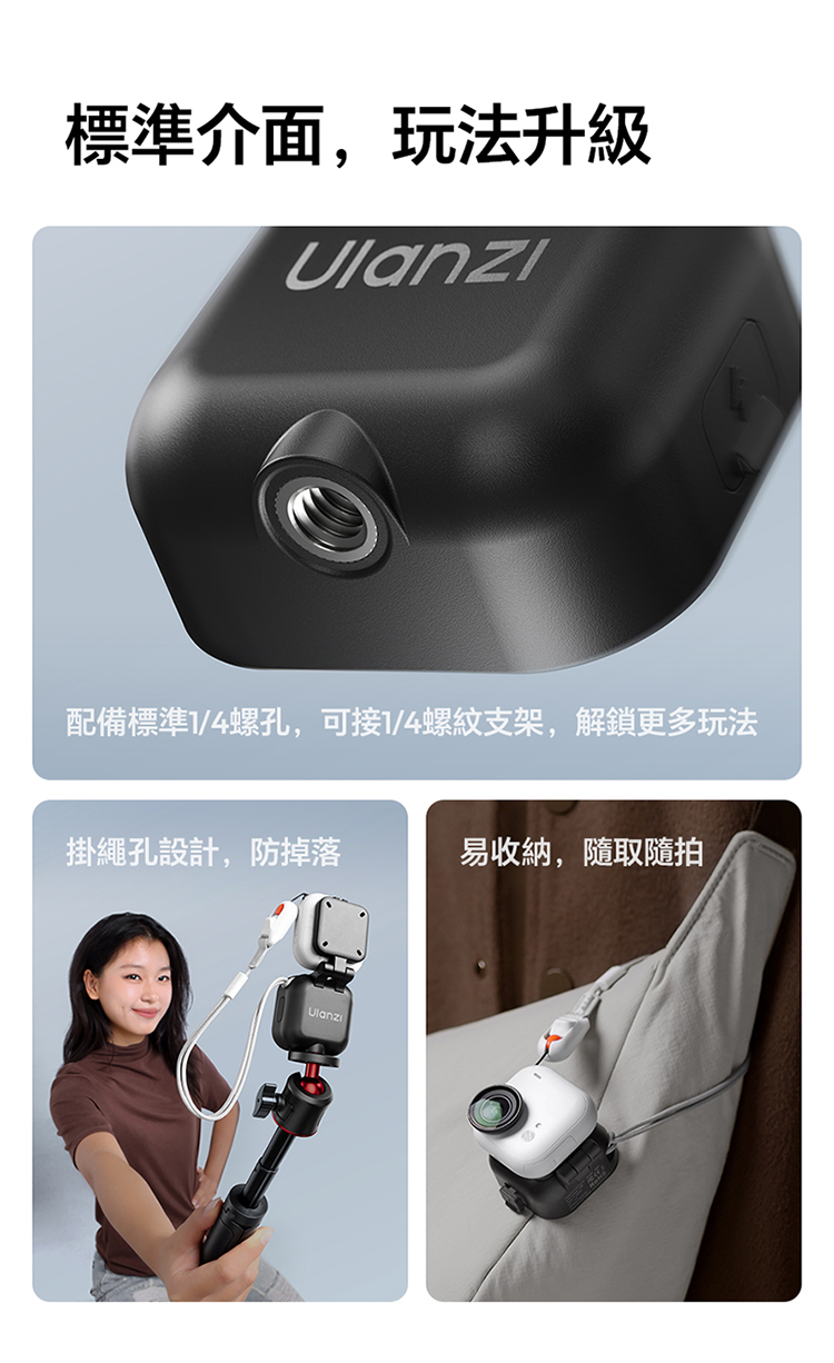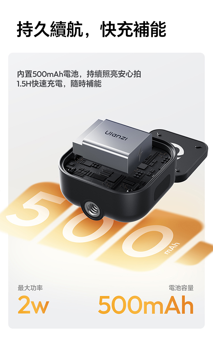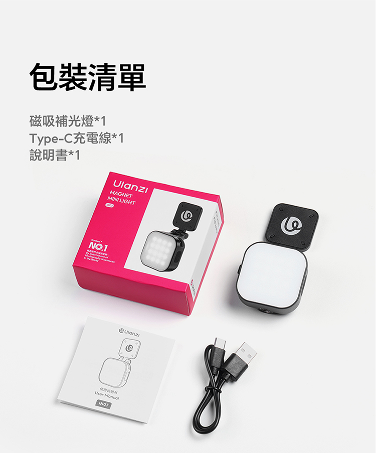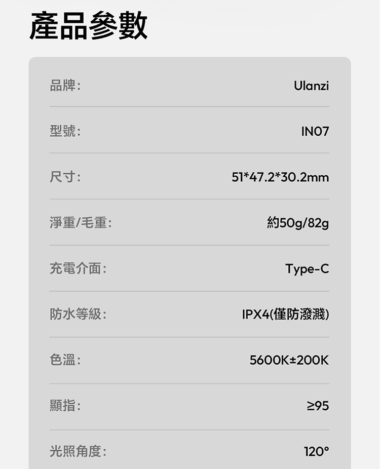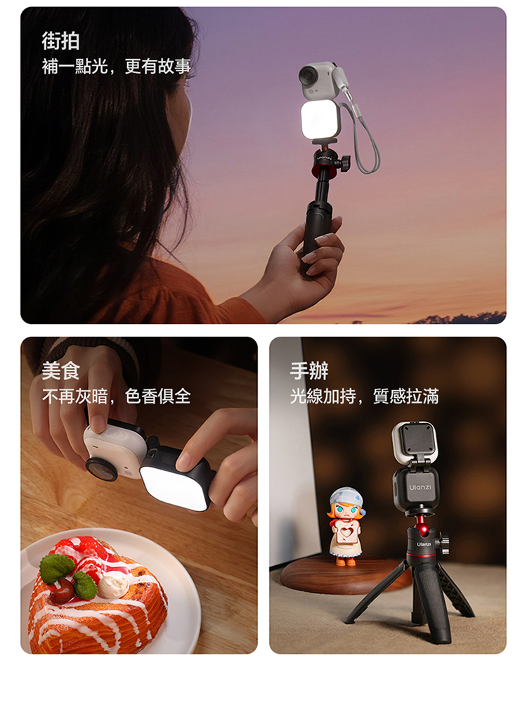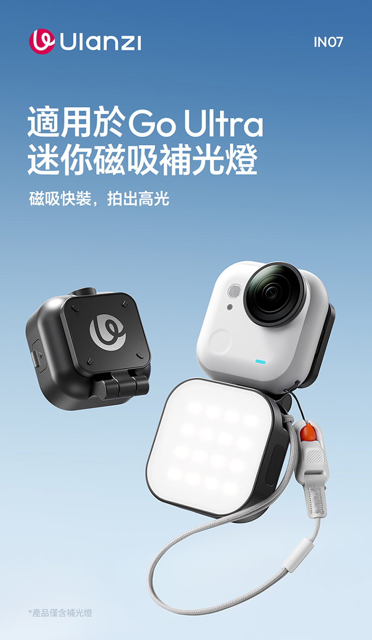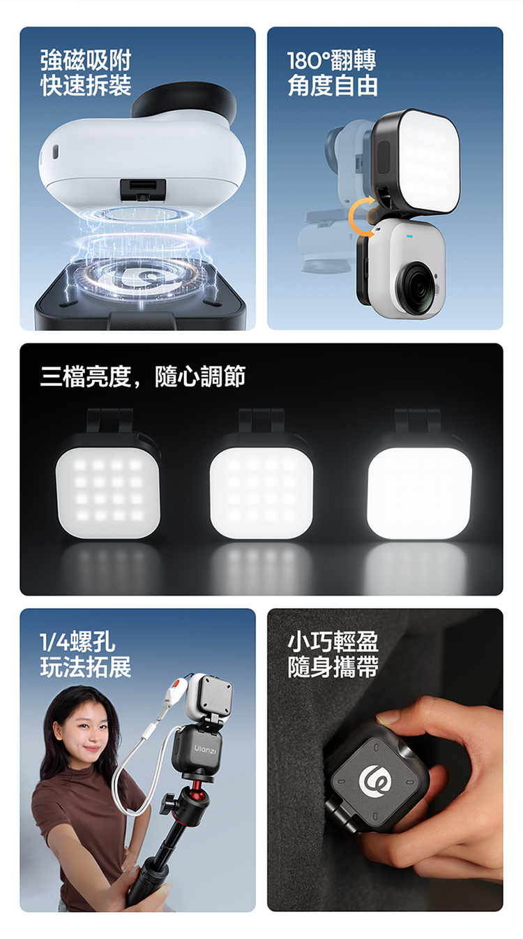 小巧便攜的補光神器來啦! ULANZI IN07 Go Ultra 磁吸翻轉小燈僅 50g 重,51×47.2×30.2mm 的精緻尺寸比耳機還小,輕鬆揣進口袋,隨時隨地解鎖補光自由。強力磁吸設計超實用,能快速吸附於手機、相機及各類金屬表面,還相容於 Go Ultra 磁吸底座,搭配 1/4 吋通用螺孔,連接三腳架秒變專業拍攝 setup! 180° 順滑旋轉 + 精準阻尼,任何角度都能穩固固定位。 5600K 自然日光色溫搭配>95 的高顯色指數,色彩還原真實細膩,3 檔亮度可調(30%/70%/100%),120° 廣光束角,不管是 vlog 錄製、街拍補光,還是美食、藏品拍攝,都能呈現絕佳光影效果。內建 500mAh 長效電池,100% 亮度可持續使用 1 小時,Type-C 介面 1.5 小時快速滿電,IPX4 防潑水設計更耐用,開箱即享專業補光體驗!