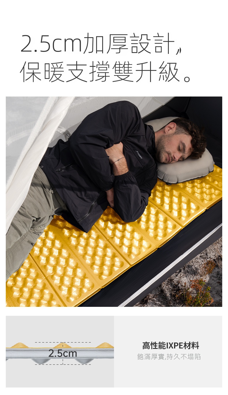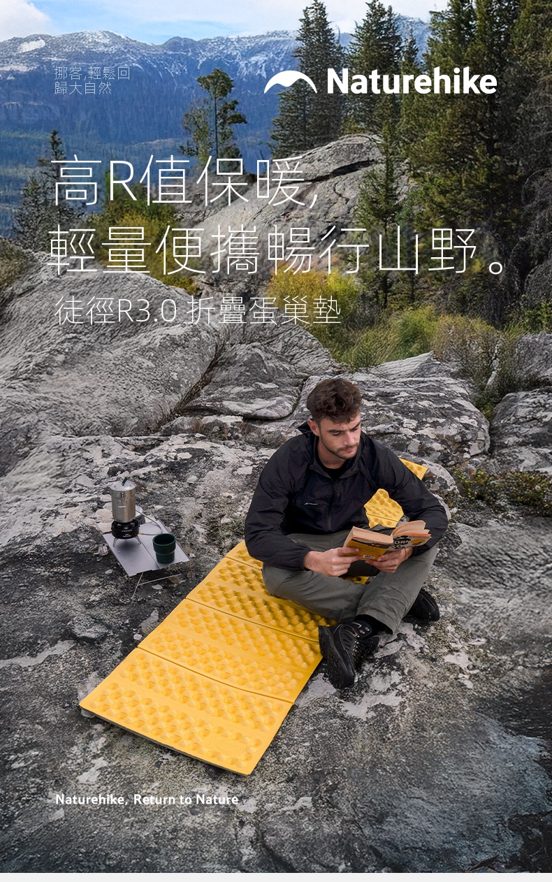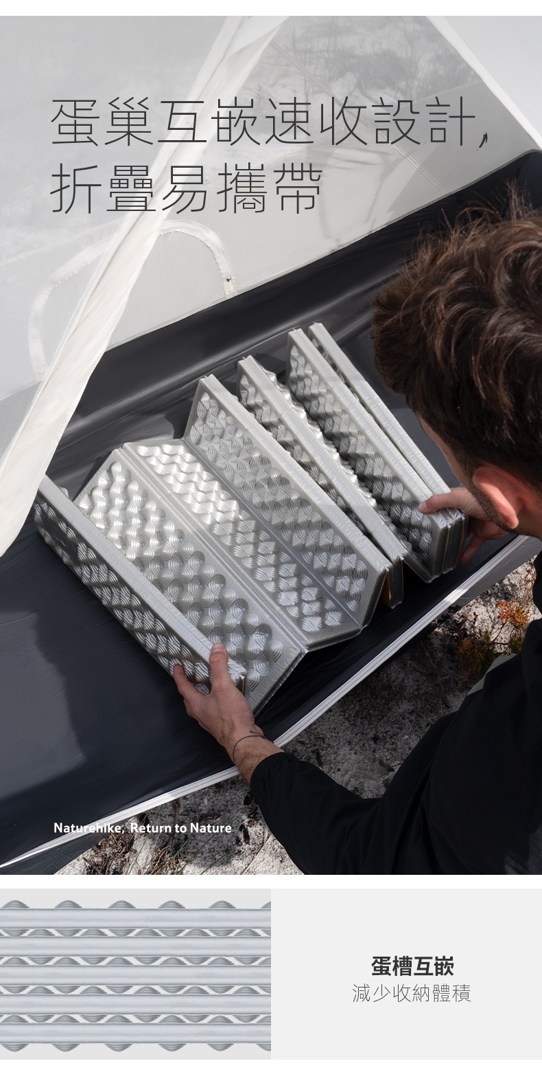 Naturehike Troues R3.0 折疊式蛋巢露營墊,適合戶外露營使用。具備3.0高R值保溫性能,適用於低至-5℃環境,有效隔絕地面寒氣。多層結構包含IXPE層、保暖層與防潮鋁膜,提供優異的保暖與防潮效果。2.5cm加厚設計搭配蜂窩螺旋結構,提升支撐力與回彈性。獨特蛋槽互嵌速收設計,輕鬆摺疊,方便隨身攜帶。一墊多用,適用露營、垂釣、野餐及居家場景,兼具實用與舒適。