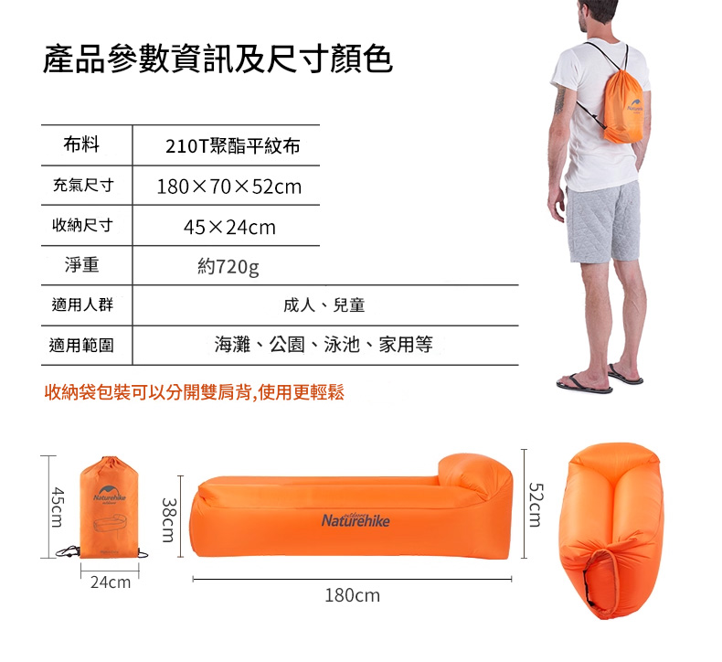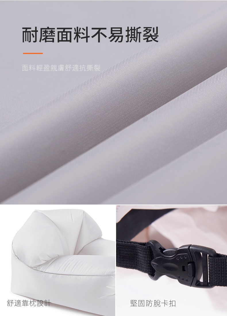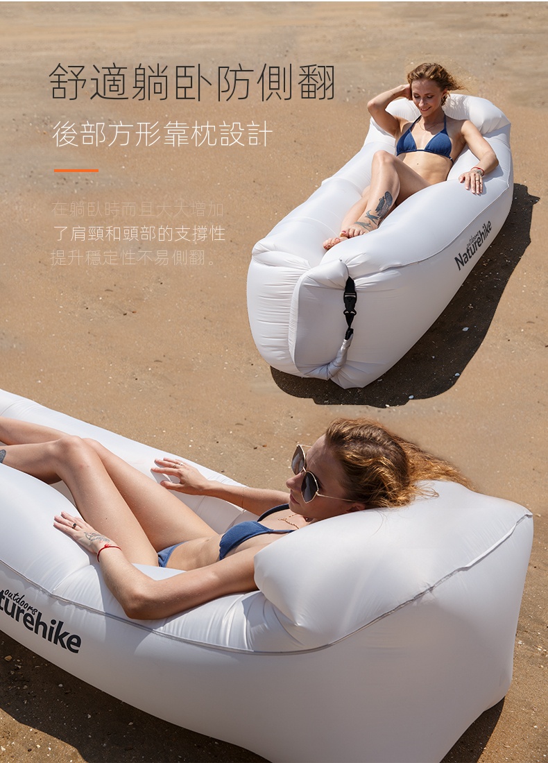 Naturehike NH20FCD06 雙人款懶人充氣梳化,採用耐磨抗撕裂面料,輕盈親膚,適合戶外與居家使用。後部方形靠枕設計提升肩頸與頭部支撐,躺臥更穩定不易側翻。僅需四步即可快速充氣,收納方便攜帶輕鬆。搭配堅固防脫卡扣,安全耐用。適用於沙灘、公園、泳池等多種場景。隨時隨地享受舒適休閒時光。