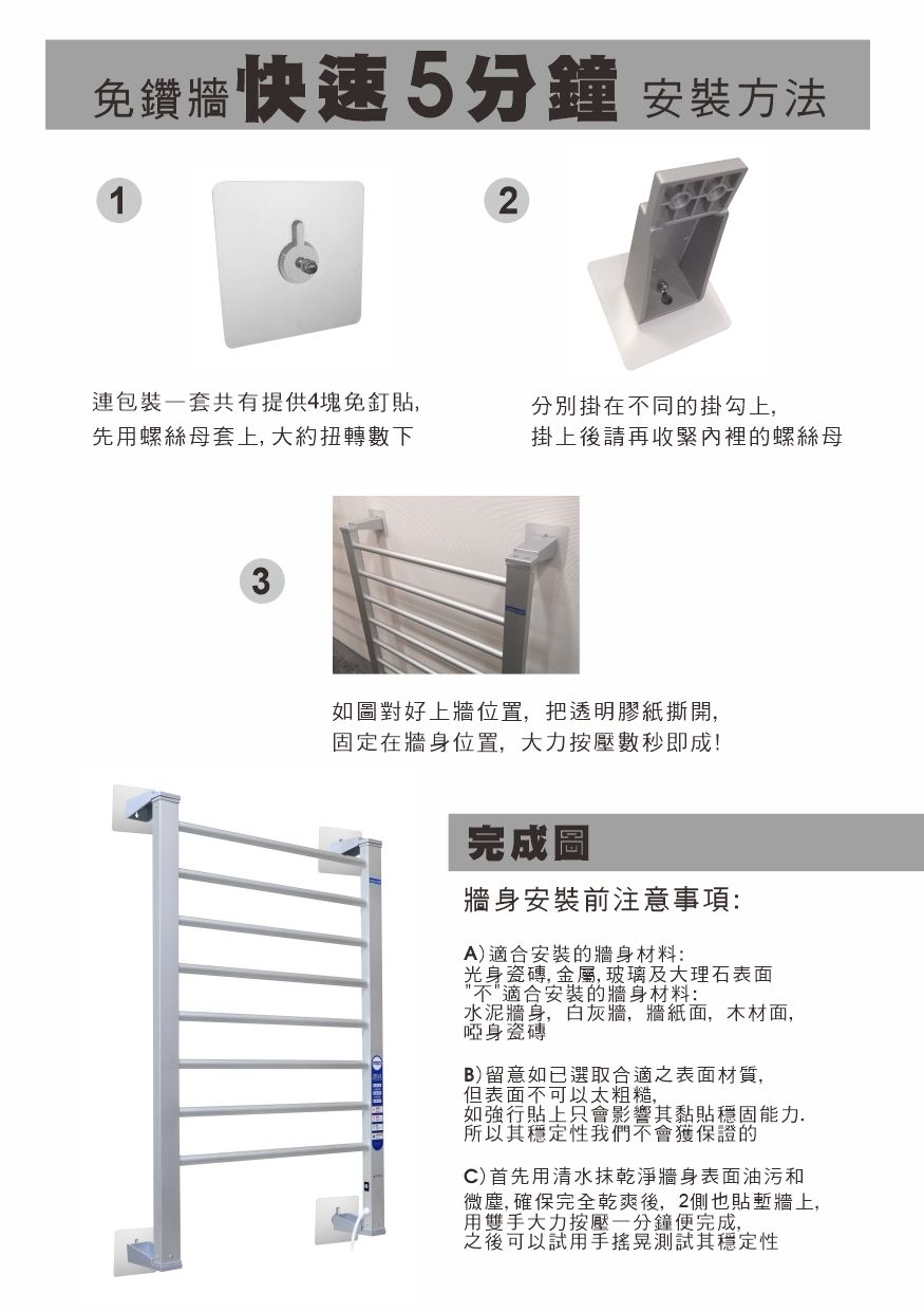 這款智慧電熱毛巾架採用全鋁合金材質,設計時尚且堅固耐用。配備 25 條扁通,以 7+7+7+4 特別排列,確保熱力分佈均勻廣泛。內置四種智慧模式,30 分鐘預熱毛巾、2 小時幹毛巾、8 小時乾衣及 24 小時長效防黴,完美搭配不同烘乾需求。乾衣過程中智能調溫,避免衣物過熱受損,同時有效除潮去異味、抑制黴菌滋生,經檢測可殺滅 99.9% 細菌,達到消毒效果。支援免鑽牆快速安裝,5 分鐘即可完成,適用於光身瓷磚、金屬、玻璃等光滑牆面。輸入電壓 220-240VAC,功率 475W,掛牆尺寸 123x60x11.5cm,相容於毛巾、衣物、嬰兒用品及床上用品等,配備上下兩組調控按鈕,溫度調節較靈活,是提升居家體驗的實用好物。