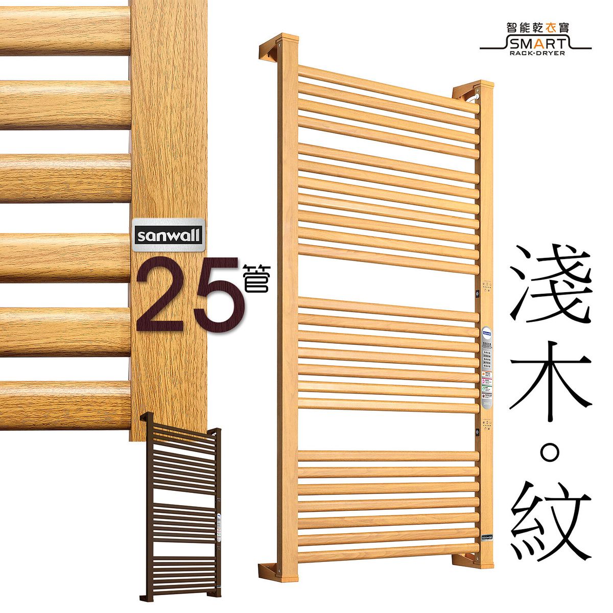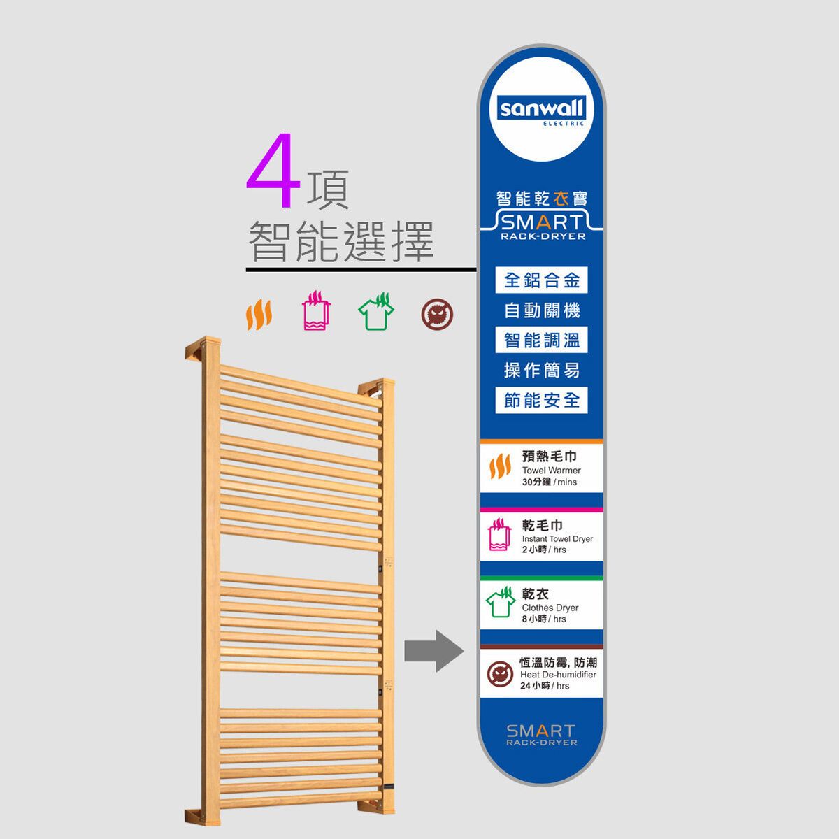 這款來自 Sanwall 的智慧幹衣架,採用全鋁合金材質,木紋設計時尚美觀。配備 18 管(7+7+4)扁通特別排列,熱力分佈均勻廣泛。有預熱毛巾、幹毛巾、乾衣、長效防黴四種智慧模式,對應 30 分鐘至 24 小時不同需求,可快速烘乾毛巾、衣物等,除潮去味防黴菌。乾衣過程中智能調溫,避免衣物過熱受損,經檢測能殺滅 99.9% 細菌。 220-240V 電壓搭配 250W 功率,安全耐用,支援免鑽牆 5 分鐘快速安裝。產品原廠行貨,提供 1 年保養,是居家乾衣消毒的實用之選。