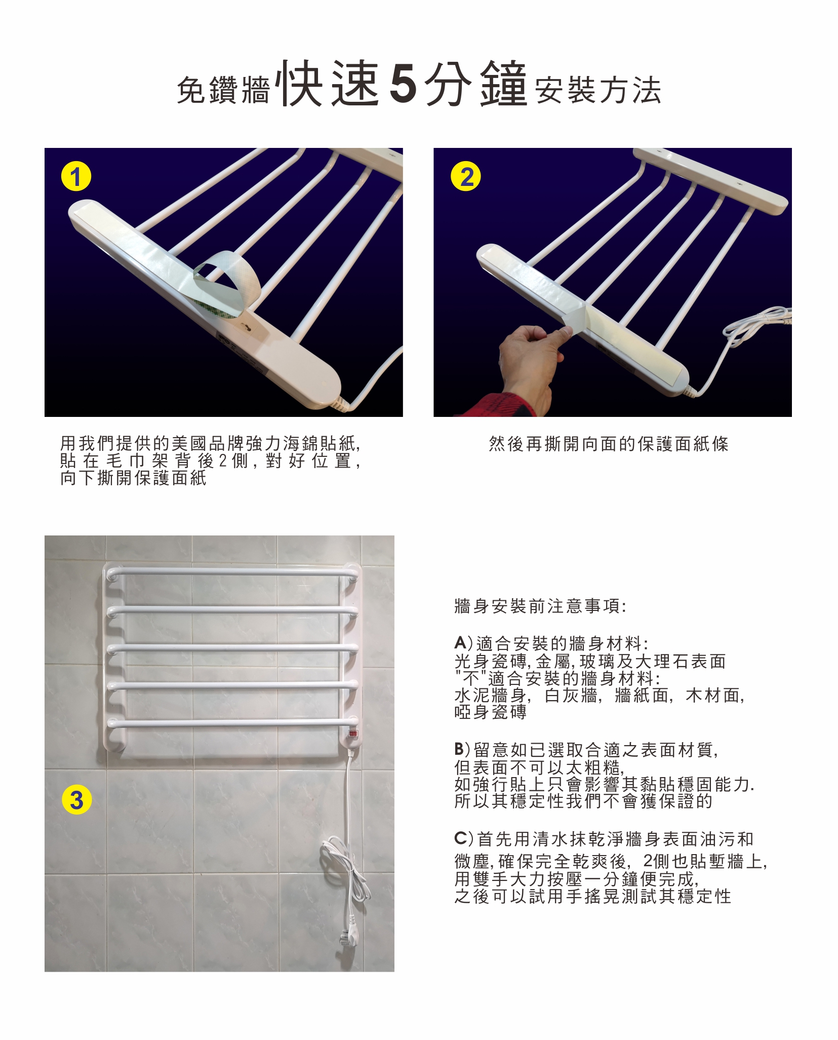 Sanwall T205S-80W 掛牆式電熱毛巾架,是解決居家潮濕問題的實用好物。產品採用免鑽牆設計,搭配強力海綿貼紙,5 分鐘即可快速安裝,僅適用於光身瓷磚、金屬、玻璃及大理石等光滑表面,水泥牆、白灰牆等粗糙牆面不適用。 80W 低功率極度慳電,耗電量少於一般燈泡,可全天侯使用。它能快速烘乾毛巾、衣物、嬰兒用品及寢具,有效去除潮濕與異味,防止黴菌滋生,同時保持毛巾衣物顏色鮮亮,延長使用壽命。產品尺寸為 45×50×9.5cm,白色簡約外觀不佔空間,適合多種居家風格。其通過相關歐盟認證,遵循低電壓指令標準,安全設計耐用可靠,是提升浴室衛生與生活便利性的優質選擇。