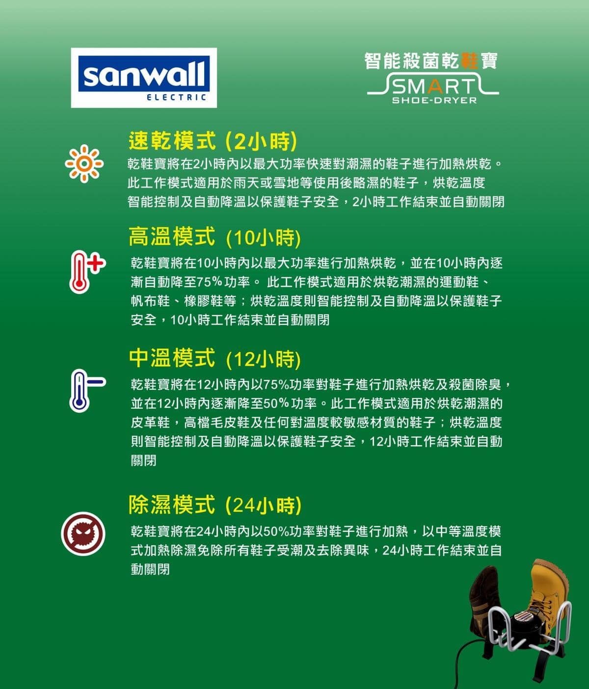 Sanwall SWR-02TM 智慧殺菌乾鞋寶(兩對裝)是護理鞋履的實用好物,帶來全智能4種乾鞋模式,2小時快速乾鞋適用雨天雪地後,10小時高溫模式匹配運動鞋等,12小時低溫模式呵護皮革製品,24小時恆溫模式可防黴防潮。它能快速烘乾濕鞋,釋放臭氧O3殺滅99.97%細菌,有效去除潮濕與異味,防止黴菌滋生,同時保持鞋型與顏色,延長鞋履使用壽命。產品採用轉動摺疊設計,摺疊後體積小巧省空間,45W低功率比一般燈泡更省電,230VAC輸入搭配安全設計,耐用可靠,提供1年保養,是大人小孩守護足部健康的好幫手。
