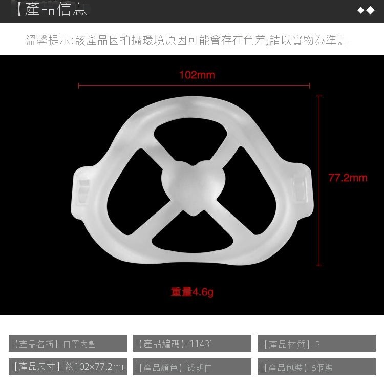 Outlet Express HK 生活百貨城在香港觀塘提供 拋棄式口罩內墊支架(5個)立體口罩支架拋棄式內托墊不貼嘴鼻支撐透氣不染口紅架 11437 - 透明白102x77.2mm 在那裡買邊到買或邊度買代理資料及價錢實惠借批發優惠以及公司學校報價,更可送到香港或澳門而部份產品比團購更優惠,更可以為你推薦推介相似產品及優點缺點,請留意我們最新產品價格更新。