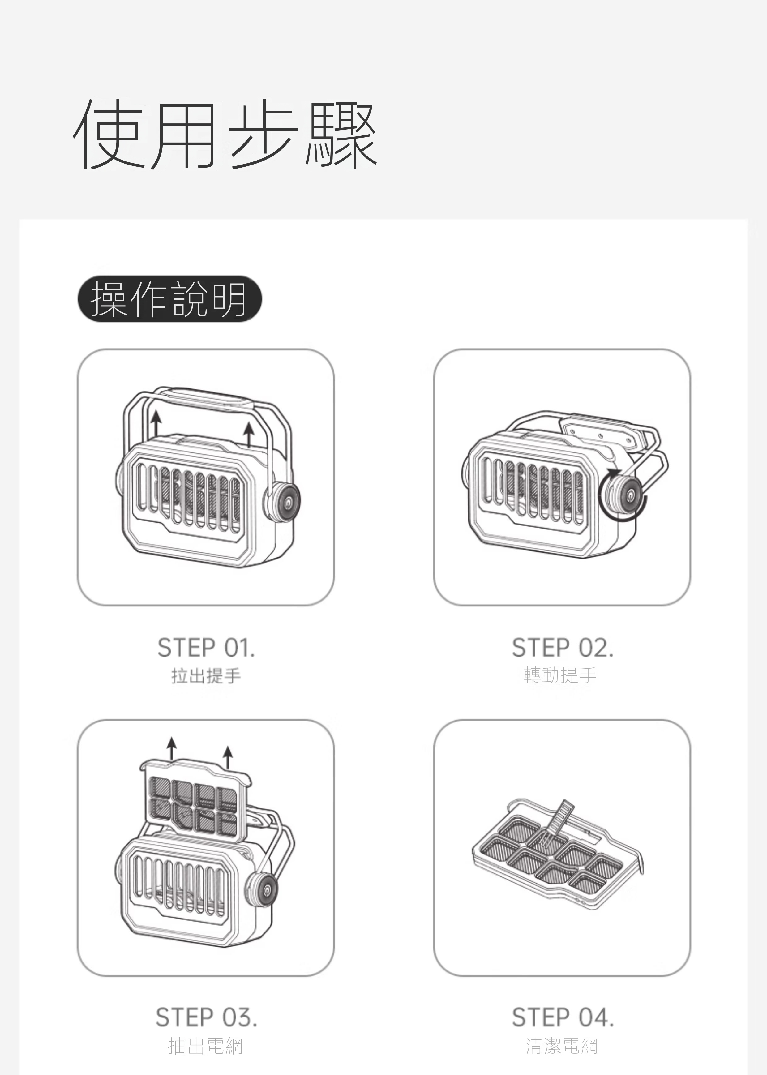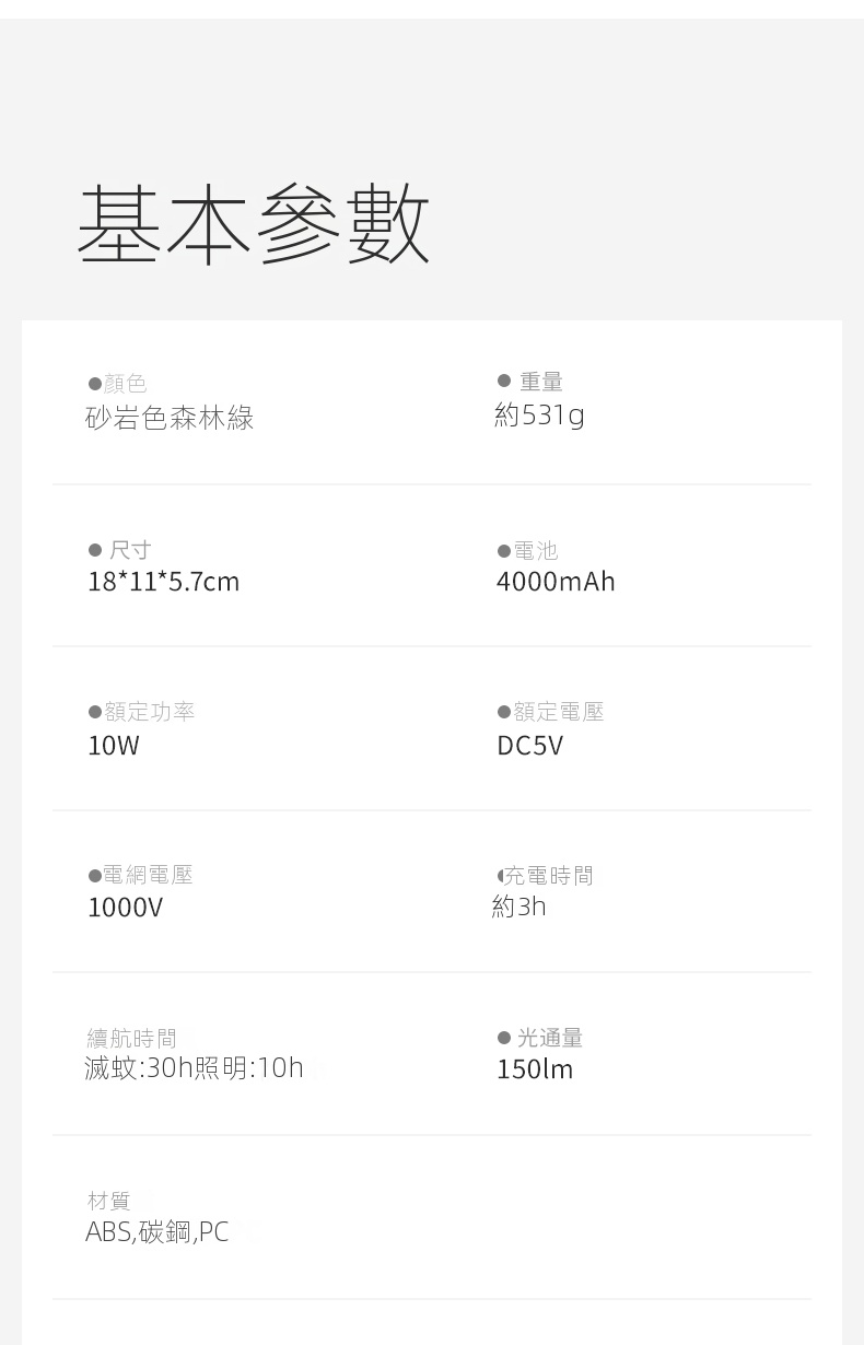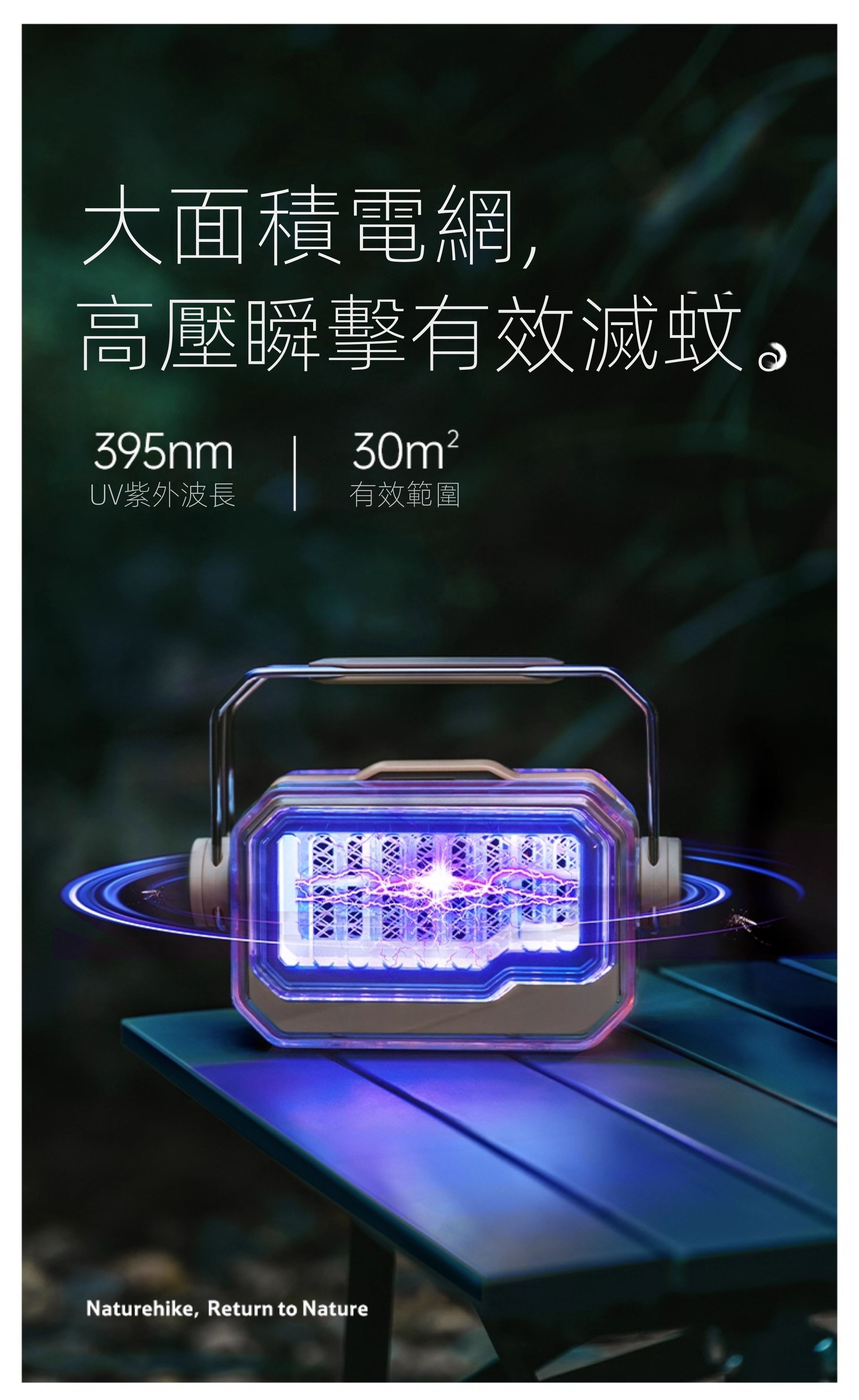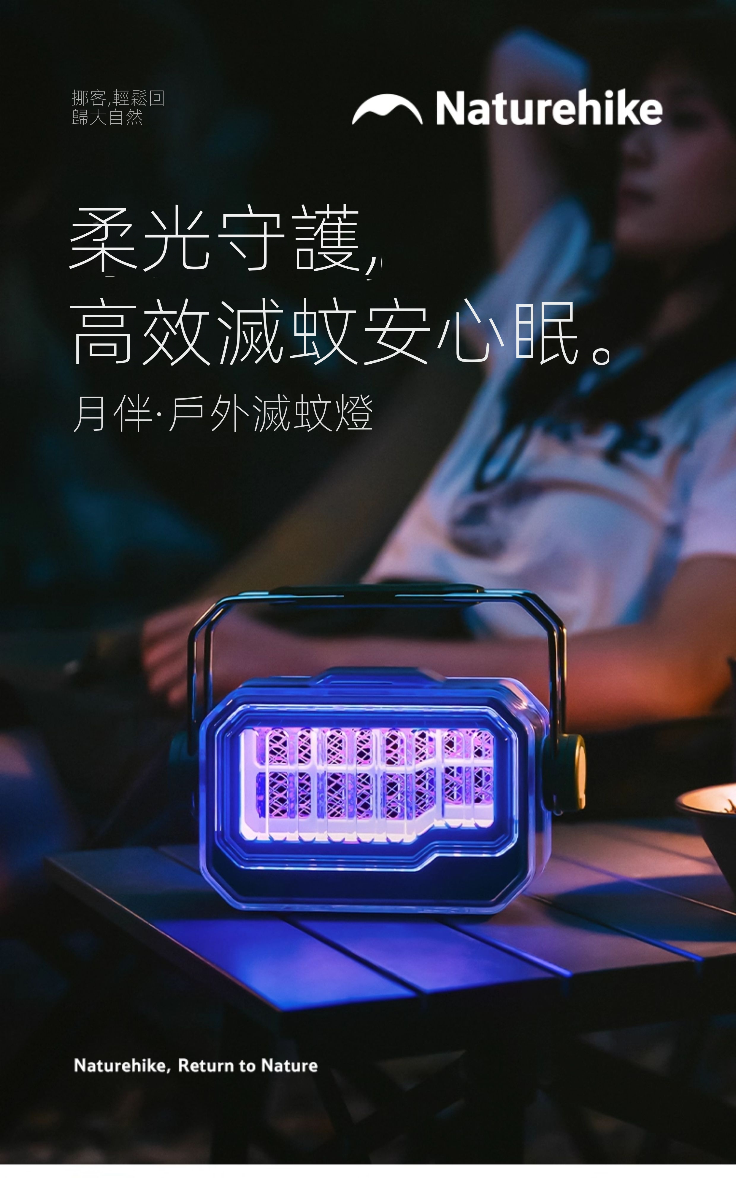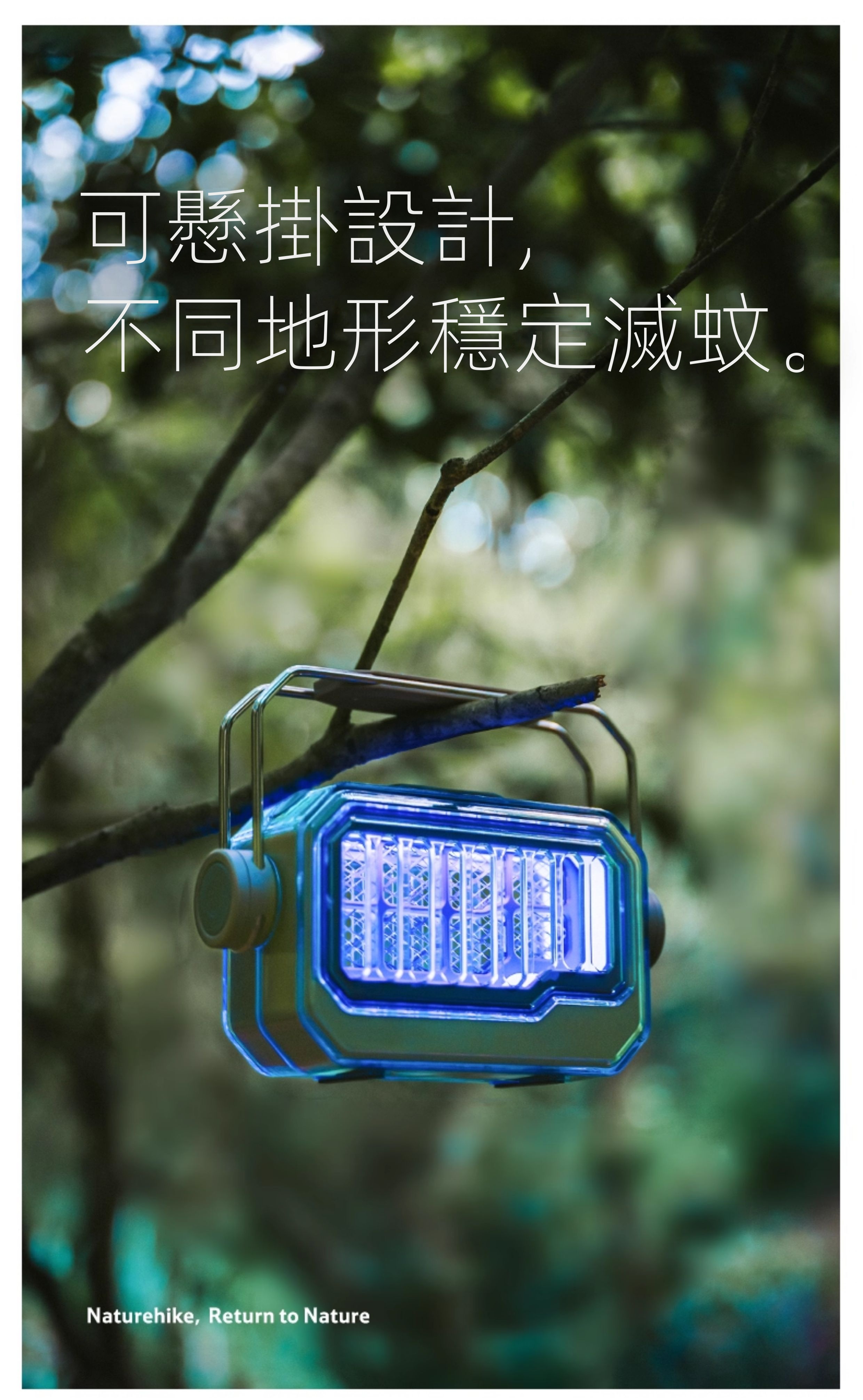Naturehike 月伴戶外滅蚊照明兩用燈,採用395nm紫光誘捕技術,高效吸引並瞬間擊殺蚊蟲,安全無化學添加。具備可拆卸電網設計,搭配內置清潔刷,維護輕鬆方便。支援照明與滅蚊雙模式切換,滿足多樣需求。搭載4000mAh大容量電池,續航長達30小時,適合露營、野餐等戶外場景。可懸掛設計,適用不同地形,提供穩定防蚊保護。