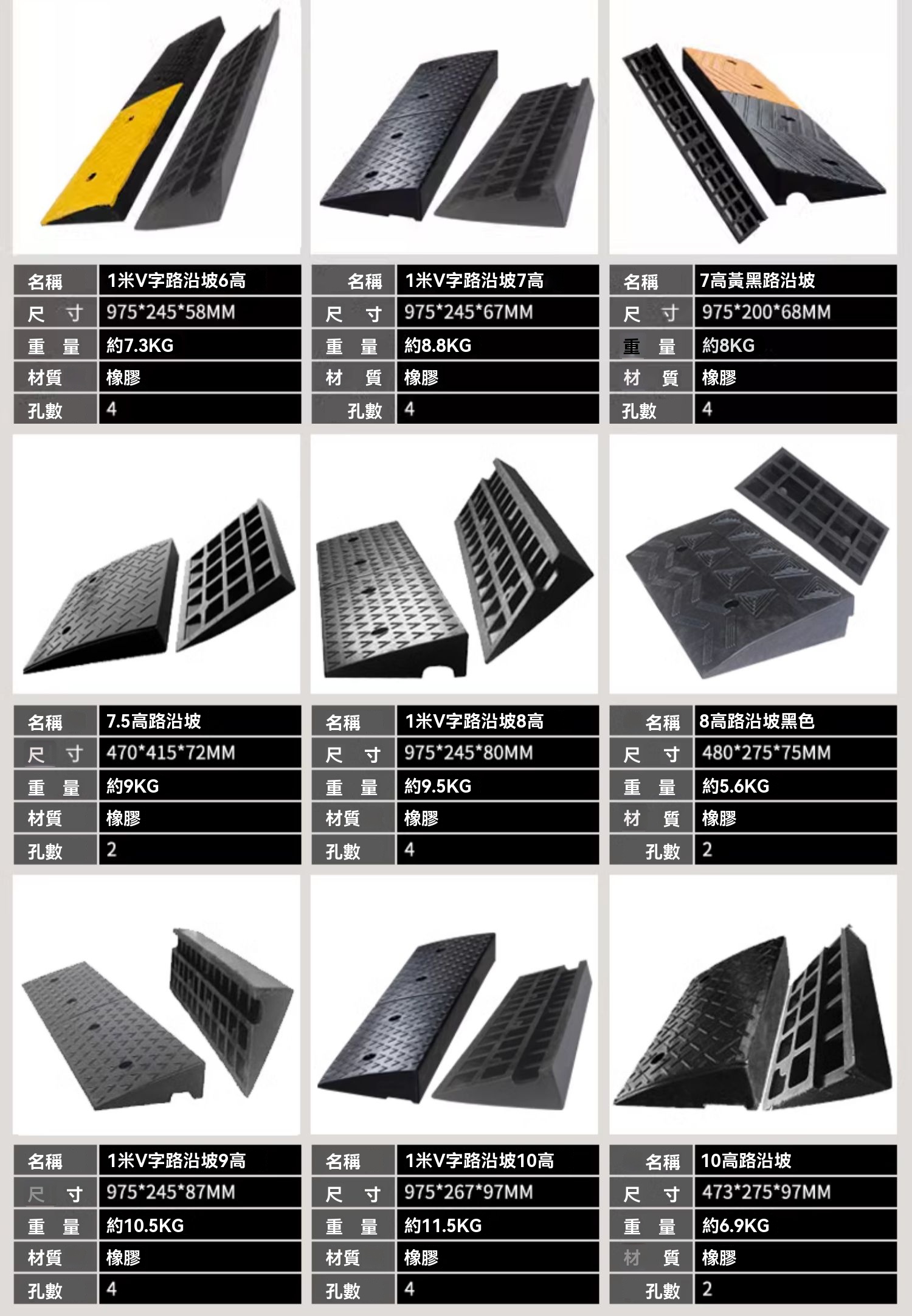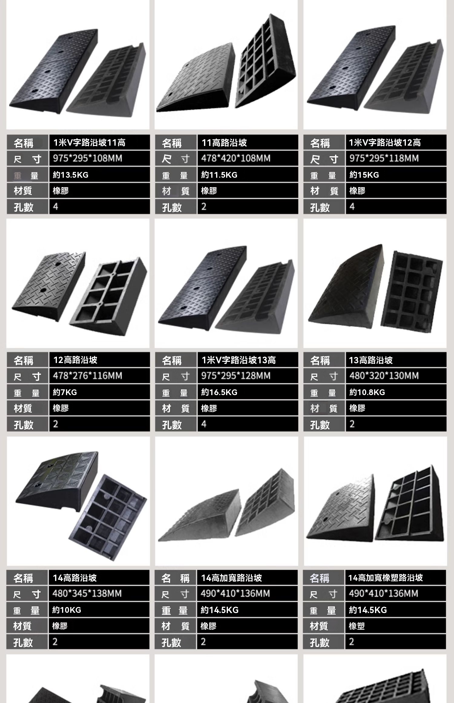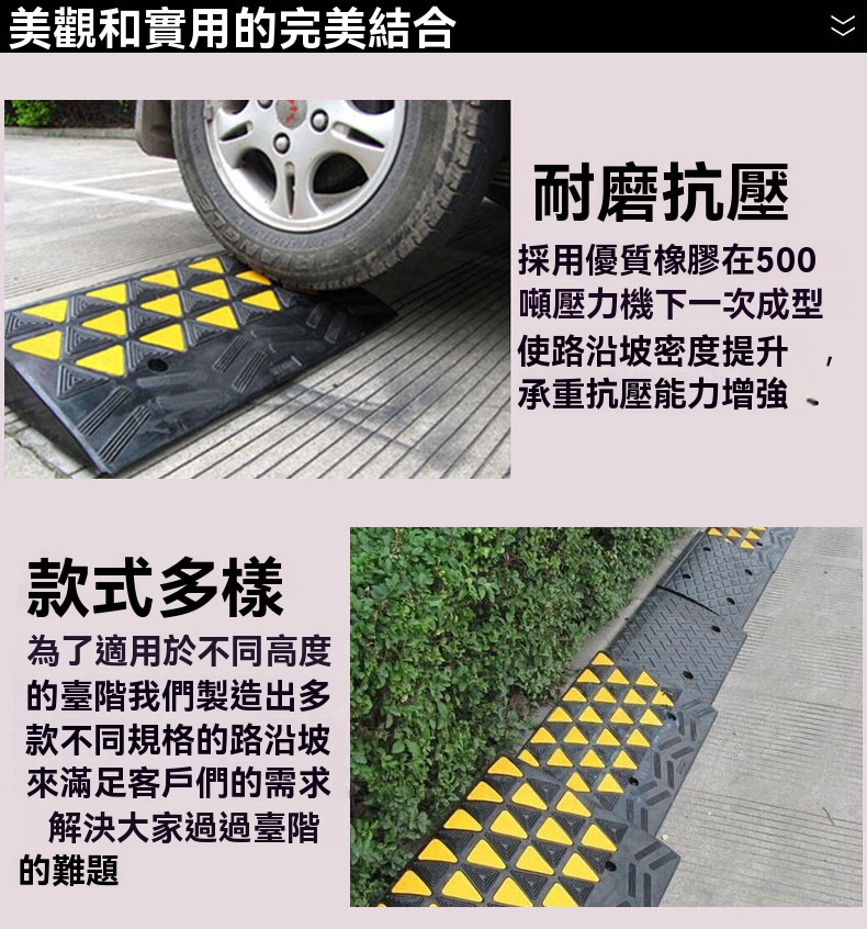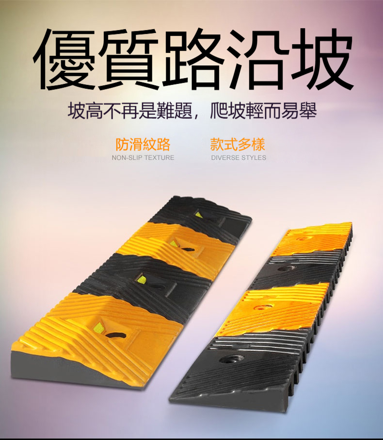 專為汽車、貨車設計的路沿爬坡墊,是出行裝載、停靠的實用好幫手!精選高品質高強橡膠打造,質地堅韌耐壓,承重力強且經久耐用,能有效減少車輛上下路沿時的磨損,通行過程平穩無噪音,減震防護效果拉滿。黃黑相間的醒目配色(部分為黑色),白天夜晚都能清晰識別,安全辨識度超高。科學坡度設計搭配防滑坡面,即便雨雪天氣也能牢牢抓地,避免車輪打滑,全方位守護路沿石與車輛安全。安裝超便捷,採用標準塊狀組合與“內膨脹錨固技術”,螺絲固定地面穩固不鬆動,面對車輛撞擊也不易移位。多種規格可選,適合不同車型與場景,不管是物流站點、停車場或私人場地,都是提升通行安全性與便利性的優質選擇!