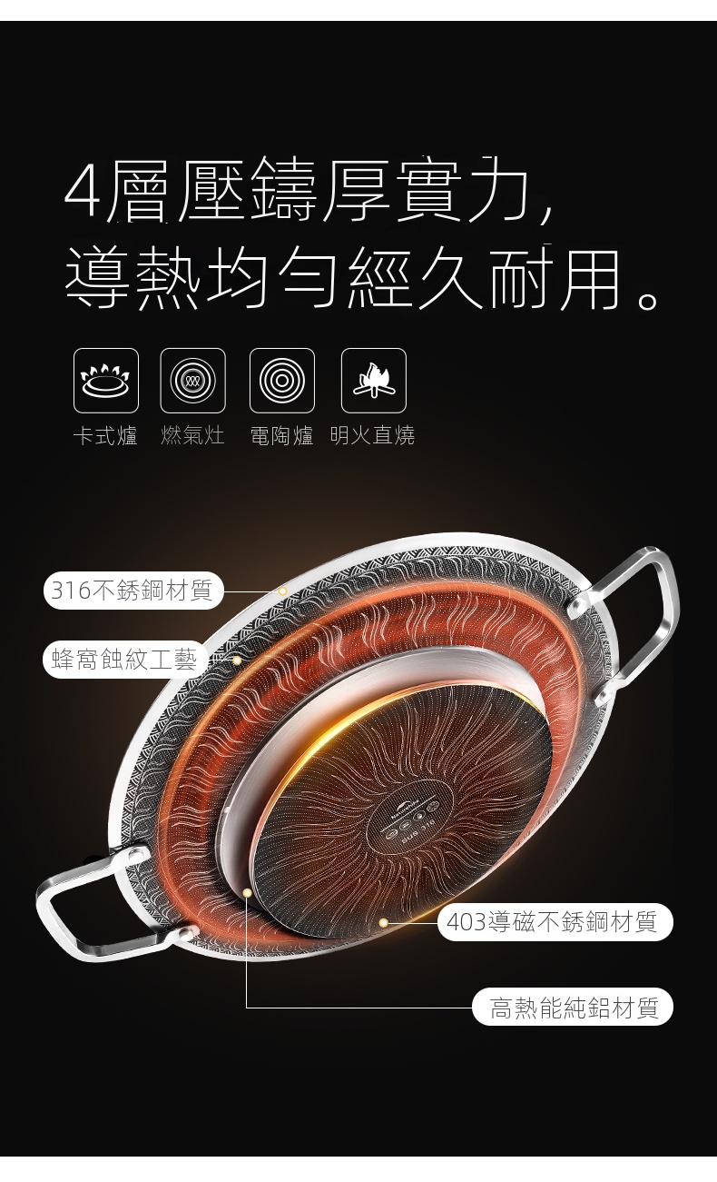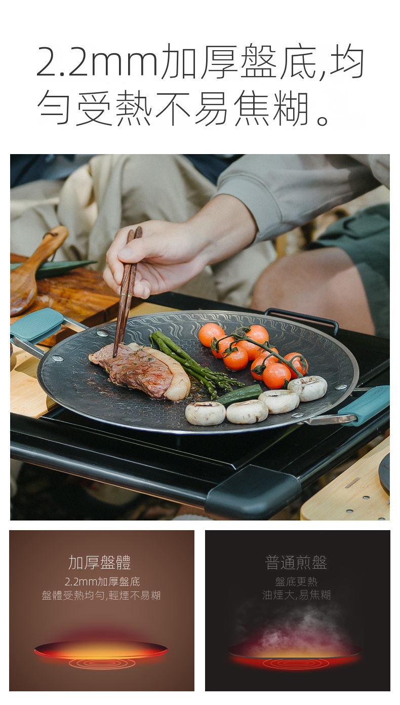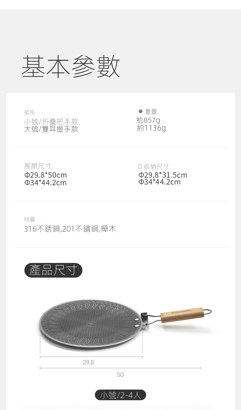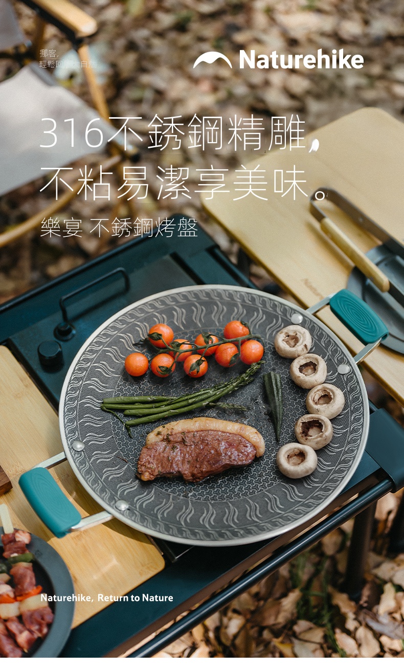 Naturehike 樂宴不銹鋼烤盤,採用316不鏽鋼精工打造,搭配蜂窩盤面設計,具備優異不粘性能與快速導熱效果。4層壓鑄結構,加厚盤底,受熱均勻不易焦糊,適合煎、炒、烤多種料理。一擦即淨,清潔輕鬆省力,搭配收納袋便於攜帶。適用卡式爐、明火等多種熱源,戶外露營或居家使用皆宜,讓美味無負擔。