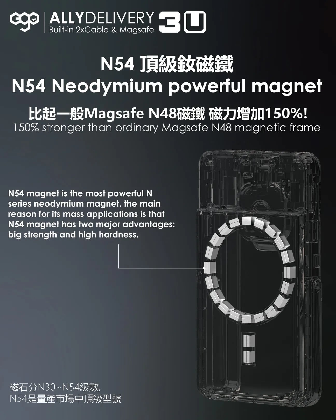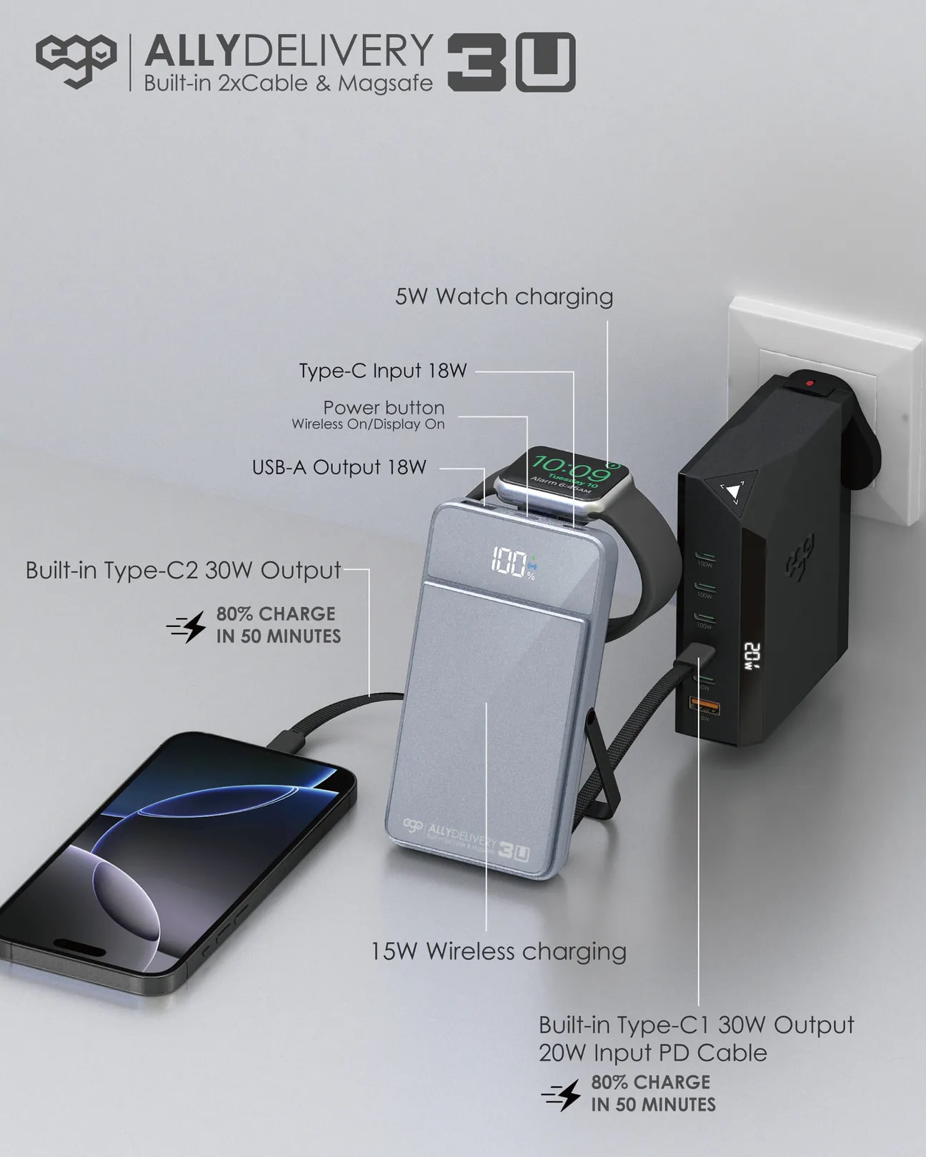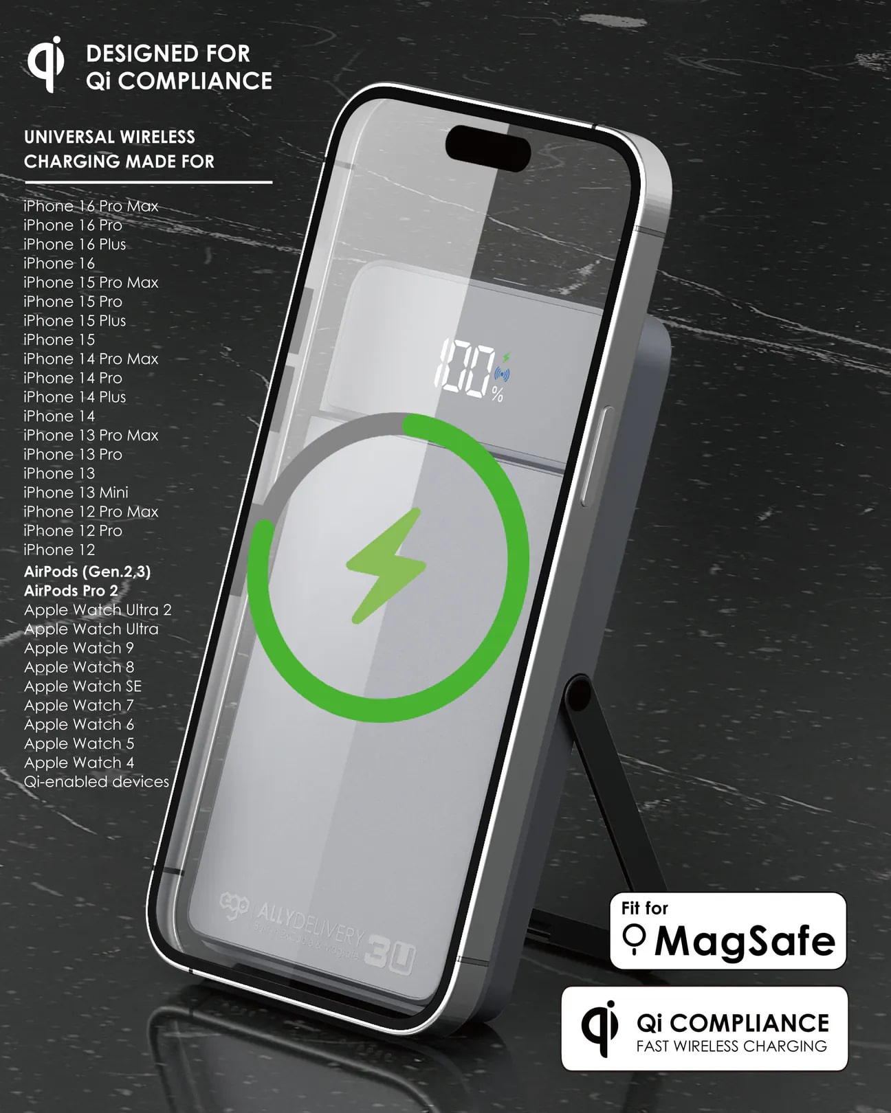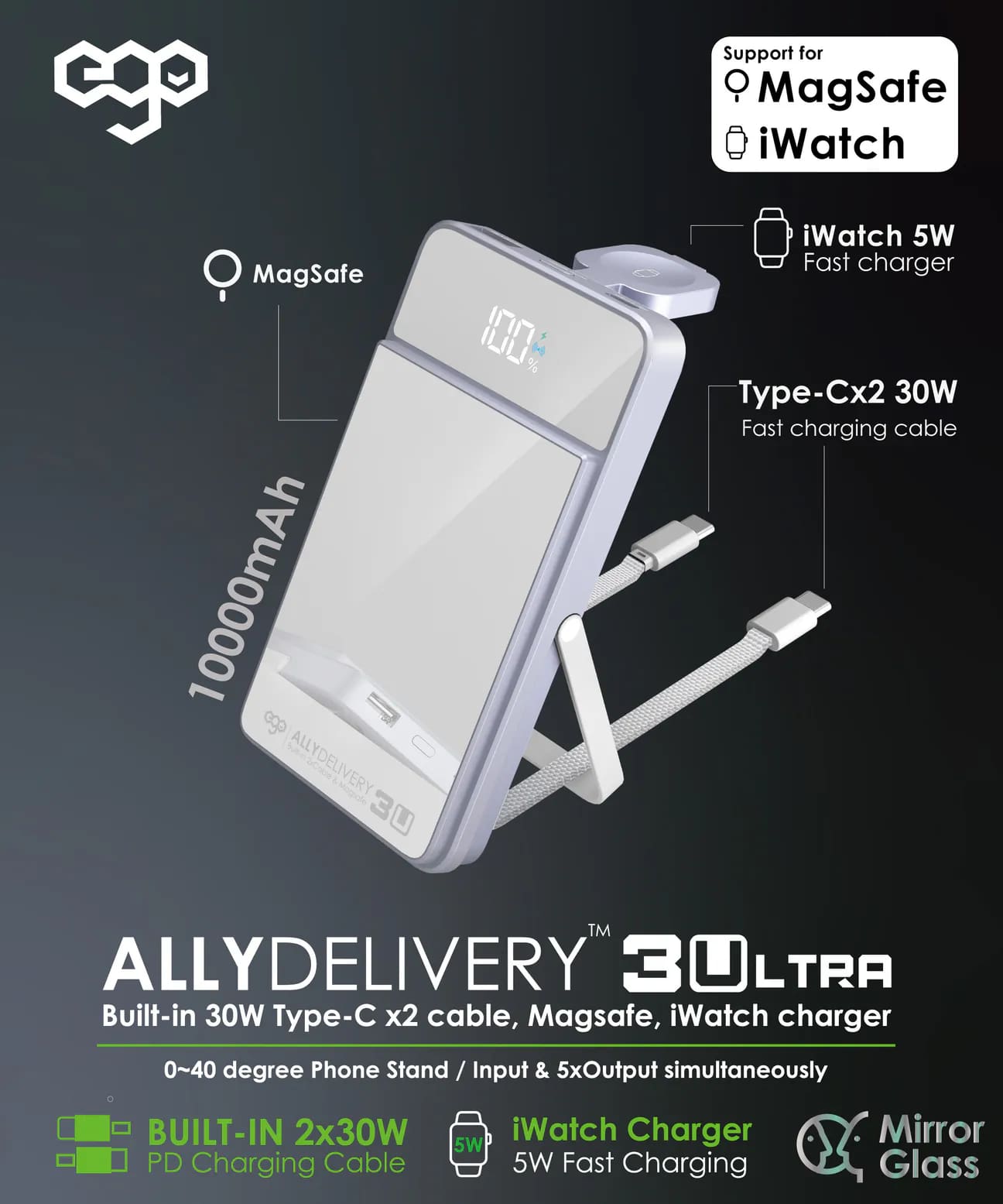 AllyDelivery 3Ux2C 版本行動電源,容量 10000mAh,是追求極速快充用戶的優質選擇。內建雙 Type-C 線,支援 30W PD 快充,iPhone 最高適配 27W、Pro Max 可實現 30W 滿速快充,新增手錶充電模組,5W 快充效率達 1 分鐘充 1%。內建線升級為尼龍編織材質,耐用度大幅提升 200%,搭配 Magsafe 無線充功能與 N54 釹磁鐵,磁力強勁吸附穩固。配備 LED 顯示系統,清楚呈現電量剩餘、快充模式及無線充工作狀態,最多可同時為本機加 4 部設備充電,滿足多設備供電需求。機身整合手機支架功能,支援 Standby mode,讓你愜意觀看影片;白色與紫色款式採用鏡面玻璃設計,兼顧實用與美觀。