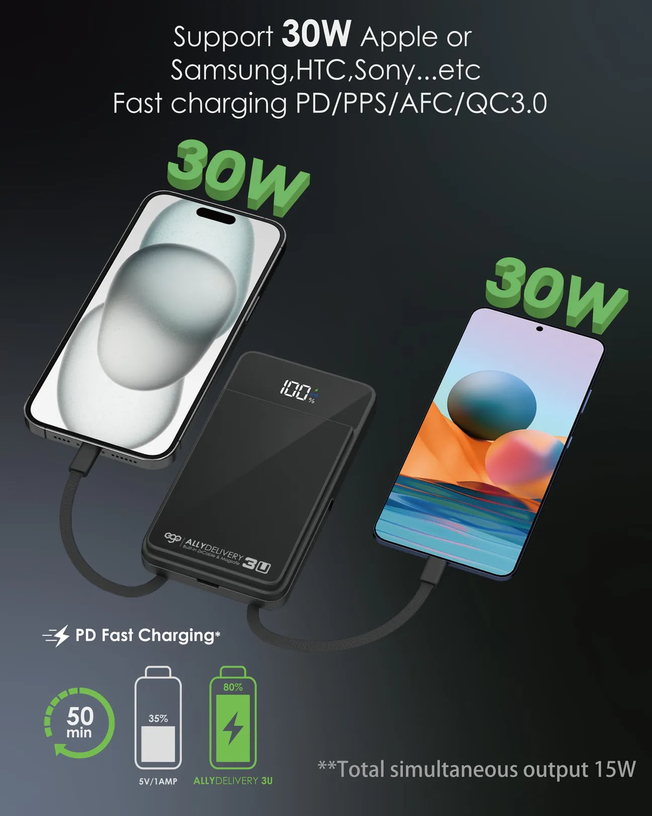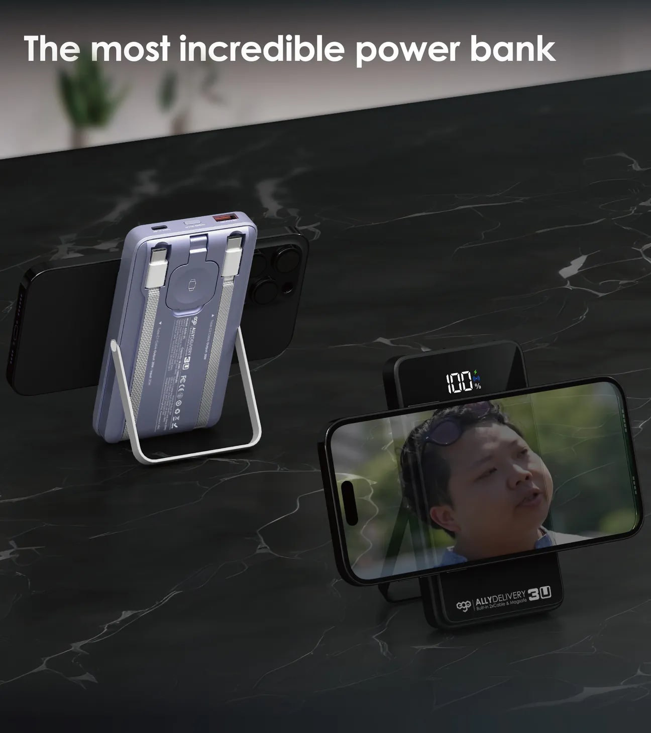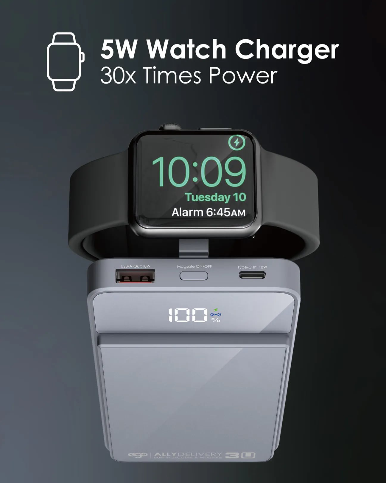 AllyDelivery 3Ux2C 版本行動電源,容量 10000mAh,是追求極速快充用戶的優質選擇。內建雙 Type-C 線,支援 30W PD 快充,iPhone 最高適配 27W、Pro Max 可實現 30W 滿速快充,新增手錶充電模組,5W 快充效率達 1 分鐘充 1%。內建線升級為尼龍編織材質,耐用度大幅提升 200%,搭配 Magsafe 無線充功能與 N54 釹磁鐵,磁力強勁吸附穩固。配備 LED 顯示系統,清楚呈現電量剩餘、快充模式及無線充工作狀態,最多可同時為本機加 4 部設備充電,滿足多設備供電需求。機身整合手機支架功能,支援 Standby mode,讓你愜意觀看影片;白色與紫色款式採用鏡面玻璃設計,兼顧實用與美觀。
