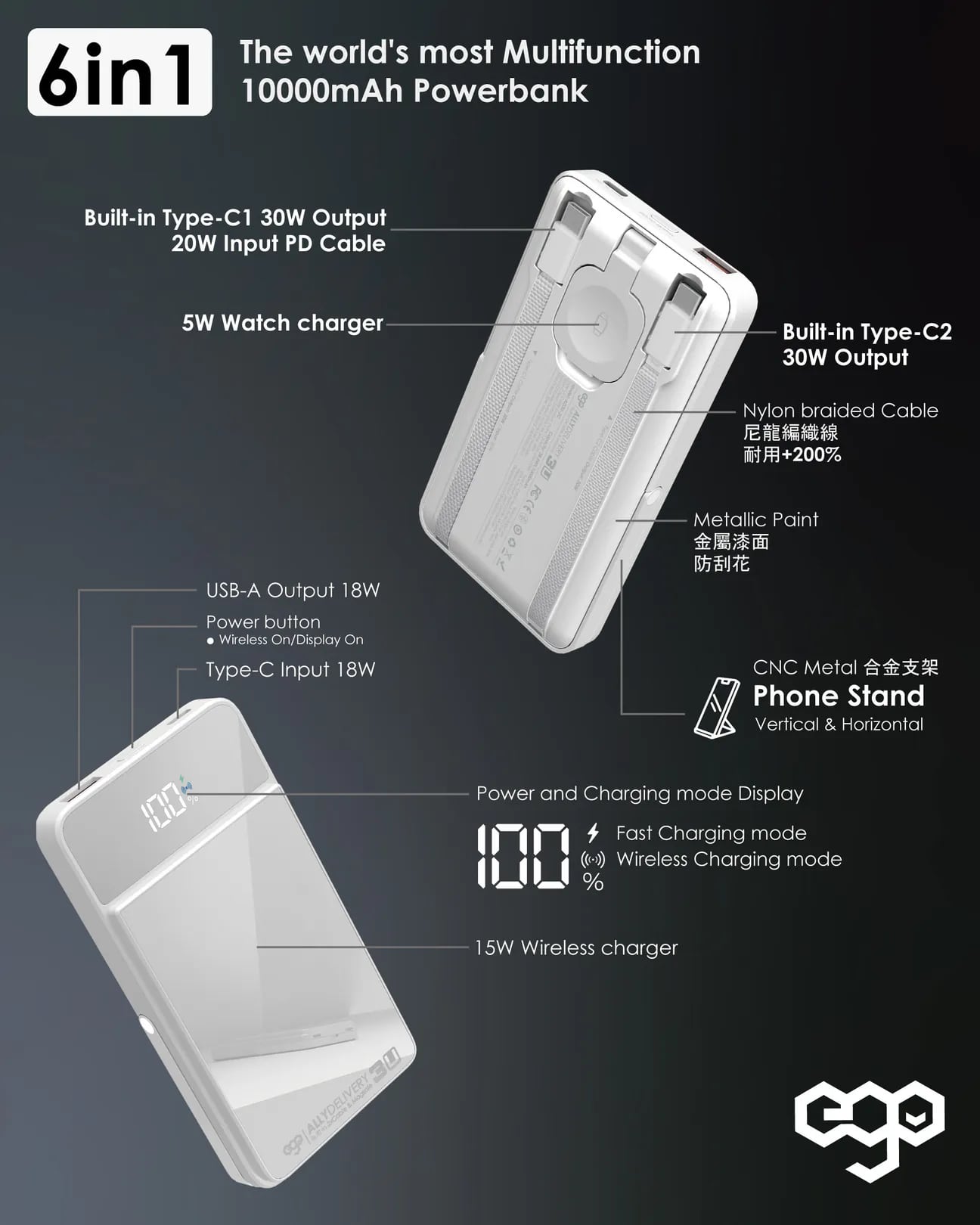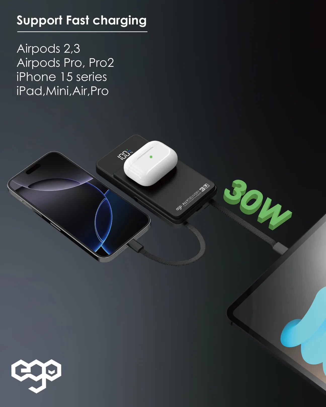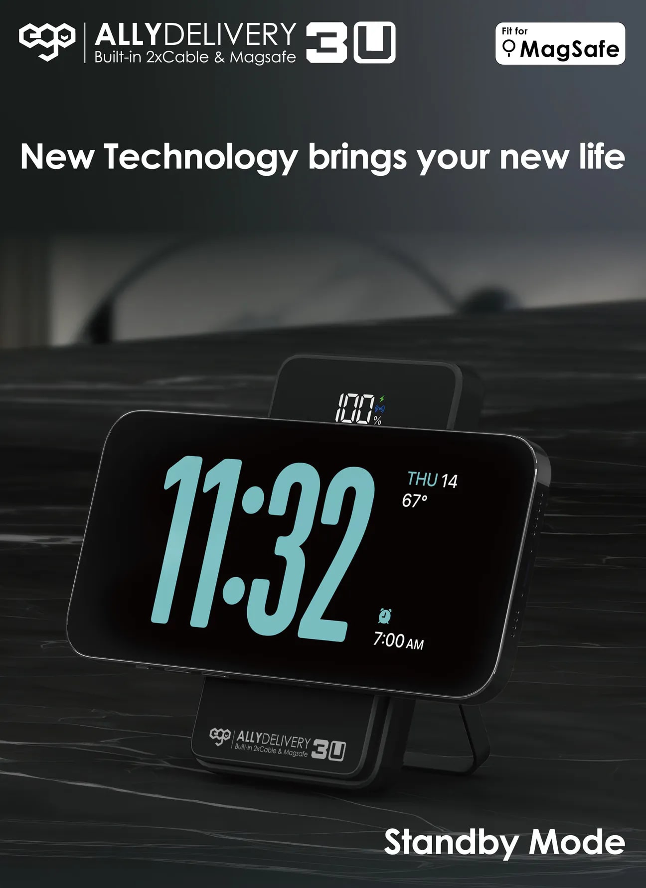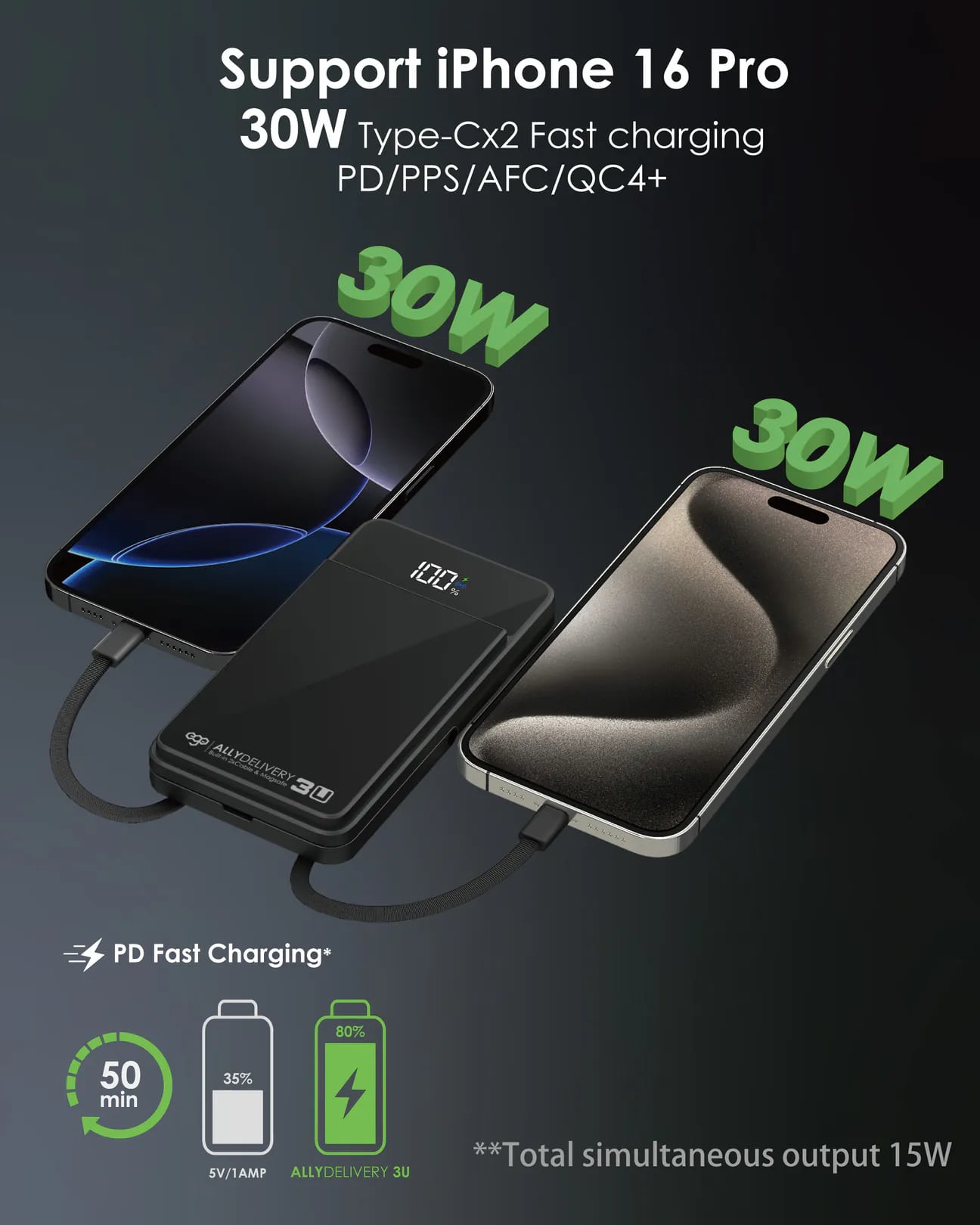 AllyDelivery 3Ux2C 版本行動電源,容量 10000mAh,是追求極速快充用戶的優質選擇。內建雙 Type-C 線,支援 30W PD 快充,iPhone 最高適配 27W、Pro Max 可實現 30W 滿速快充,新增手錶充電模組,5W 快充效率達 1 分鐘充 1%。內建線升級為尼龍編織材質,耐用度大幅提升 200%,搭配 Magsafe 無線充功能與 N54 釹磁鐵,磁力強勁吸附穩固。配備 LED 顯示系統,清楚呈現電量剩餘、快充模式及無線充工作狀態,最多可同時為本機加 4 部設備充電,滿足多設備供電需求。機身整合手機支架功能,支援 Standby mode,讓你愜意觀看影片;白色與紫色款式採用鏡面玻璃設計,兼顧實用與美觀。