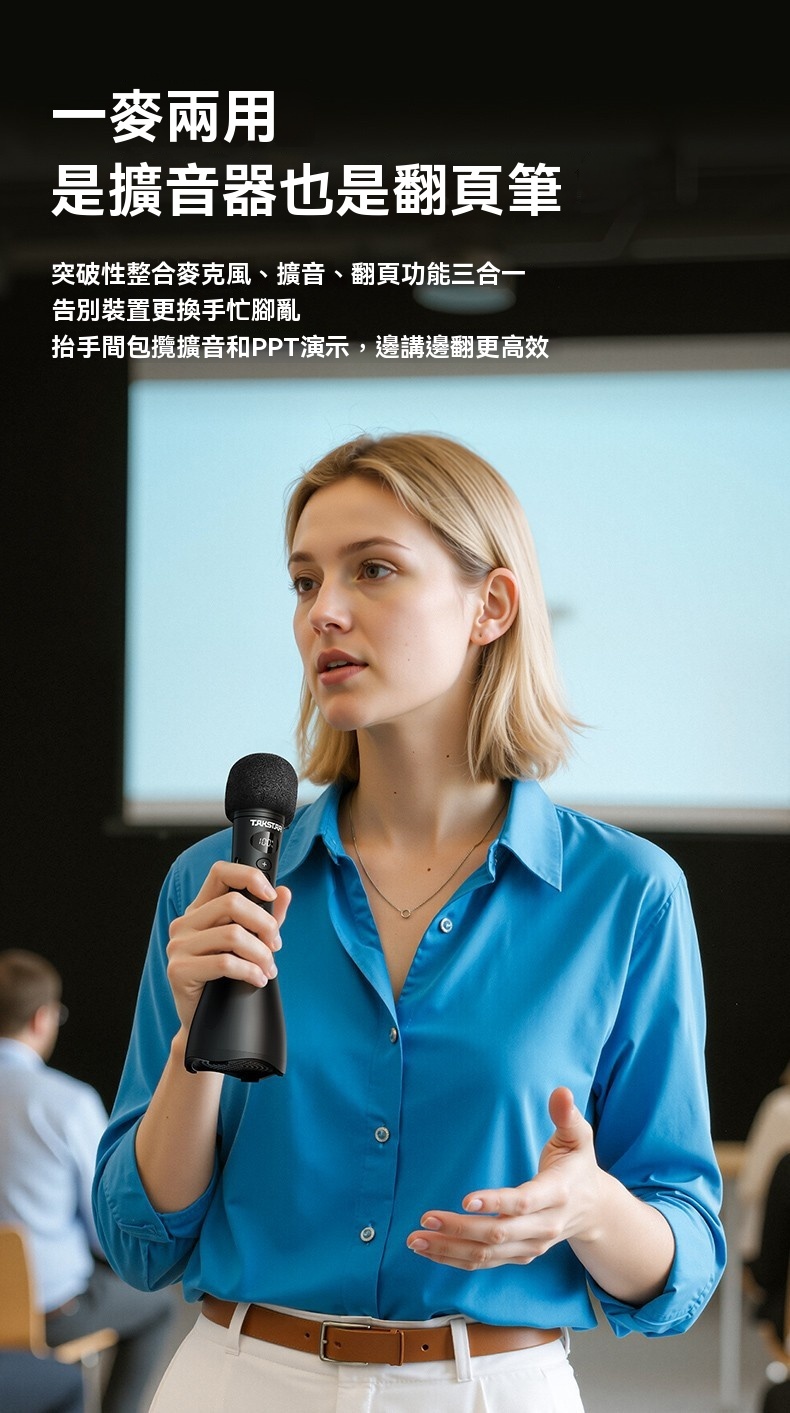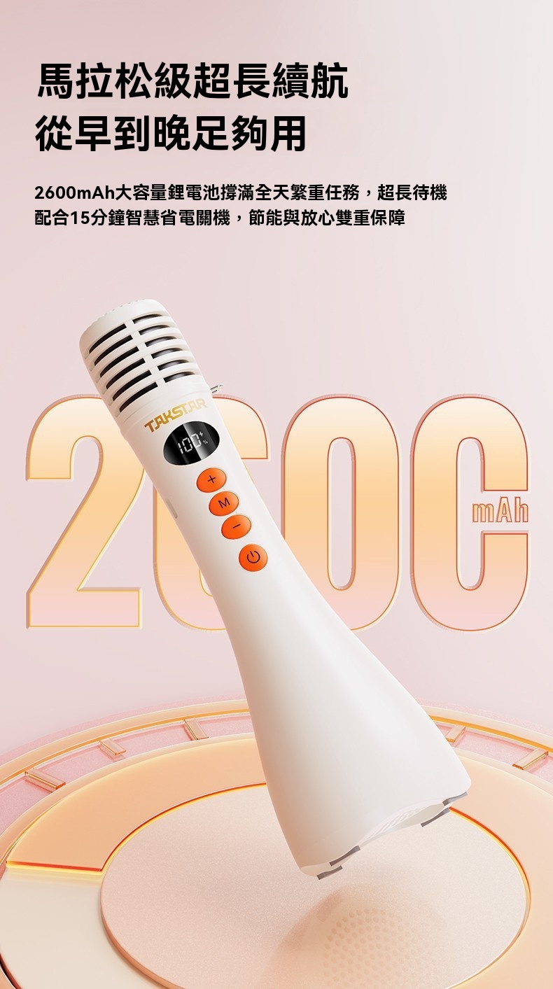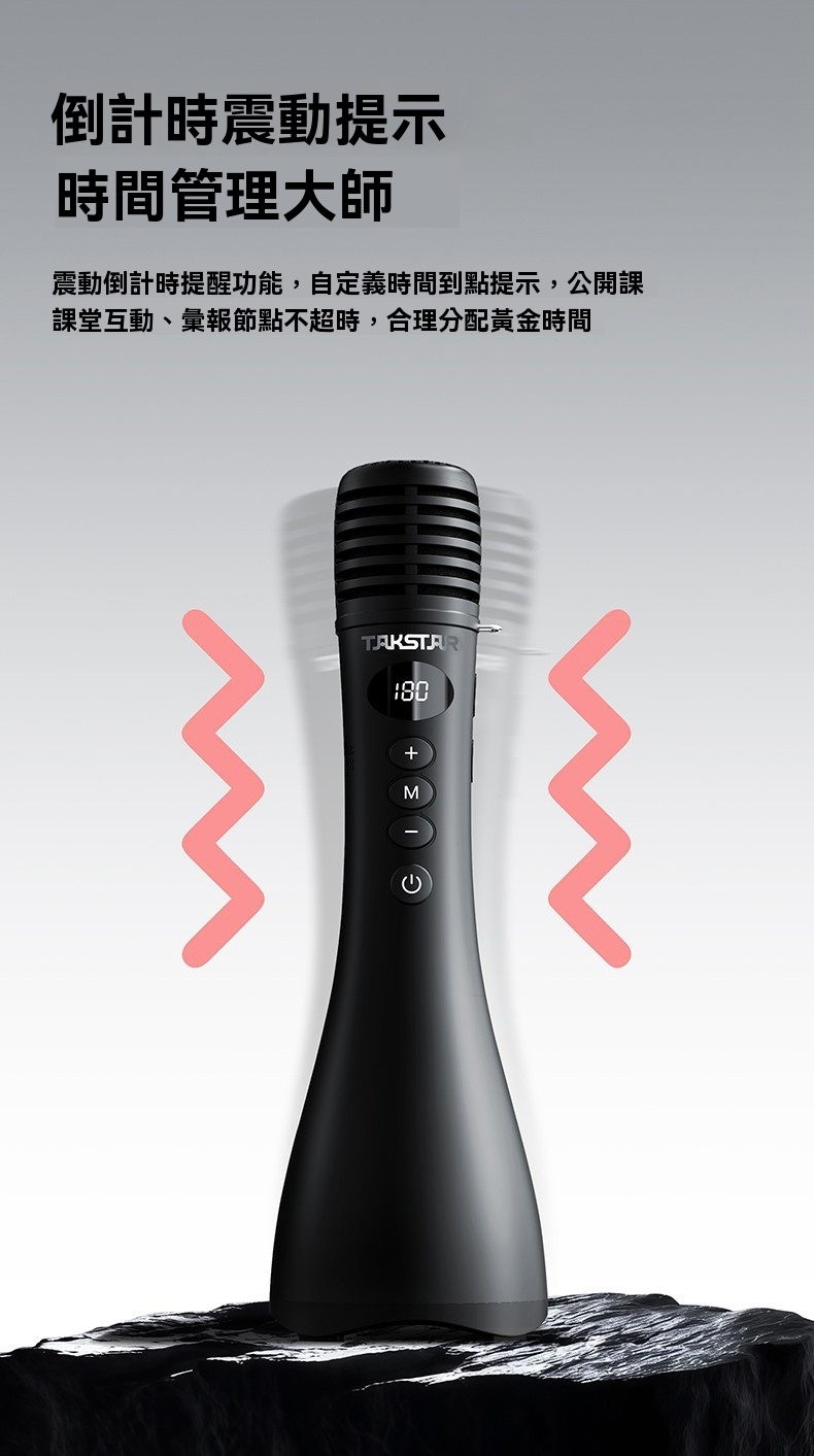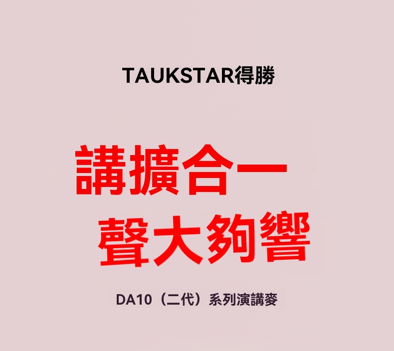 Takstar DA10 2 代黑色演講麥克風,集麥克風、擴大機、揚聲器於一體,開機即講免配對,適配教學培訓、宣傳促銷、K 歌等多場景。搭載 15W 全音域喇叭,高保真音質飽滿立體,聲量強勁,室內約覆蓋 200 人、室外約 100 人,嘈雜環境也能清晰傳聲。內建 DSP 嘯叫抑制晶片,雙重防嘯叫設計,久聽無刺耳雜音。高畫質顯示即時顯示電量、音量,倒數震動提示精準控時,多音效模式一鍵切換操作方便。續航力約 10 小時,15 分鐘智慧關機節能,支援 V5.3 無線暢連多設備,機身僅 227g 輕巧便攜,長時間手持演講無壓力。