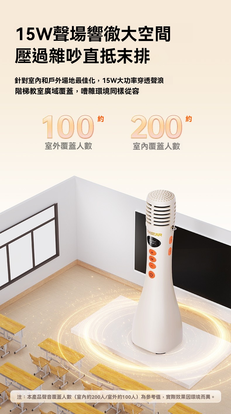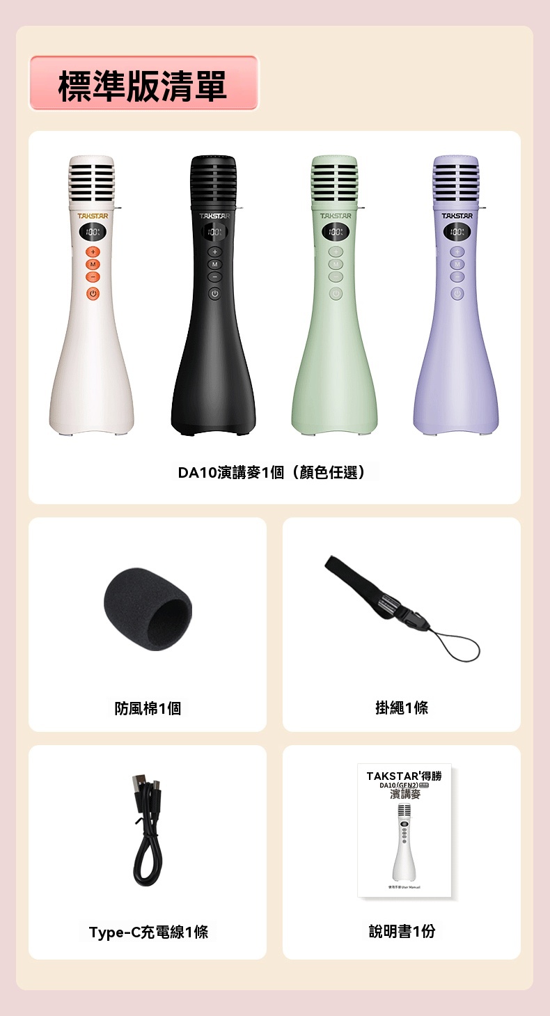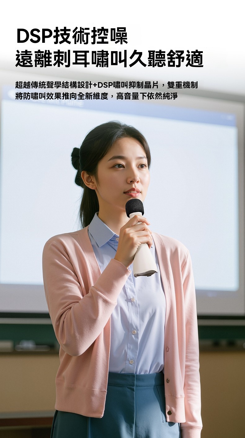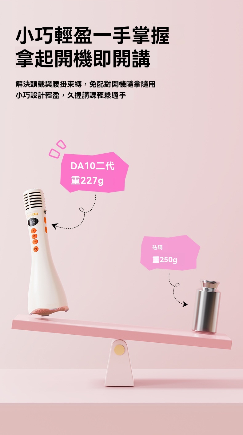 Takstar DA10 2 代黑色演講麥克風,集麥克風、擴大機、揚聲器於一體,開機即講免配對,適配教學培訓、宣傳促銷、K 歌等多場景。搭載 15W 全音域喇叭,高保真音質飽滿立體,聲量強勁,室內約覆蓋 200 人、室外約 100 人,嘈雜環境也能清晰傳聲。內建 DSP 嘯叫抑制晶片,雙重防嘯叫設計,久聽無刺耳雜音。高畫質顯示即時顯示電量、音量,倒數震動提示精準控時,多音效模式一鍵切換操作方便。續航力約 10 小時,15 分鐘智慧關機節能,支援 V5.3 無線暢連多設備,機身僅 227g 輕巧便攜,長時間手持演講無壓力。