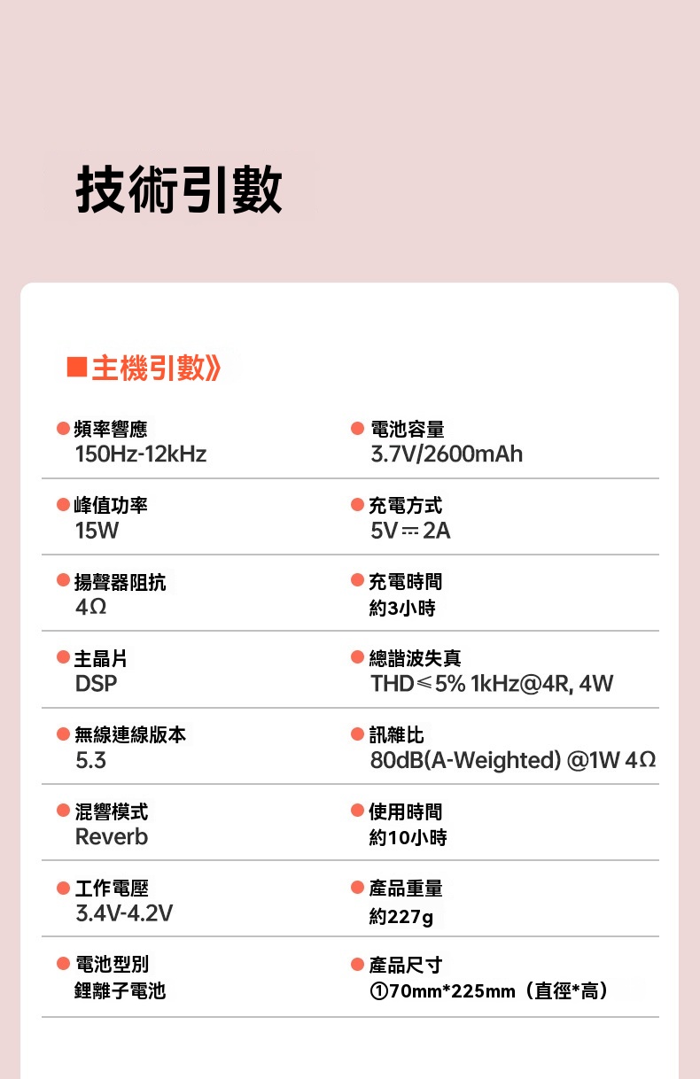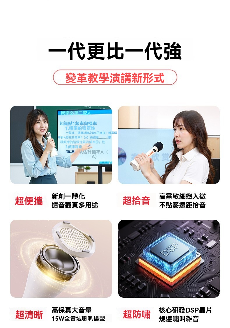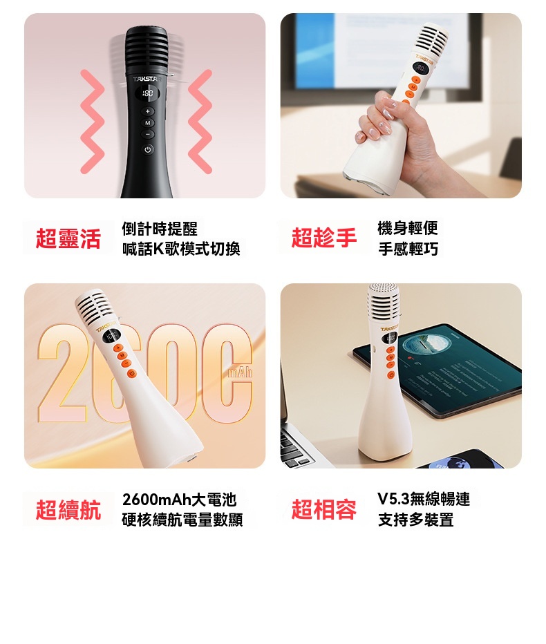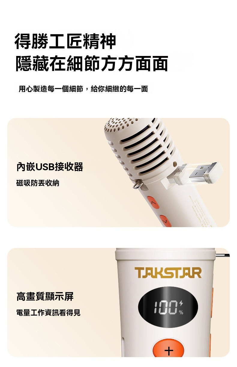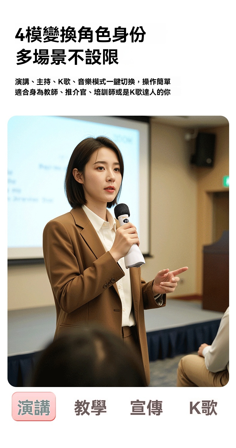 Takstar DA10 2 代黑色演講麥克風,集麥克風、擴大機、揚聲器於一體,開機即講免配對,適配教學培訓、宣傳促銷、K 歌等多場景。搭載 15W 全音域喇叭,高保真音質飽滿立體,聲量強勁,室內約覆蓋 200 人、室外約 100 人,嘈雜環境也能清晰傳聲。內建 DSP 嘯叫抑制晶片,雙重防嘯叫設計,久聽無刺耳雜音。高畫質顯示即時顯示電量、音量,倒數震動提示精準控時,多音效模式一鍵切換操作方便。續航力約 10 小時,15 分鐘智慧關機節能,支援 V5.3 無線暢連多設備,機身僅 227g 輕巧便攜,長時間手持演講無壓力。