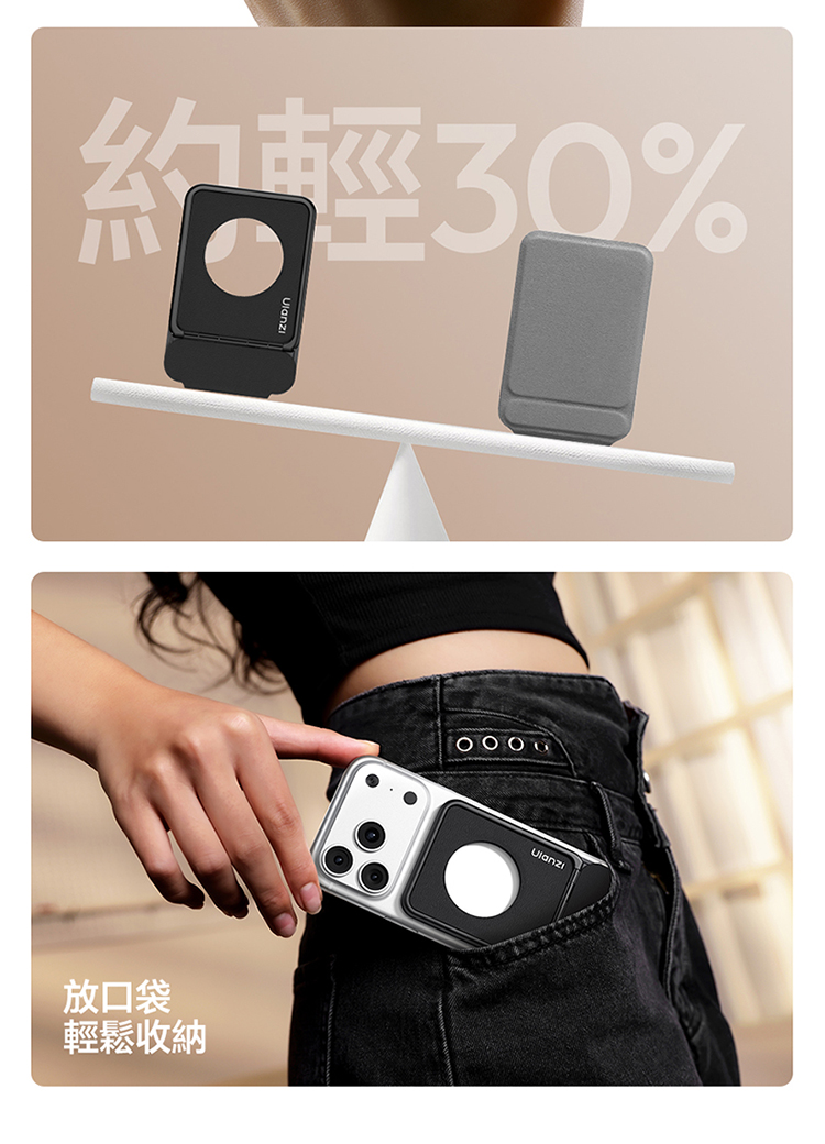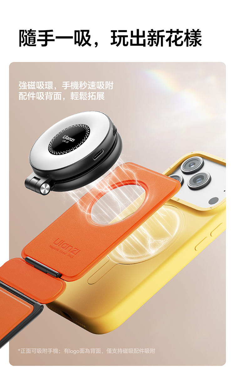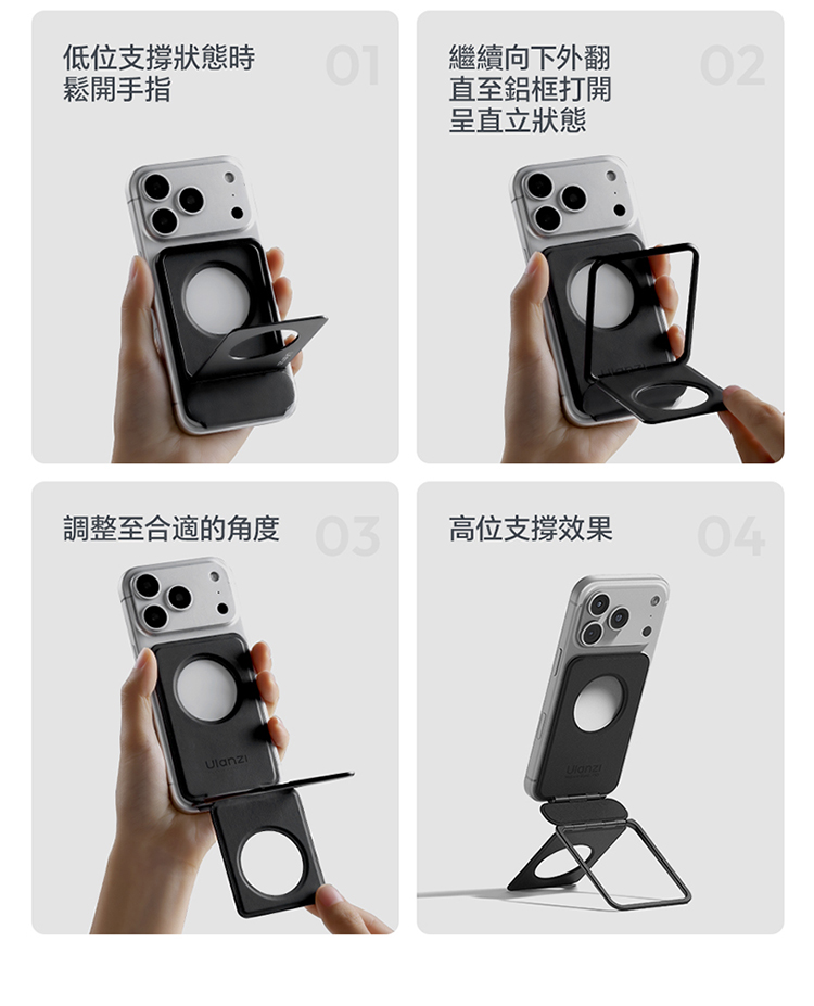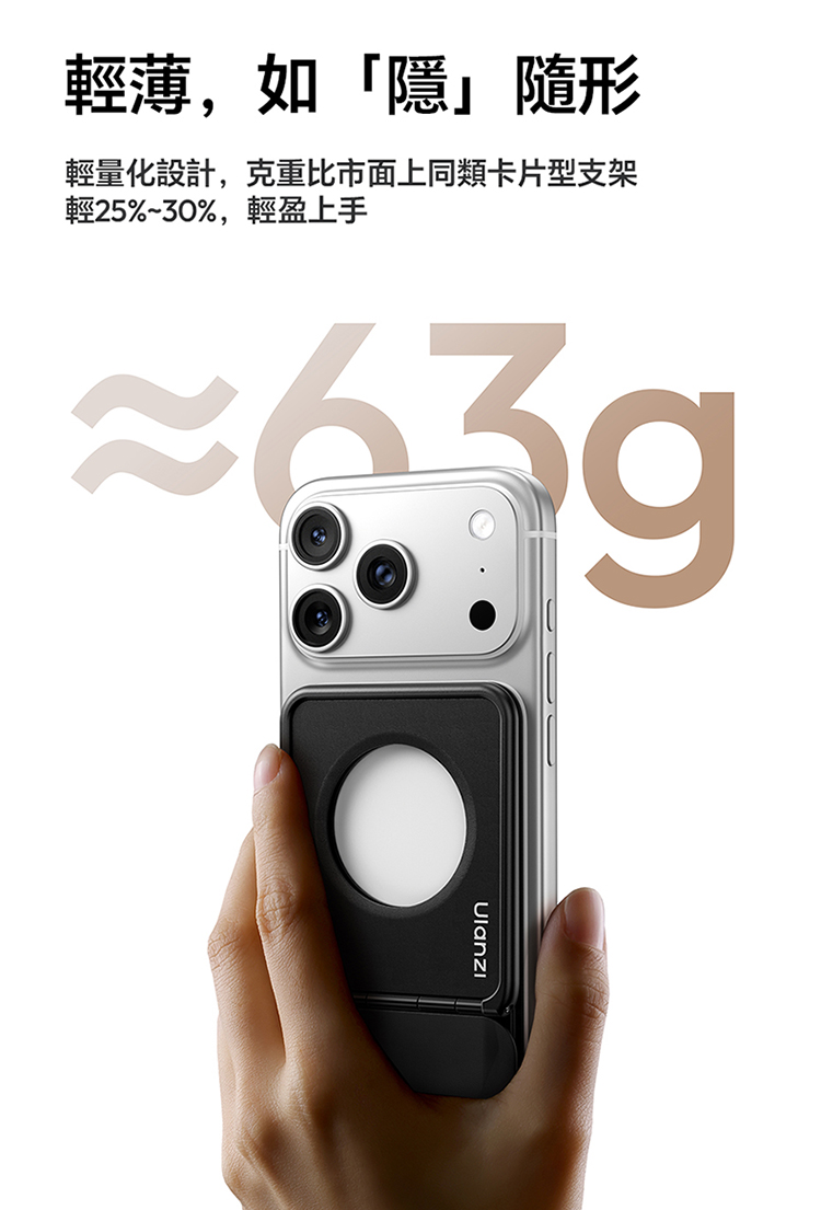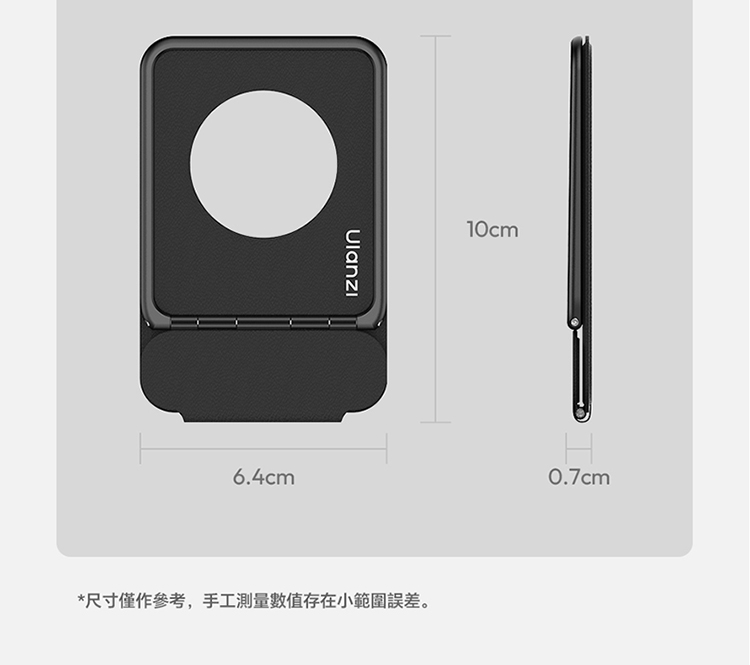 ULANZI PS01 MagSnap 磁吸支架(黑色)是主打強磁吸附的實用好物!採用 MagSnap 磁吸技術,吸附力強勁,貼合設備後穩固不晃,有效杜絕滑落隱憂。適合多種支援 MagSafe 的設備,對位精準,一吸即合,安裝無需複雜操作。機身設計輕薄便攜,體積小巧不佔地,日常收納、通勤攜帶都超方便。黑色外觀簡約大氣,百搭各類使用場景,不管是桌面辦公、居家娛樂,或是戶外臨時使用,都能輕鬆 hold 住。優質材質打造,做工紮實耐用,既能滿足設備固定需求,又能為使用體驗加分,是提升設備實用性的必備配件!