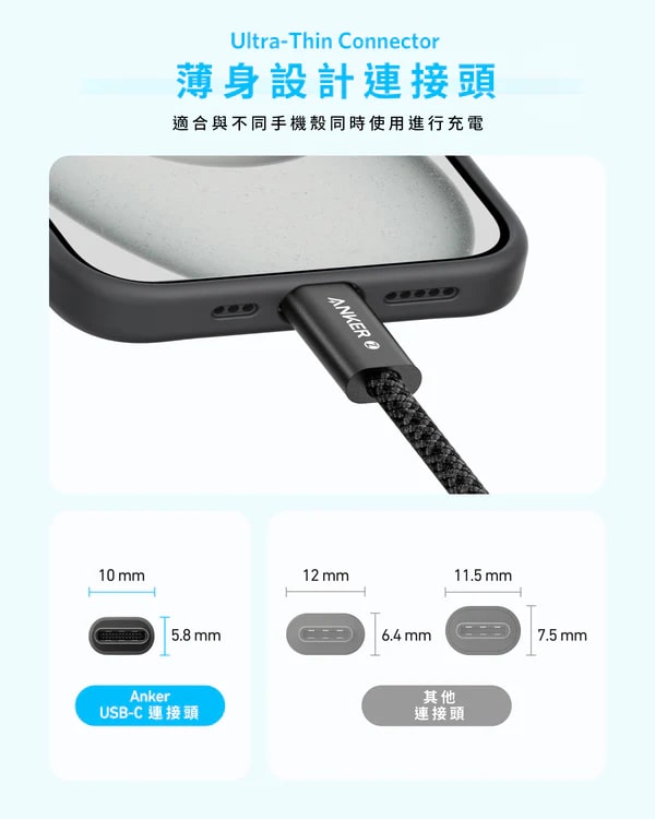 Anker 這款充電線是全球頂尖行動充電品牌力作,獲得 USB-IF 認證,支援 240W 極速快充。搭配 PD 3.1 協議,為 16"MacBook Pro(M3 Pro)充電至 50% 僅需 25 分鐘,iPhone 15 和 Samsung S24 充至 50% 均需 26 分鐘,13" iPad Pro(M4)則需 48 分鐘,還需實現 480Mbps 資料需傳輸。 5.8mm 薄身連接頭設計,適配各類手機殼,無需拆卸即可充電。採用防污塗層編織線,搭配 8 芯線與石墨烯導熱材質,既柔軟整潔又能控溫安全,經 10,000 次折曲測試依舊耐用。長度可選 0.9m 或 1.8m,黑色百搭,兼容蘋果、聯想、惠普、谷歌等多品牌設備,是高效耐用的充電好物。