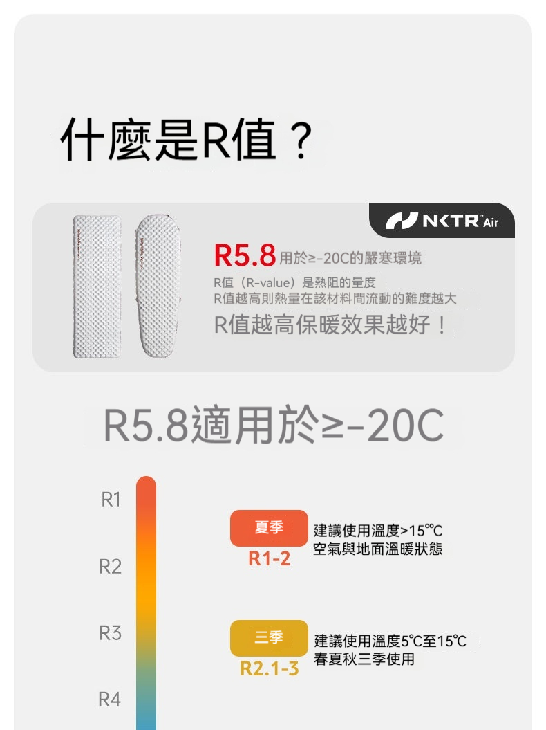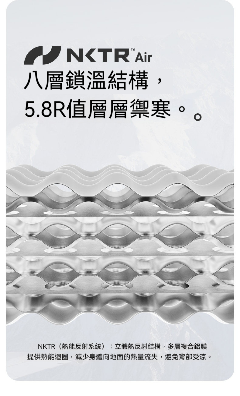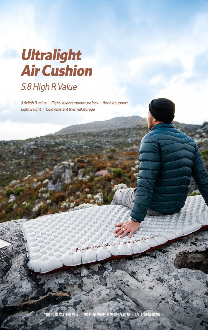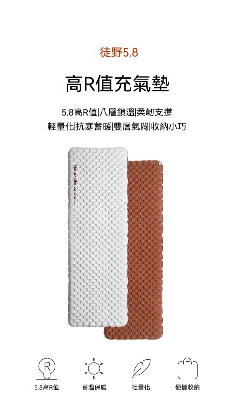 Naturehike 途野 R5.8 超輕量充氣床墊是專為嚴苛環境設計的專業級睡眠裝備。其核心在於高達5.8的R值與獨創的八層鎖溫結構,內含NKTR熱能反射層,能在-20℃的低溫同時,它實現了卓越的輕量化,收納小巧,是雪山攀登、冬季露營等寒冷環境下追求輕量與極致保暖的終極選擇。