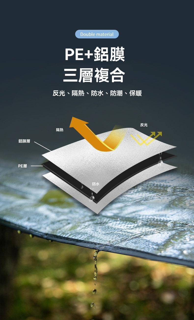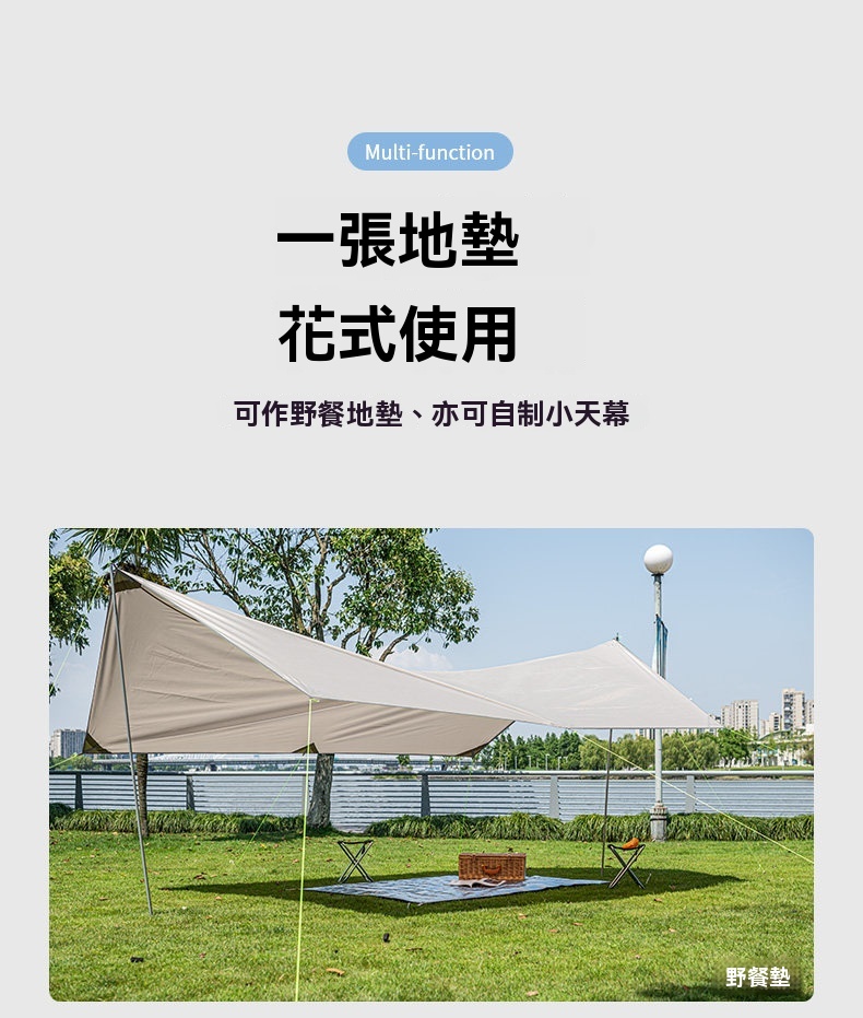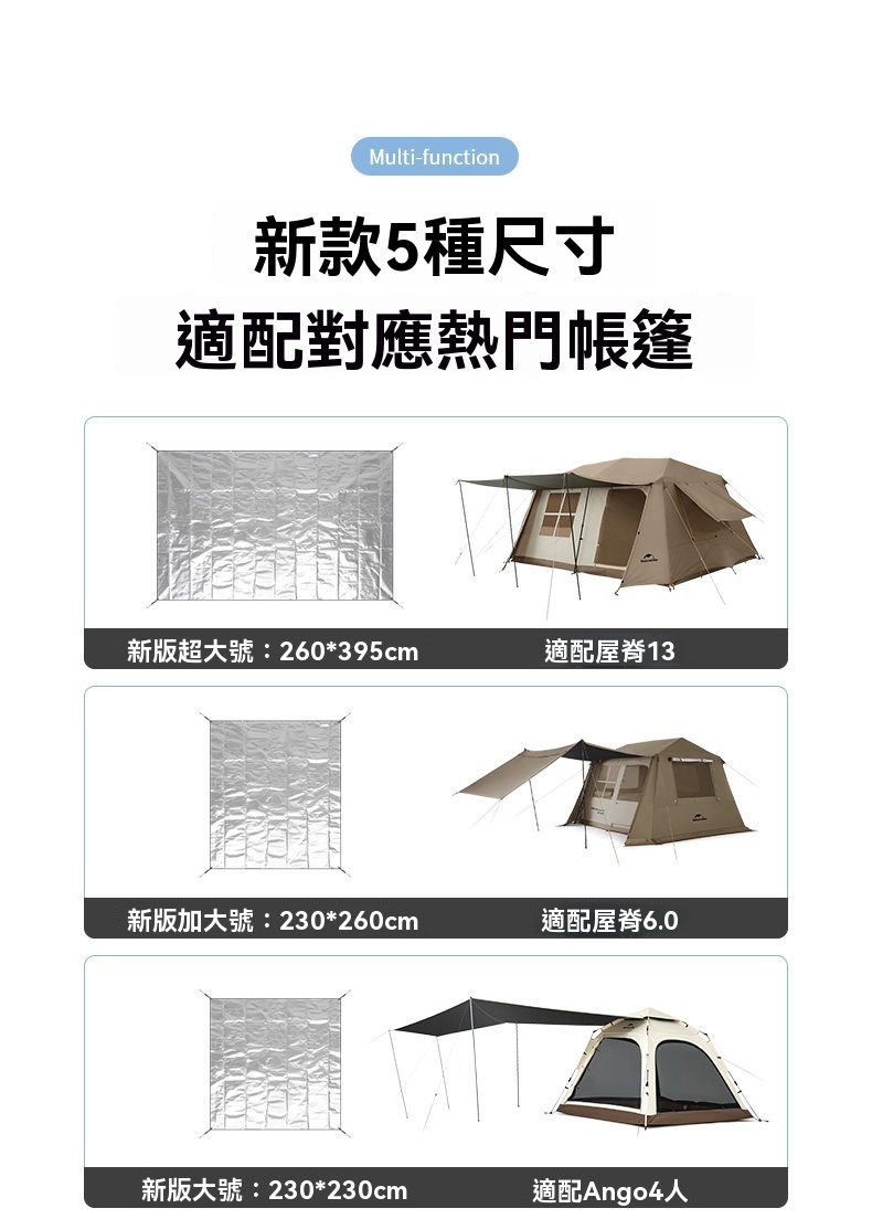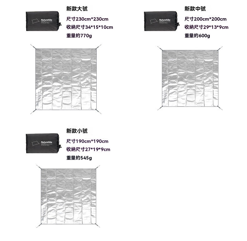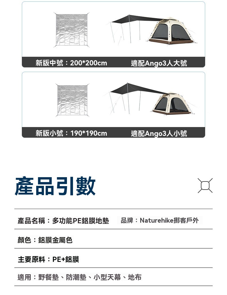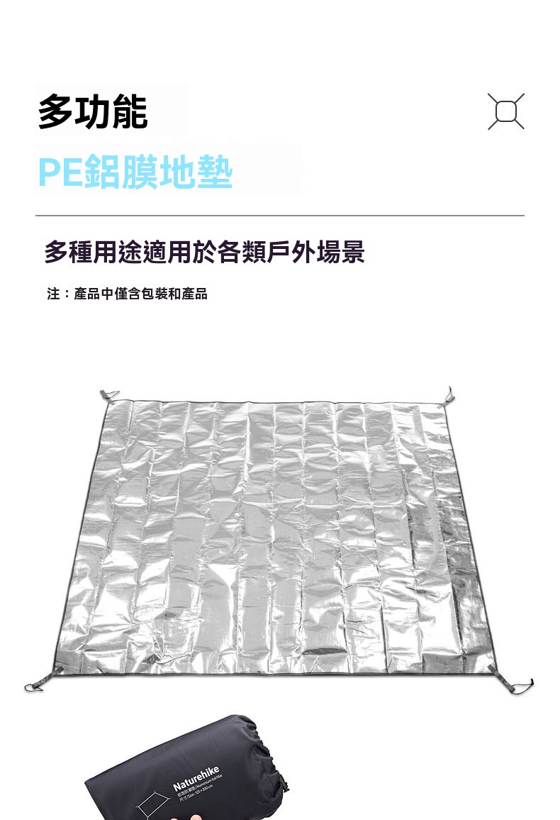 Naturehike 多功能PE鋁箔防潮野餐墊,採用 PE+鋁膜材質,輕量防潮,一墊多用。不僅可作為野餐墊、防潮墊使用,亦可簡易搭建成小天幕,適合各種戶外場景。提供多種尺寸,專為熱門帳篷型號設計,輕鬆搭配、收納方便,是您戶外活動的實用伴侶。