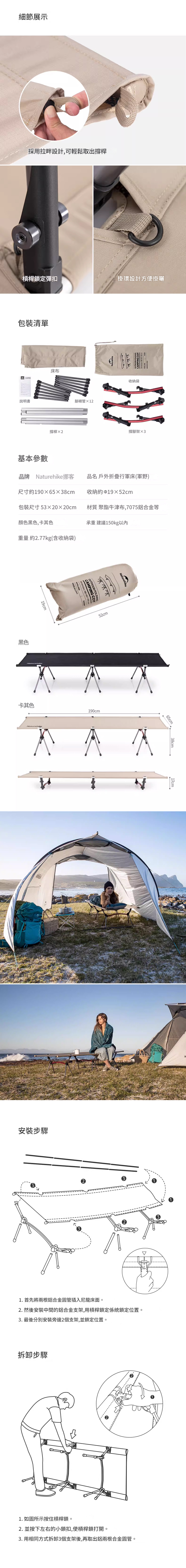 Naturehike Q-9E XJC04 超輕量折疊露營床,採用輕量7075鋁合金支架與三角穩定結構,提供高低兩用模式,承重穩固可達150kg。摺疊設計便於收納,搭配透氣牛津布床面,適合露營、戶外休閒等場景,安裝快速,攜帶方便。