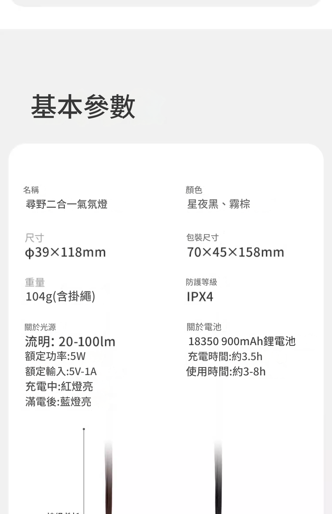 • 雙光源多檔位:提供暖光氛圍與白光照明,各具兩檔亮度,一鍵切換並支援雙擊爆閃。