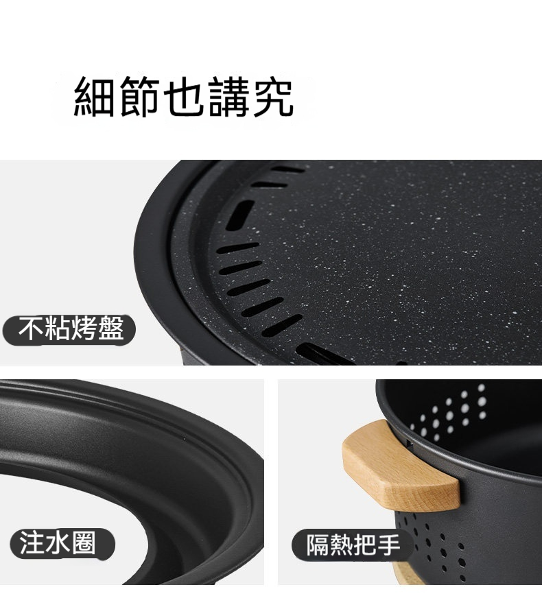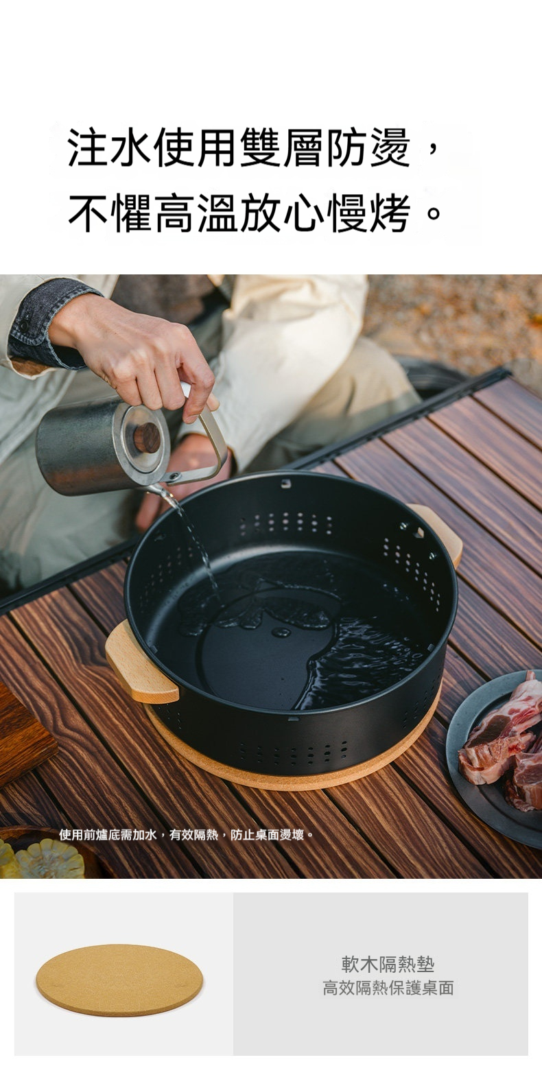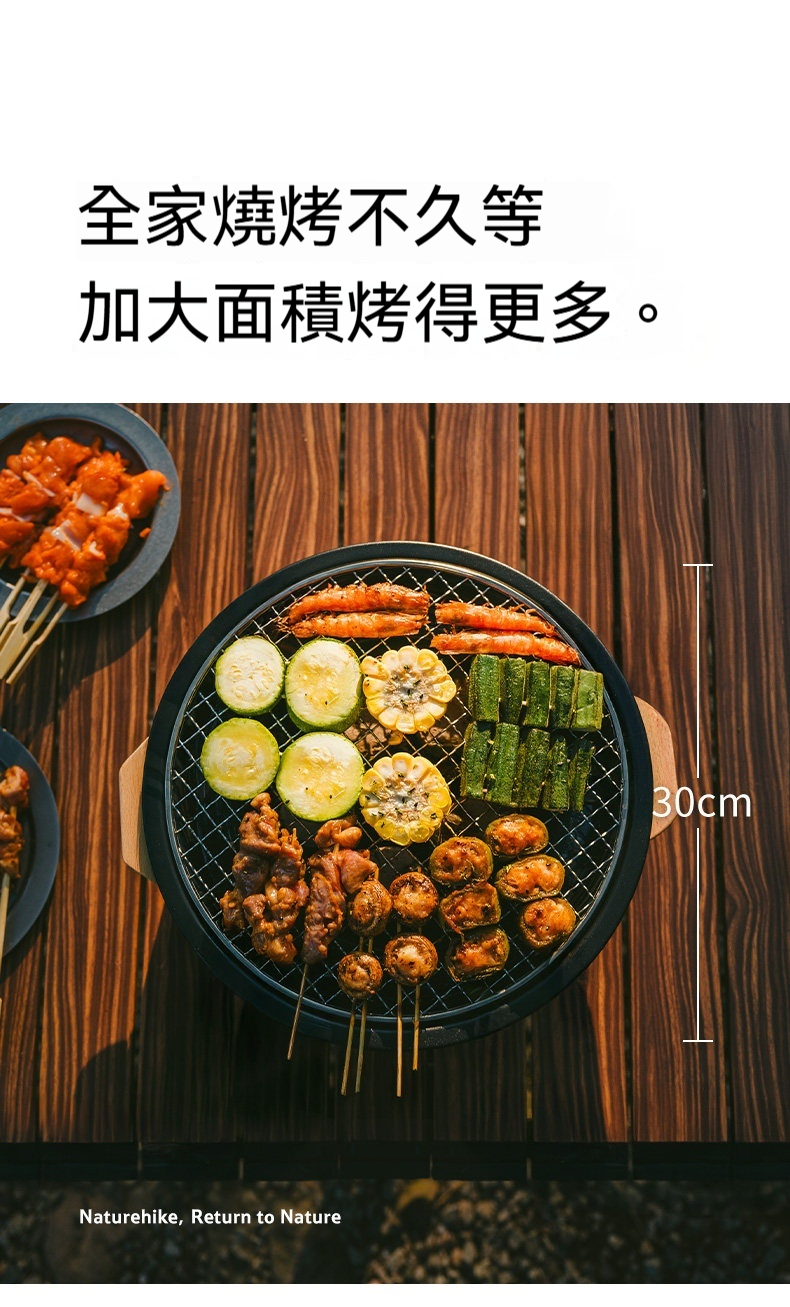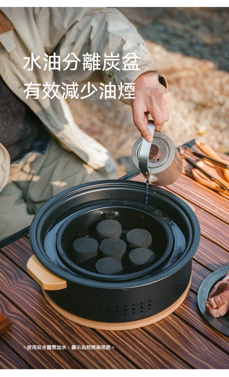 Naturehike 墨煙 · 桌上型圓形燒烤爐,專為戶外慢烤與圍爐煮茶設計。採用實木雙層隔熱提手,握持安全防燙。內建注水式炭盆,實現水油分離,有效減少燒烤油煙。分體式結構搭配食品級烤網或不沾烤盤,拆卸清洗方便。大面積烤盤,輕鬆滿足全家共享,收納簡便,是提升露營氛圍與美食體驗的實用裝備。