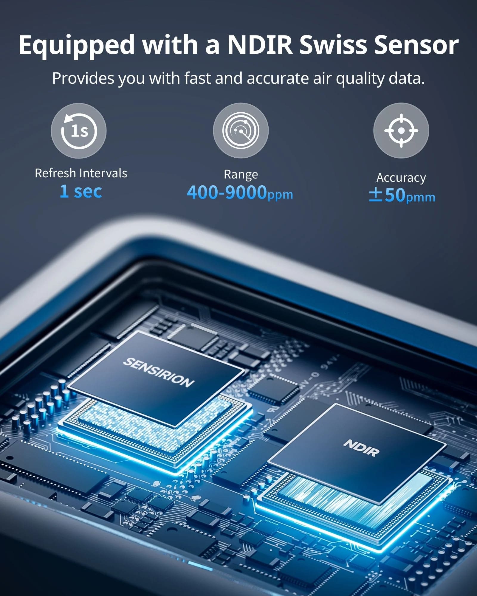 • 瑞士製高精度NDIR傳感器:採用瑞士Sensirion工業級SCD40感測器,每秒提供一次高精度CO₂讀數(電源模式),測量範圍達400-9000 ppm。
