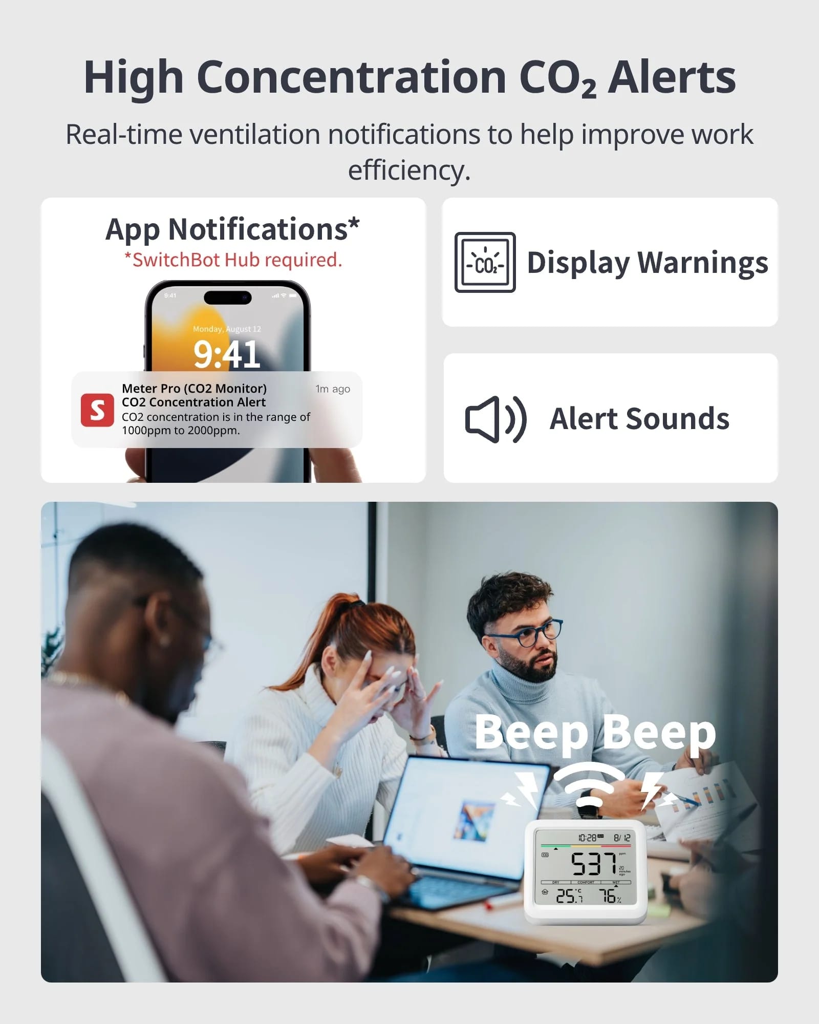 • 可設閾值: CO₂濃度、溫度、濕度