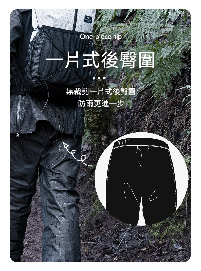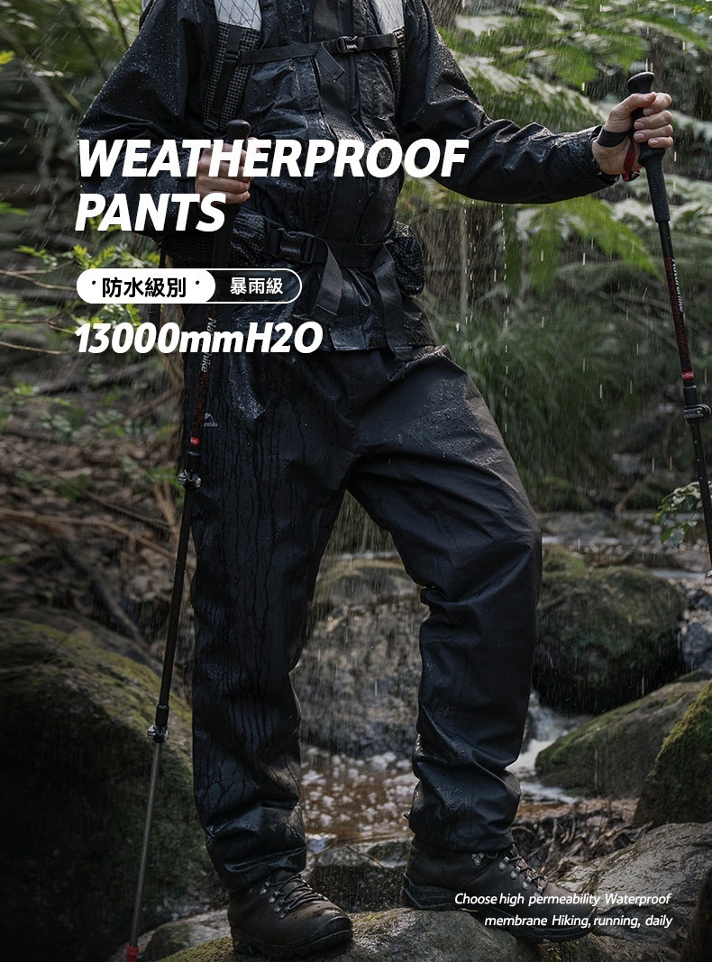 Naturehike 輕量化收納防風雨長褲採用暴雨級防水設計,靜水壓高達13000mmH20,同時透濕量超過9000g/M²/24HR,確保防水透氣。材質為100%聚酯纖維,配備PU高透防水膜和接縫壓膠,增強防護。一片式後臀圍和一體式收納口袋設計,收納小巧,重量輕盈。適合徒步、登山、露營等多種戶外活動,日常搭配亦佳。