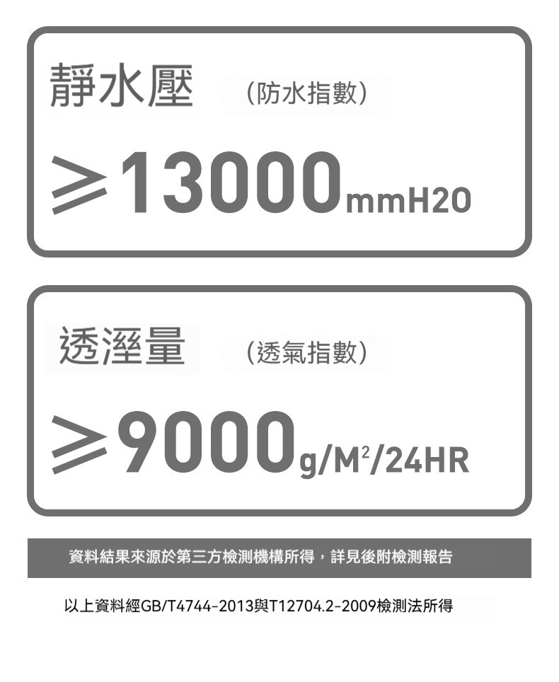 • 暴雨級防水,靜水壓 ≥13000mmH20