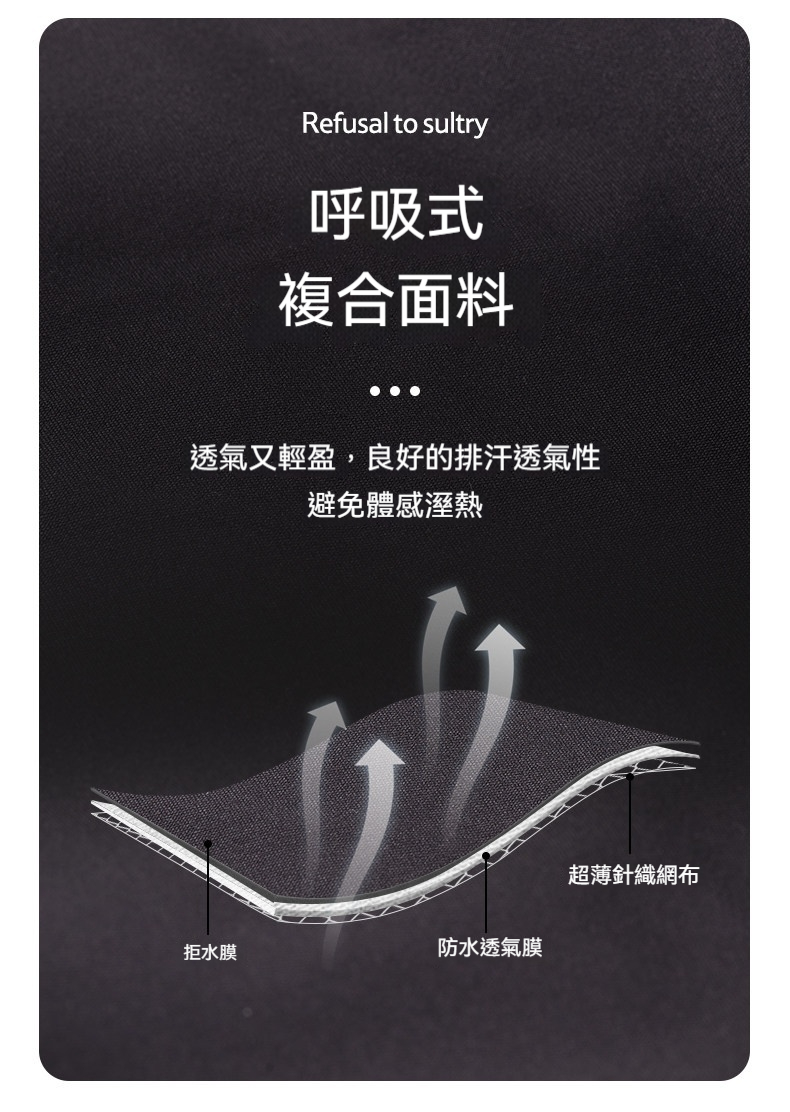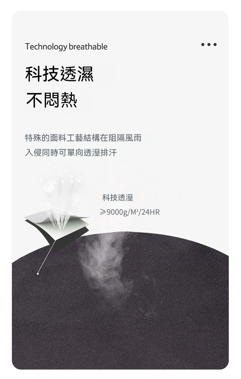 • 高透氣性,透濕量 ≥9000g/M²/24HR