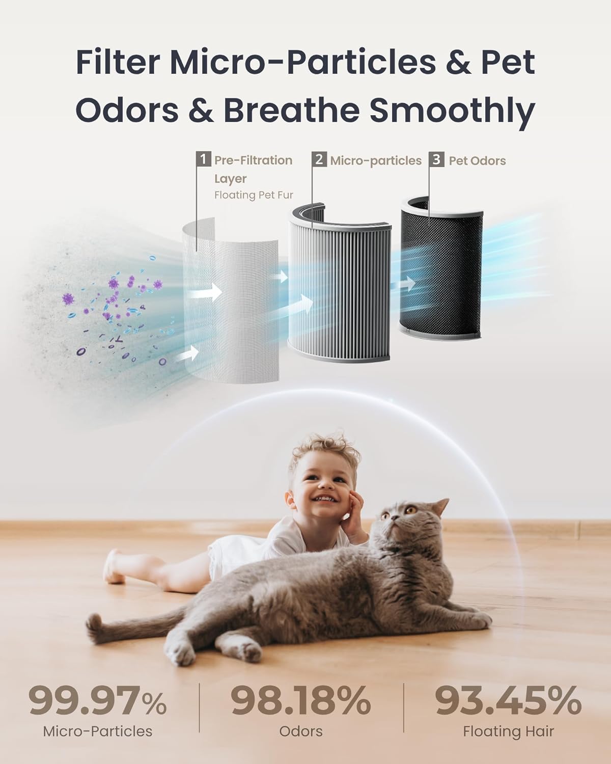• 3 階段過濾:可水洗預過濾器、True HEPA 過濾器和活性炭層,用於異味。