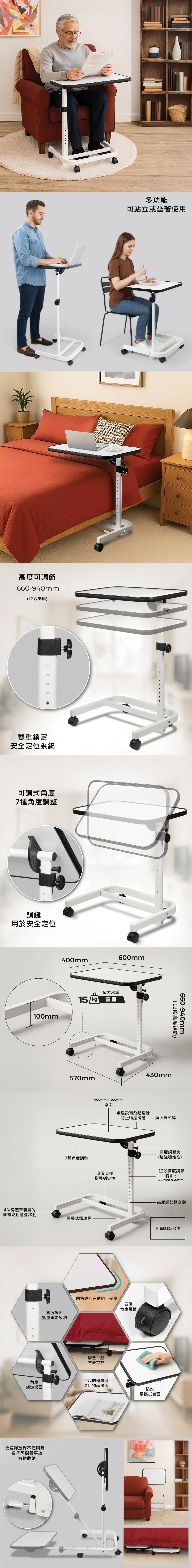 這款Aidapt愛意達豪華多功能移動桌子專為追求靈活生活的人士設計,無論是卧床休養、輪椅使用或在沙發上放鬆,都能輕鬆調整至理想位置。桌面高度可於660至940毫米間作12段調節,並設有7段傾斜角度,配合防滑凸邊,使用更安心。穩固的實心鋼製底座配合帶煞車萬向輪,移動順暢固定可靠;折疊後僅厚120毫米,易於收納。輕巧便攜,簡易安裝,是工作、用餐與休閒的理想夥伴。