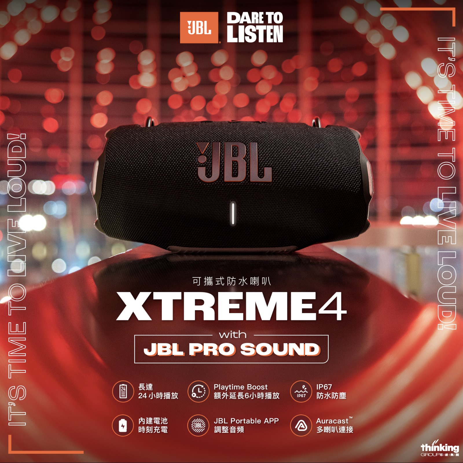 JBL Xtreme 4 是一款專為戶外冒險與派對而生的便攜式防水藍牙喇叭。它搭載強勁的 JBL Pro Sound 音效,提供清晰動態的雄厚音場,並內建 AI Sound Boost 人工智慧音效強化功能,能即時分析訊號以激發驅動單元的最佳潛能。其 IP67 等級的防水防塵能力,讓您無論在泳池邊或海灘上都能安心使用。電池續航力長達 24 小時,開啟 Playtime Boost 功能更可延長至 30 小時,且支援快速充電(充電 10 分鐘即可播放 2 小時),還可透過內建行動電源為其他裝置充電。喇叭具備可更換式電池設計,並附有方便的肩帶,讓您輕鬆攜帶。您還可透過 JBL Portable 應用程式自訂 EQ,或使用 Auracast™ 功能連接多個喇叭,打造更廣闊的立體聲場。